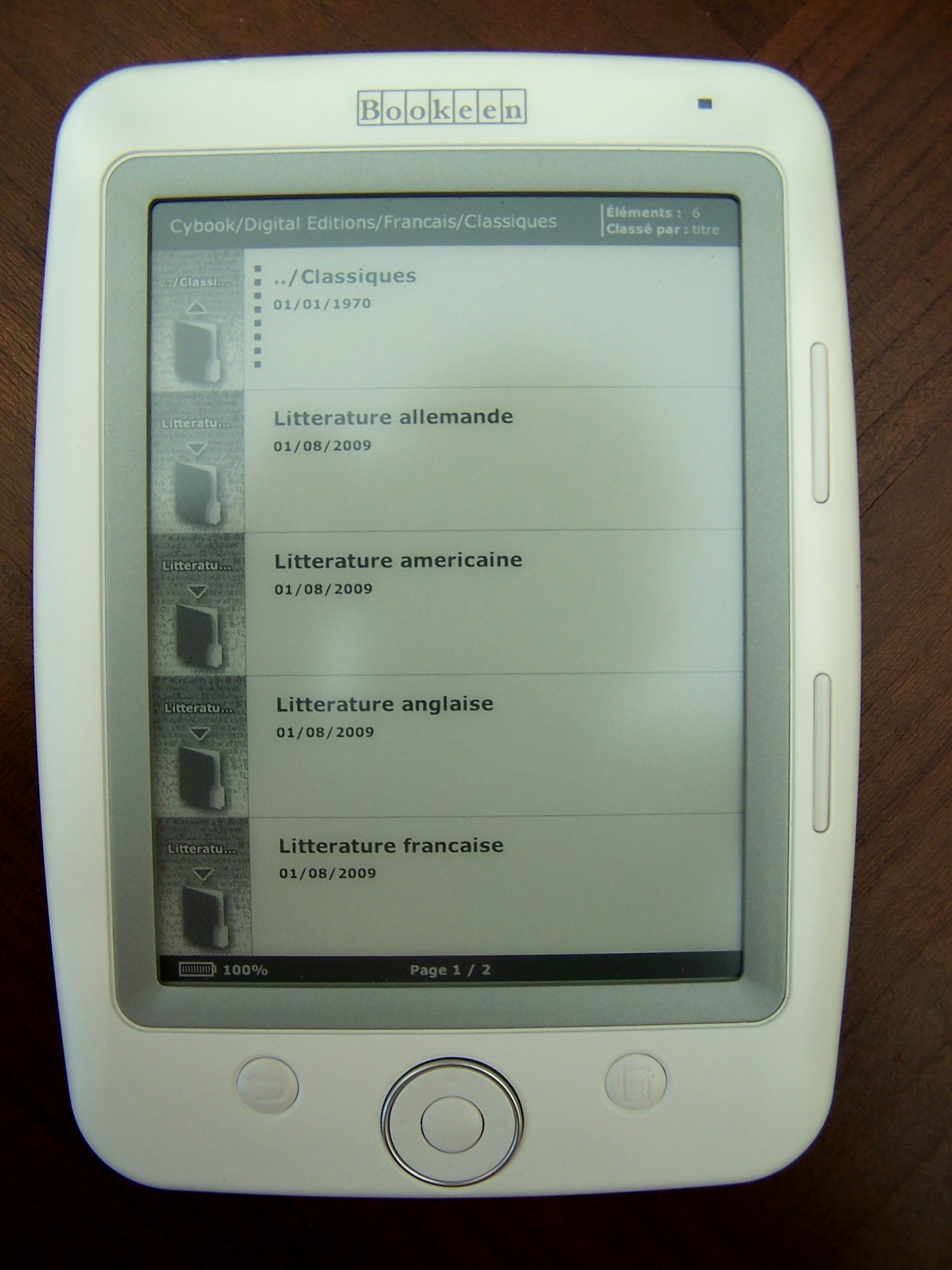 Le Cybook Opus présente les dossiers, les sous-dossiers, navigation très intuitive et simple avec les trois boutons. Le bouton central (haut, bas, avant, arrière, validation au milieu), un bouton à gauche pour revenir à la bibliothèque à tout moment, un bouton à droite pour définir les paramètres du lecteur. Pas plus simple. Les deux boutons allongés sur le côté complètent les touches avant et
