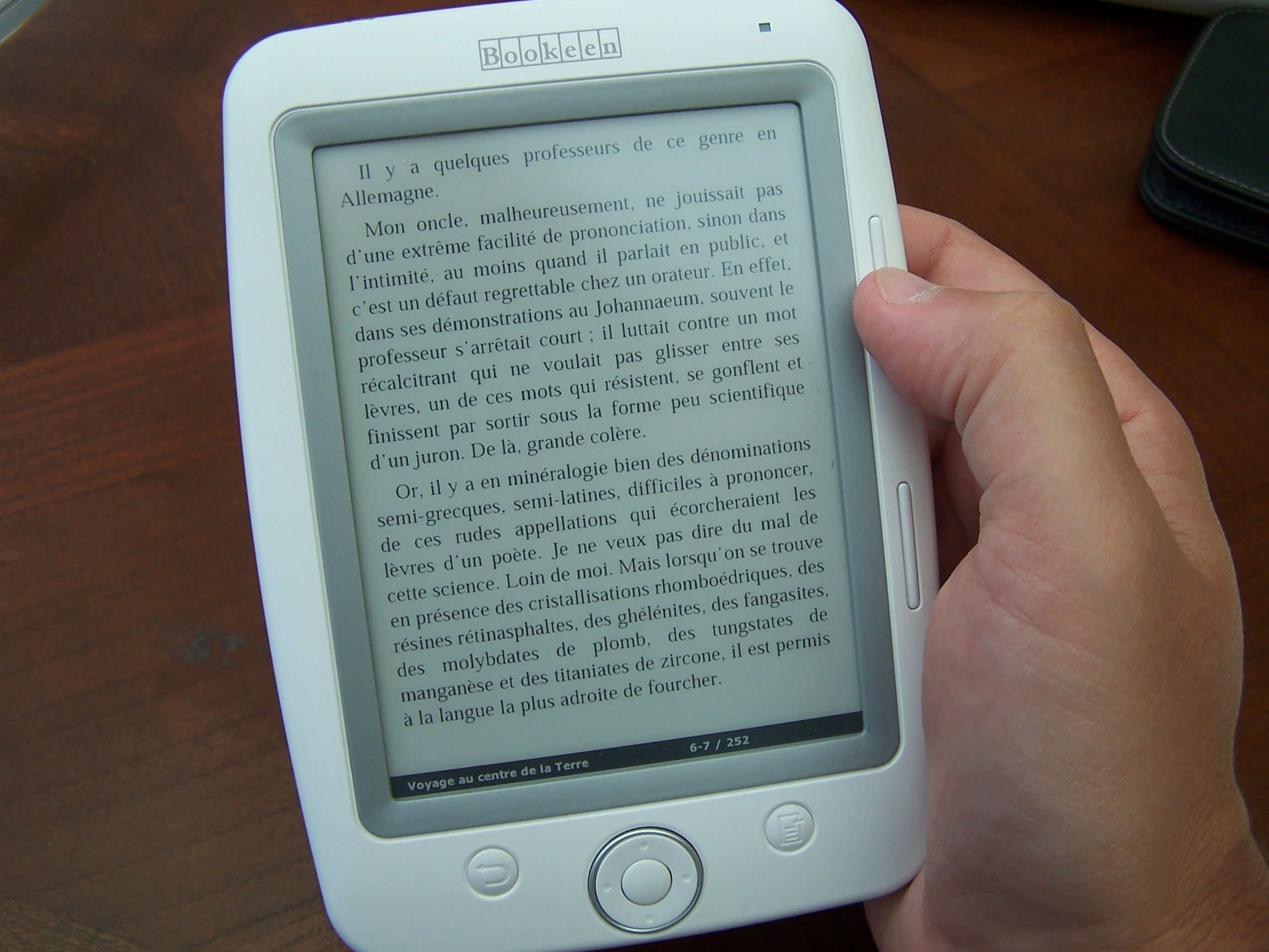 arrière avec la main droite si on le souhaite. Bref, en deux minutes, on a assimilé le fonctionnement et la navigation de lecture. Affichage rapide, les pages montent rapidement y compris pour les pages pdf, avec des fichiers lourds. Bookeen a grandement amélioré le processus. La présence d'un accéléromètre bascule automatiquement les pages quand vous basculez le lecteur. "C'est comme l'Ipod" me dit ma fille... Elle cherche à appuyer sur l'écran avec son doigt. "Cherche pas, ça viendra plus tard!".