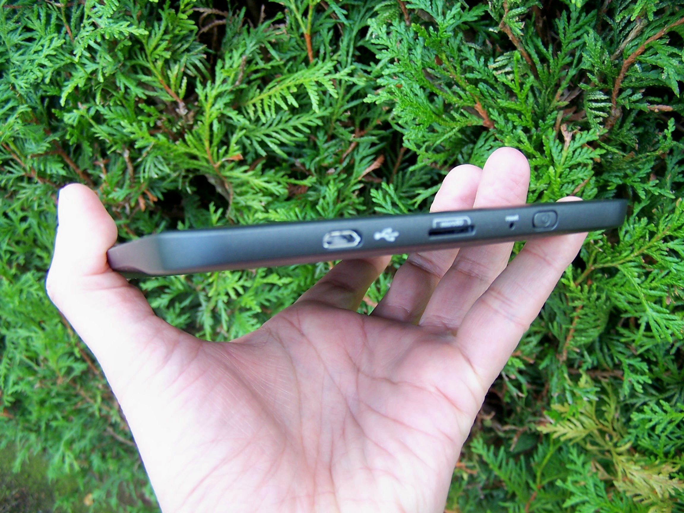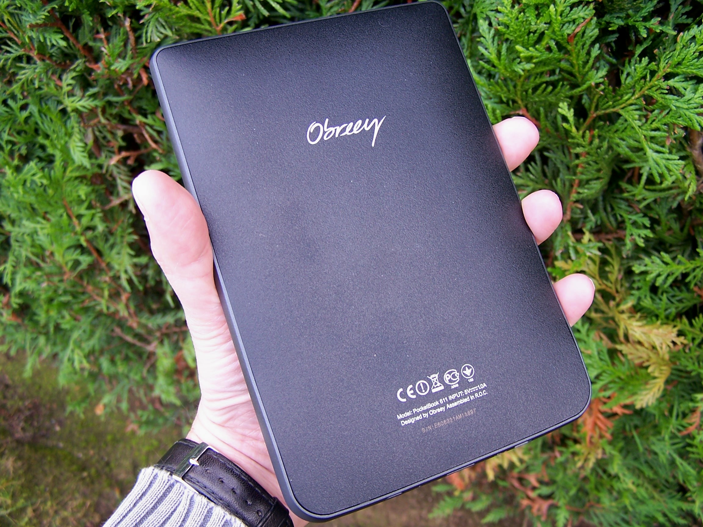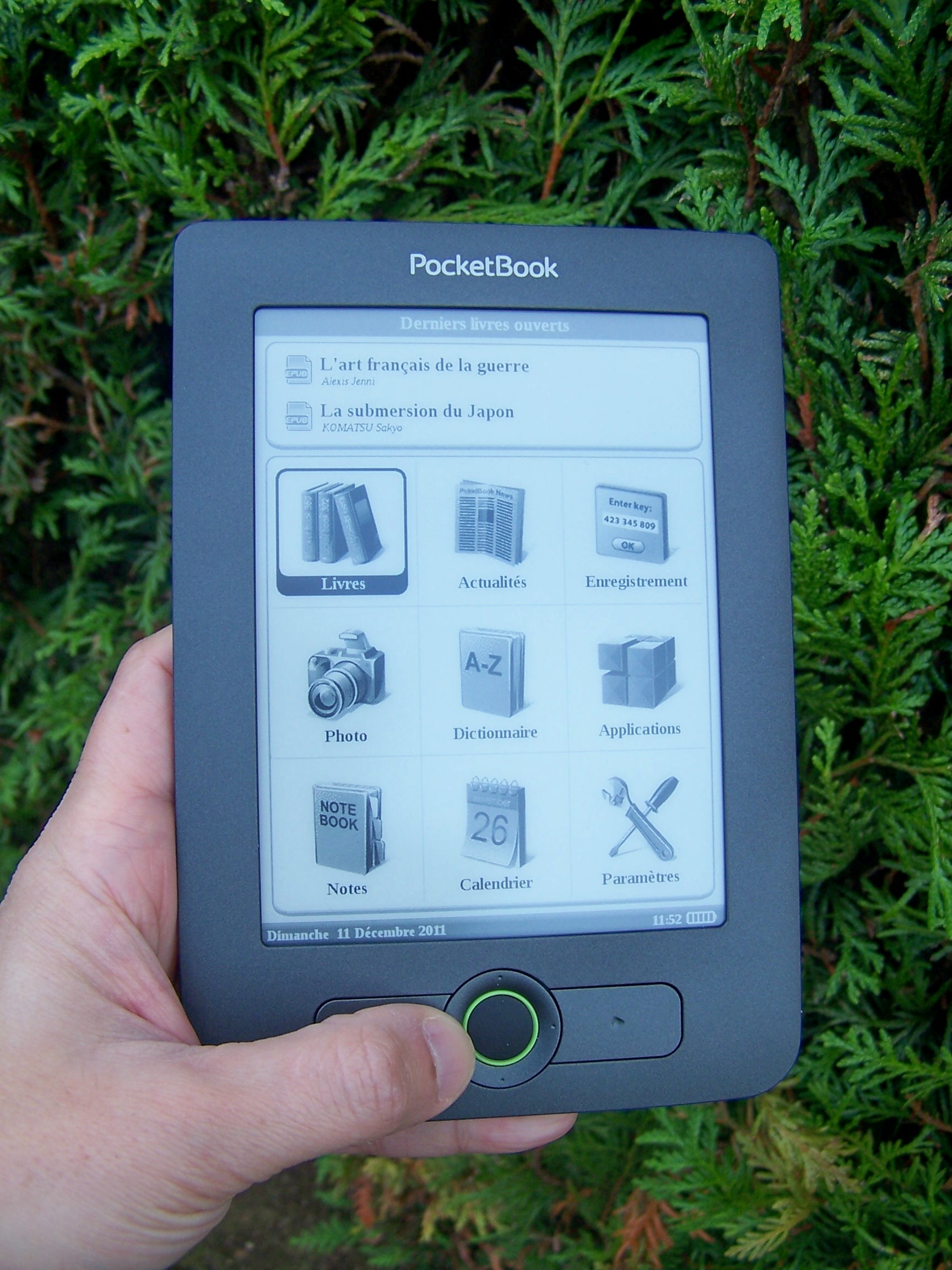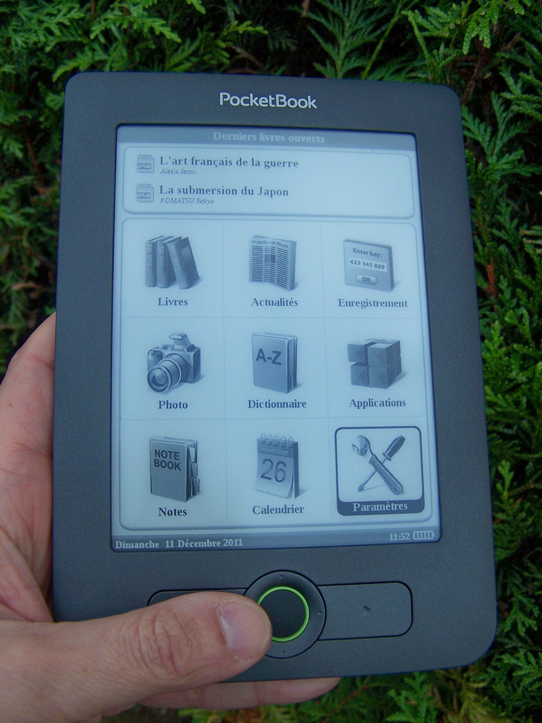 Prise en main: Ecran 6 pouces Vizplex, la qualité juste en deçà du Pearl chez eInk. Même si le fond est légèrement moins blanc, l'écart reste relativement peu important, il faut bien le dire. Un très bon contraste. Le Vizplex a lui aussi connu une évolution chez eInk. Le design de ce modèle est très réussi, tout en arrondi, sobre. Première chose qui frappe à la prise en main, c'est sa légèreté et sa finesse. Plus d'alus donc mais les plastiques retenus sont très soignés. Même s'ils sont moins flatteurs au touché que les soft touch du Kobo ou du Nook, la qualité est au rendez-vous. C'est sans doute aussi un lecteur qui résistera plus dans le temps, j'ai quelques doutes sur les surfaces soft touch qui me semblent vieillir prématurément à l'usage. Pas de traces de doigts non plus ici puisque la surface est mat. Un très bon point. J'ai absolument horreur des traces de doigts, certains modèles noirs brillants me semblent toujours d'une incongruité absolue. Pas de tactile sur ce modèle, PocketBook pour ce lecteur 6 pouces premier prix a fait le même choix qu'Amazon avec son Kindle. Le PocketBook 611 dispose de trois boutons en bas. Un bouton multidirectionnel au centre, des boutons avant-arrière de chaque côté. Au début j'avais quelques doutes sur le bouton central qui me paraissait un peu trop enfoncé, mais non à l'usage, c'est très bien. On oublie très rapidement l'absence de tactile. Le bouton multi-directionnel est très fonctionnel, très souple. Un grand bémol cependant, c'est l'absence de boutons lattéraux pour tourner les pages d'une main. Comme il n'y a pas de tactile, il faut absolument, soit utiliser son autre main, soit tenir le lecteur en bas. A l'usage, c'est vrai que c'est un peu contrayant. En bas aussi l'allumage du lecteur, ce n'est pas très pratique non plus dommage. Autre choix encorei, la diode qui s'allume quand le lecteur travaille, placée sous le bouton du milieu. Certains apprécieront peut-être. Personnellement je ne suis pas très fan de ce genre de gadget superficiel qui doit inévitablement tirer sur la batterie et que je juge assez superflu. Très envie de le désactiver. Certains fabricants ont optés pour des témoins graphiques sur l'écran qui affichent l'attente de manière discrète, personnellement je préfère.