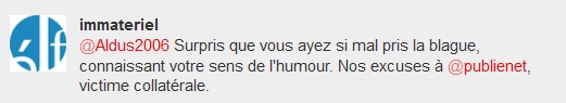 Message d'Immatériel sur twitter, ils font des "blagues" avec les adresses IP des clients. Et ils embarquent l'ami François Bon, victime malgré lui, dans l'aventure. Mes excuses à toi François. On s'amuse bien chez Immatériel. Pas un seul mot d'excuses. De la part d'un distributeur numérique professionnel, chacun appréciera le procédé...