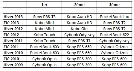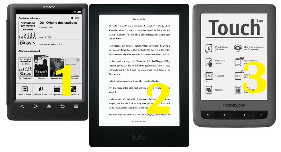 Rendez-vous traditionnel deux fois dans l'année début juillet et début décembre, c'est le moment de vous donner mon tiercé des meilleures liseuses/ livres électroniques. Pour cette fin d'année 2013, le choix est encore très difficile tant les modèles sont finalement très proches les uns des autres aujourd'hui. Un marché des liseuses plus que jamais mature et dynamique qui séduisent plus que jamais les lecteurs, n'en déplaise à certains grincheux qui voudraient les remiser. Le Kobo Mini n'est plus disponible en France, il quitte mon podium. Après mûre réflexion, c'est le Sony PRS-T3 qui monte sur la plus haute marche. Un Kobo Aura HD déjà remarqué au début de l'été en deuxième position et un nouveau PocketBook Touch Lux qui arrive solidement en troisième position. Explications:
