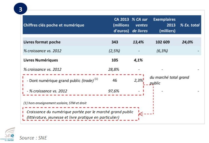 Moment attendu aujourd'hui avec l'assemblée générale du SNE (Syndicat National de l'Edition). Sur un marché du livre en repli en volume comme en valeur de 3%, le livre numérique fait figure de relais de croissance. Il a représenté l’année dernière 105 millions d’euros de chiffre d’affaires pour les éditeurs, soit quasiment le marché de la cession de droits (128 millions d’euros). Un pourcentage par rapport à la totalité du marché de 4,1%, 2,3% si l'on considère le seul marché du trade/ grand public. Ce dernier secteur aura quasiment doublé l'année dernière. Pas de raz de marée, mais un secteur qui s'installe dans le paysage éditorial, c'est désormais 13% des ventes de poches. Selon le SNE, le pourcentage des livres numériques dans les références grand public s’établit aujourd’hui entre 5 et 7%. Le document complet est ici. On retrouvera également un panorama complet de l'édition sur le site du SNE.