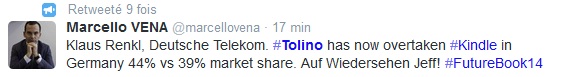 Le Tolino n'en finit pas de séduire nos amis allemands. Lors de la conférence FutureBook14 à Londres aujourd'hui, Klaus Renkl de Deutsche Telekom va même jusqu'à affirmer que Tolino aurait doublé la part de marché du Kindle outre-Rhin, 44% contre 39% à Amazon. Ce serait une véritable première en Europe et dans le monde. Cela prouve une nouvelle fois la pertinence d'un partenariat entre un opérateur comme DT et des chaines de distribution locales importantes. Cela autour de liseuses de qualité aptes à concurrencer les Kindle. De quoi bien inaugurer le déploiement de Tolino dans d'autres pays en Europe. Lire les billets sur TheBookSeller et Buchreport.