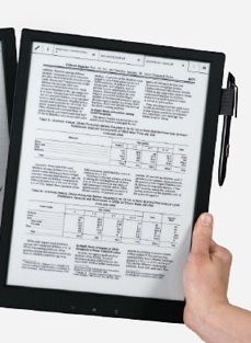 En même temps que son annonce de joint-venture avec EInk, Sony en a profité la semaine dernière pour annoncer un nouveau modèle de lecteur en grand format 13,3 pouces (1650 x 2200 pixels), le Sony DT-RP1. En ligne de mire, tous les documents au format PDF que nous récupérons sur notre ordinateur, à importer facilement sur un lecteur pour lire avec le confort et l'autonomie de l'encre électronique, l'annotation en plus en toute simplicité. Les élements clés sont la réactivité, le confort d'utilisation et la facilité pour importer et exporter les documents. Une première vidéo très intéressante est apparue. Sony annonce une disponibilité début juin sur le seul marché japonais pour l'instant, avec un prix à 700$. A surveiller de très près, nous savons tous que ce type de lecteur nous l'attendons tous demain dans le milieu professionnel et éducatif, c'est une certitude. Est-ce que ce modèle sera enfin le bon pour le démarrage, un modèle noir avant la couleur qu'il faudra sans doute attendre encore longtemps? (via GoodeReader).