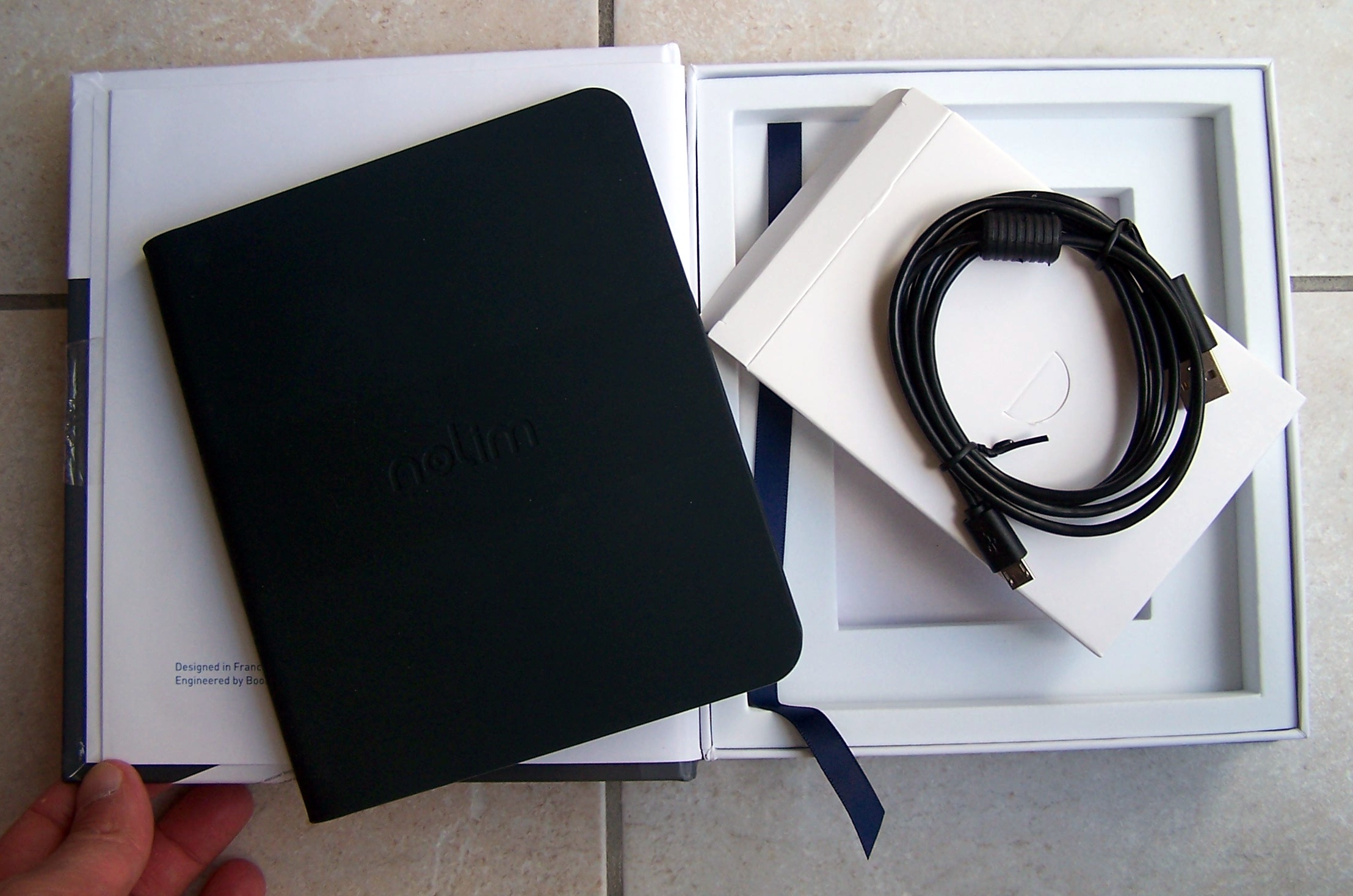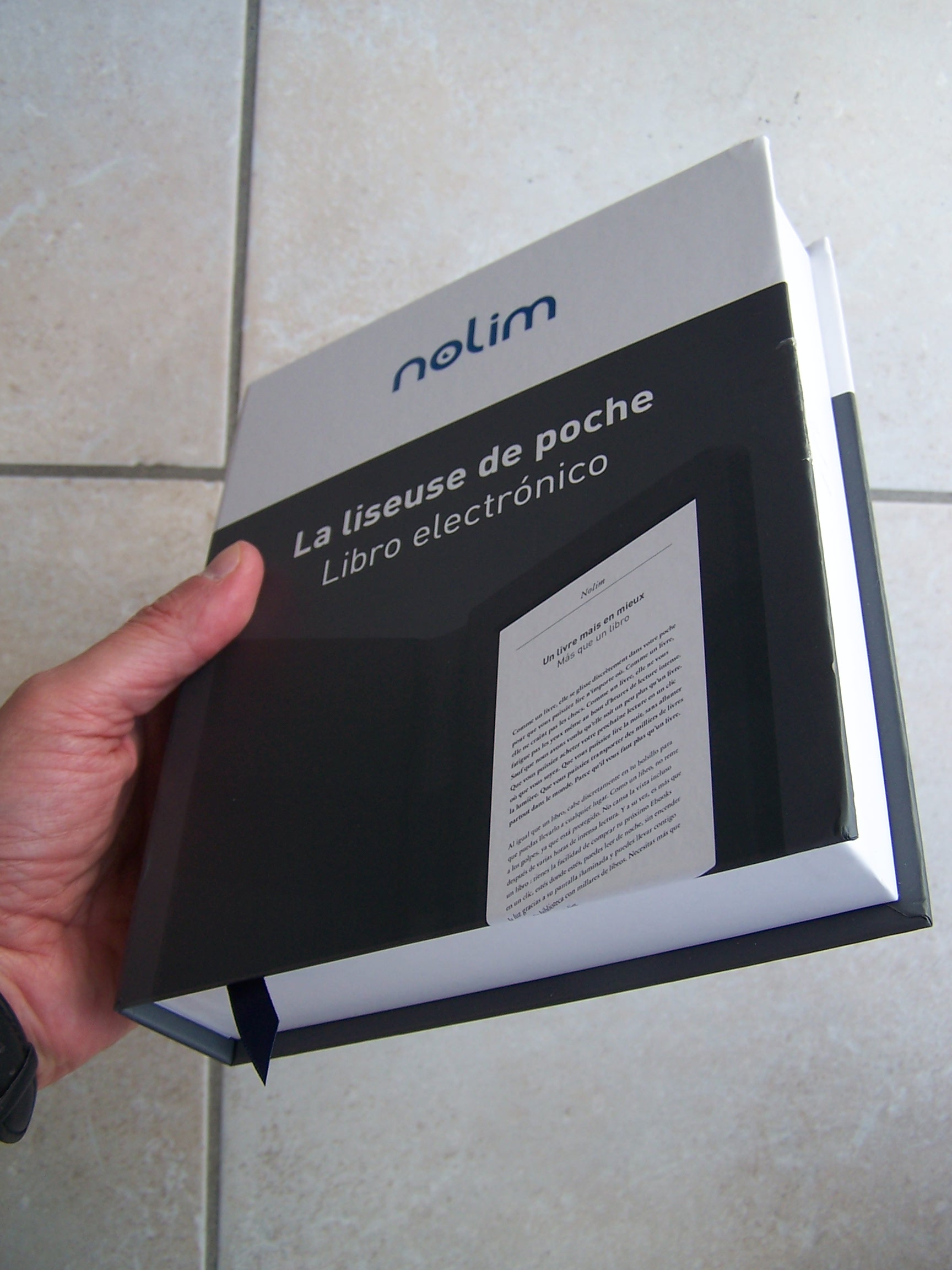 Prise en main: Côté packaging, il est particulièrment soigné. Plutôt que de proposer une simple boite cloche, Nolim développe aussi son concept avec la proximité du livre. Un faux-livre bien réalisé, agréable à offrir, que vous pourrez ranger en bibliothèque. Six pages à l'ouverture qui présentent la liseuse et donnent un rapide mode d'emploi. Il y a même un très joli signet qui donne une petite note élégante, compliments. La liseuse et l'inévitable petit cable usb en dessous dans une petite poche cartonnée séparée. Sans faute.