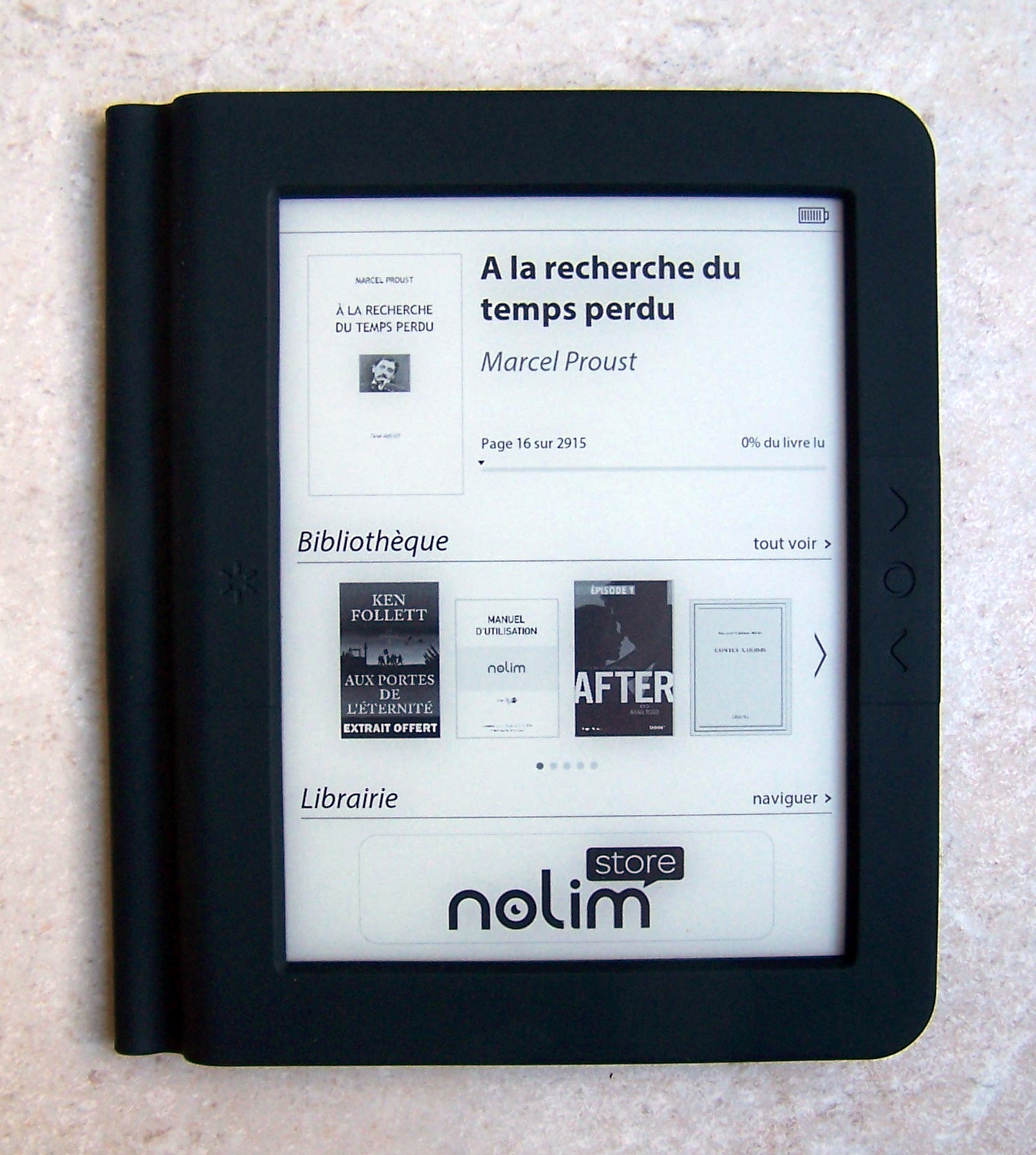 Navigation: Bookeen avait revu complètement son interface de navigation l'année dernière. Cette Nolim Edition 2017 en bénéficie sans aucune concession, tout complet, j'ai vérifié. C'est bien sûr l'avantage de Nolim de capitaliser sur l'expérience de Bookeen en la matière. L'ensemble est très intuitif. Dernier livre ouvert en haut, la bibliothèque dans le milieu de l'écran que l'on peut faire défiler, une librairie Nolim -strictement équivalente à celle de Bookeen-, disponible en bas de l'écran à laquelle on pourra accéder facilement avec l'accès wifi pour acheter des livres. Côté rapidité, ouverture des livres et défilement des pages excellents. Les mises à jours ont été faites par Bookeen, les petits défauts récurrents que j'avais repéré dans mon test du Cybook Muse Frontlight ont été rectifiés. Les choix typographiques sont bons mais pas très étendus, dommage. L'ensemble des paramètres de réglages typographiques sont concentrés sur une même page très claire. Beaucoup de précisions possibles dans ces choix. La police Caecilia a malheusement disparu, c'est dommage. En revanche, j'ai beaucoup apprécié que Bookeen ait crée un dossier Fonts que vous découvrirez directement sur votre ordinateur en la branchant avec le cordon. Vous pourrez ainsi très facilement ajouter des polices supplémentaires si vous le souhaitez (les indispensables CharisSIL, Caecilia et d'autres); revoir mes billets sur le sujet. Pour grossir les caractères, vous pourrez utiliser deux doigts sur l'écran (pinch and zoom), une option très pratique que l'on ne retrouve pas chez Kobo. Côté dictionnaires, le Littré moderne est intégré ainsi que de très nombreux autres dictionnaires au choix. Dommage que la définition n'apparaisse pas tout de suite mais à l'ouverture d'une interface en cliquant sur le mot puis une nouvelle fois pour afficher la définition. C'est beaucoup. Pour d'autres dictionnaires, comme sur la Muse il suffit de créer un dossier "Dictionaries" à la racine de la liseuse sur l'odinateur, dans lequel on glissera des dicos ou traducteurs (la manip et des liens sont consultables sur le blog de Bookeen). Pas grand chose à dire sur la gestion des surlignages et des annotations qui reste classiques avec des menus. J'aime beaucoup la gestion de la bibliothèque chez Bookeen. Des statisques sympas sont proposées également sur le livre que l''on est en train de lire avant le retour à l'accueil. Petit bémol, j'ai cherché vainement l'indication de charge de la batterie dans les menus. Une petit icone s'affiche en haut de l'écran avec une indication de charge mais ne donne pas d'indication très précise. Lors de mon test, je n'ai pas observé de baisse de charge anormale de la batterie. Un aspect qui a touché d'autres fabricants sur leurs derniers modèles mais pas Bookeen. Pour lirez de très nombreuses semaines, lumière intégrée ou pas. Un mot aussi, Nolim suit Bookeen sur le respect du format ePub. Des livres du domaine public ou gratuits que vous aurez pu récupérer ailleurs que sur la librairie Nolim (ou même au travers du prêt numérique en bibliothèque par exemple) auront le même traitement à l'ouverture à l'écran. Pas de ségrégation en la matière, pas de frustration à avoir. Côté gestion des PDF, pas grand chose à dire, le minimum syndical mais il présente un intérêt extrêmement limité sur les modèles 6 pouces. Le standard adapté reste fondamentalement l'ePub. Pas d'audio sur ce modèle comme tant d'autres sur le marché. Au final une navigation et une gestion de sa bibliothèque excellente, on a bien du mal à trouver des défauts sur une interface rodée au fil des années.