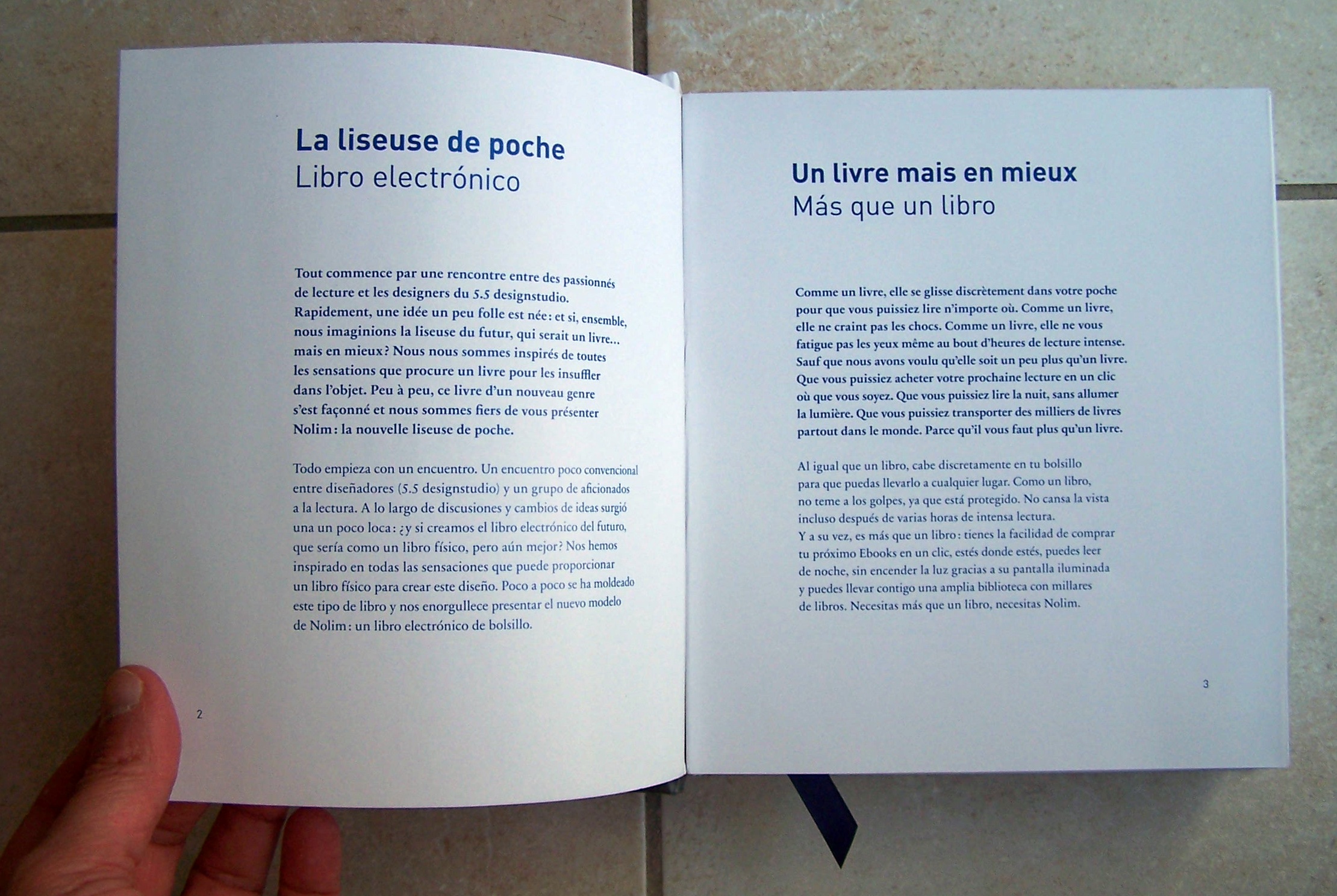 Le concept de la liseuse/couverture était un pari ambitieux, le résultat est particulièrement réussi, on va le voir. Je voudrais revenir sur la proximité entre livre classique et liseuse, revendiquée délibérement par Nolim dans sa communication mais décrié par certains comme s'il s'agissait d'imiter, de "singer" le livre imprimé avec la couverture. Tous ceux qui auront expérimenter un tant soit peu une liseuse au quotidien savent très bien qu'il est absolument indispensable de la protéger d'une façon ou d'une autre. L'accessoire étui/ouverture fait grimper rapidement le budget et se révèle (même avec un design esthétique choisi) plus ou moins pratique à l'usage. Jamais tout à fait satisfaisant bien souvent je dois le dire. L'idée de travailler autour d'une couverture intégrée est particulièrement intéressante. Quel choix? Ouvrir et fermer une couverture qui protège efficacement la liseuse comme un vrai livre, on n'a rien fait de plus pratique au quotidien. En moins de deux secondes, on ouvre, on lit, c'est parti. Il s'agit bien sûr d'avoir un dispositif complet qui s'efface au maximum pour la lecture. Je me rappelle toujours de la réflexion très judicieuse de Philippe Starck fin 2007: "Le meilleur design, pour ce genre de produit, est le moins de design possible. L’intérêt de cet appareil, c’est ce qu’il y a dedans, pas autour. Il faut réaliser un design assez courageux pour s’effacer complètement." C'est le cas ici, à la lettre je dirais. Le cabinet de design a bien travaillé dans cet esprit. Simplicité parfaite de cette couverture moulant la liseuse, évidence de l'objet. Le "pourquoi on le l'a pas fait avant" en filigrane.