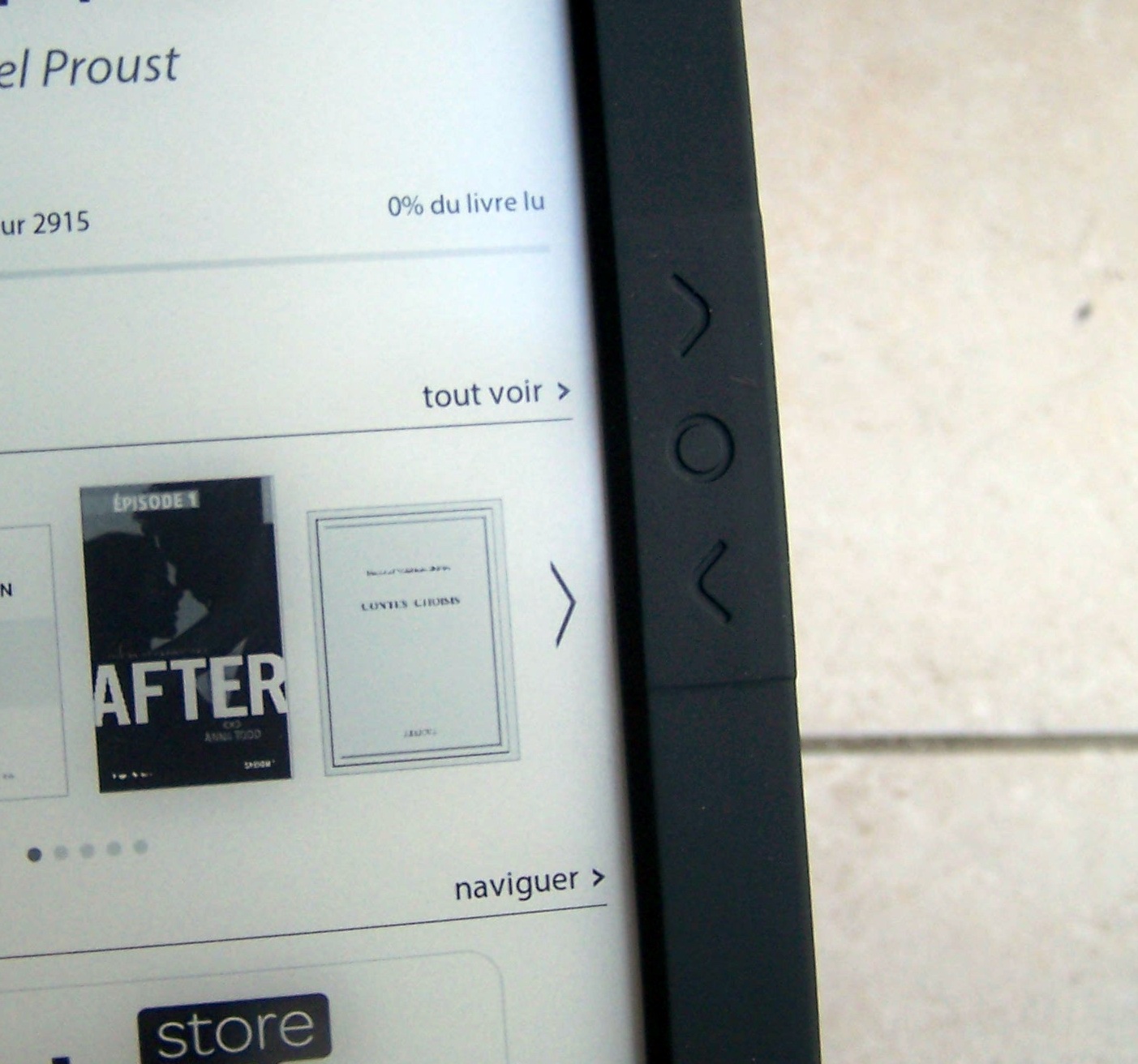 Eclairage intégré: La très bonne idée, c'est d'avoir incorporé un bouton physique, lui aussi dans la masse du silicone. Bien placé à gauche de l'écran, sous le pouce quand on tient la liseuse, et hop. Mais pour les réglages de cette lumière vous me direz? Ils sont bien sûr disponibles dans les paramétrages du menu. Une fois l'intensité choisie, celle-ci est mémorisée pour le bouton. L'éclairage intégré est excellent, encore une très belle surprise. Là aussi, pas de concession, équivalent aux modèles Bookeen. Une lumière parfaitement naturelle dans sa tonalité. La surface de lecture est uniformément éclairée. L'échelle de l'intensité est assez large, une très bonne chose. Les diodes ne sont pas visibles sur les côtés. Un standard qui a beaucoup progressé au fil des années et qui se révèle très performant aujourd'hui. Pas de réglages de la couleur bleue de la lumière comme chez Kobo.