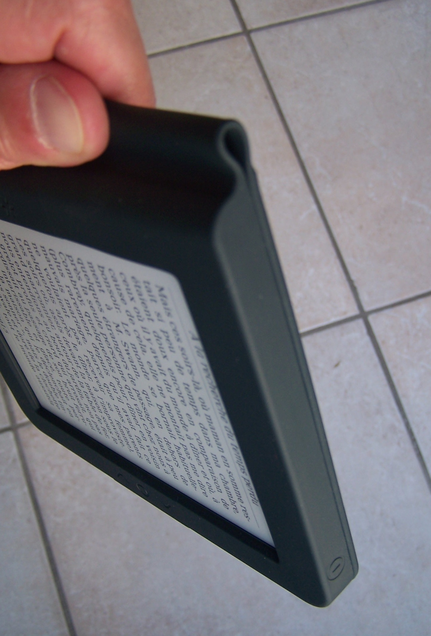 La marque Nolim, emboutie sur le plat de couverture, est très discrète, pas de mention à l'intérieur ni au dos. Bravo. La matière entièrement en solicone (un choix assumé, vous lirez plus bas) est à la fois très agréable au toucher et très souple pour le repli indispensable. Le plat magnétique de la couverture apporte une finition parfaite à la fois fermée ou repliée au dos à la lecture. Coté dimensions, 136 x 159 x 14.8mm. En hauteur, pas de concession, c'est strictement celle des Cybook Muse ou Kobo. En largeur, ouverture de la couverture oblige, c'est un bon centimètre et demi supplémentaire. Un objet plus carré mais qui reste pratique. Légèrement plus épais également pour la coque de protection. Une fois fermée, vous aurez un objet rigide extrèmement résistant en mobilité dans les sacs, avec une pile de journaux pour le train ou en voiture. Pas de drame si elle tombe. Pas d'inquiètude non plus pour l'été. Même si la Nolim n'est pas étanche pour la mettre dans l'eau, avec sa coque et son revêtement intégral elle ne craindra aucune éclaboussure sur les bords de piscine ou à la plage avec du sable. Elle est vendue chez Carrefour mais elle pourrait l'être parfaitement chez Décathlon. Je me suis fait la réflexion que l'on pourrait sans doute rouler dessus en voiture. Un peu idiot sans doute mais vous donne une idée de l'impression de solidité qui s'en dégage.