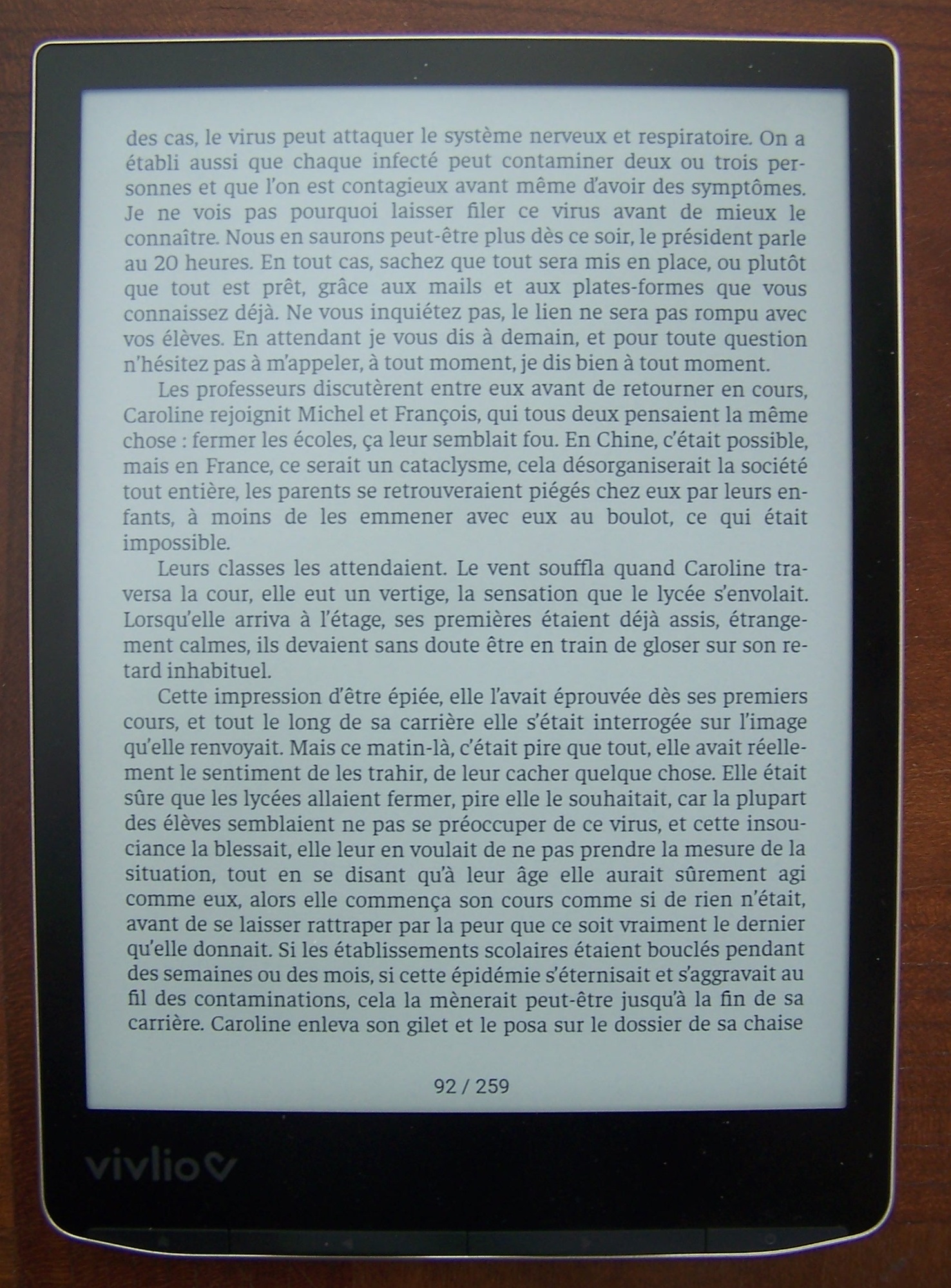Allumage maintenant, avec un bel écran E Ink Carta™ 1200, de 7,8 pouces, avec une résolution de 1404×1872 et 300 PPP. Magnifique écran, un contraste et une définition excellente. Vous savez comme je suis sensible à la qualité de l'écran au fil des années. C'est ce qui se fait de mieux en terme de contraste et de définition. On peut désormais aller sans problème dans des caractères plus fins avec un contraste sans égal. Cette Vivlio InkPad4 est irréprochable, le meilleur standard actuel. D'excellentes sensations, voyons la suite.
