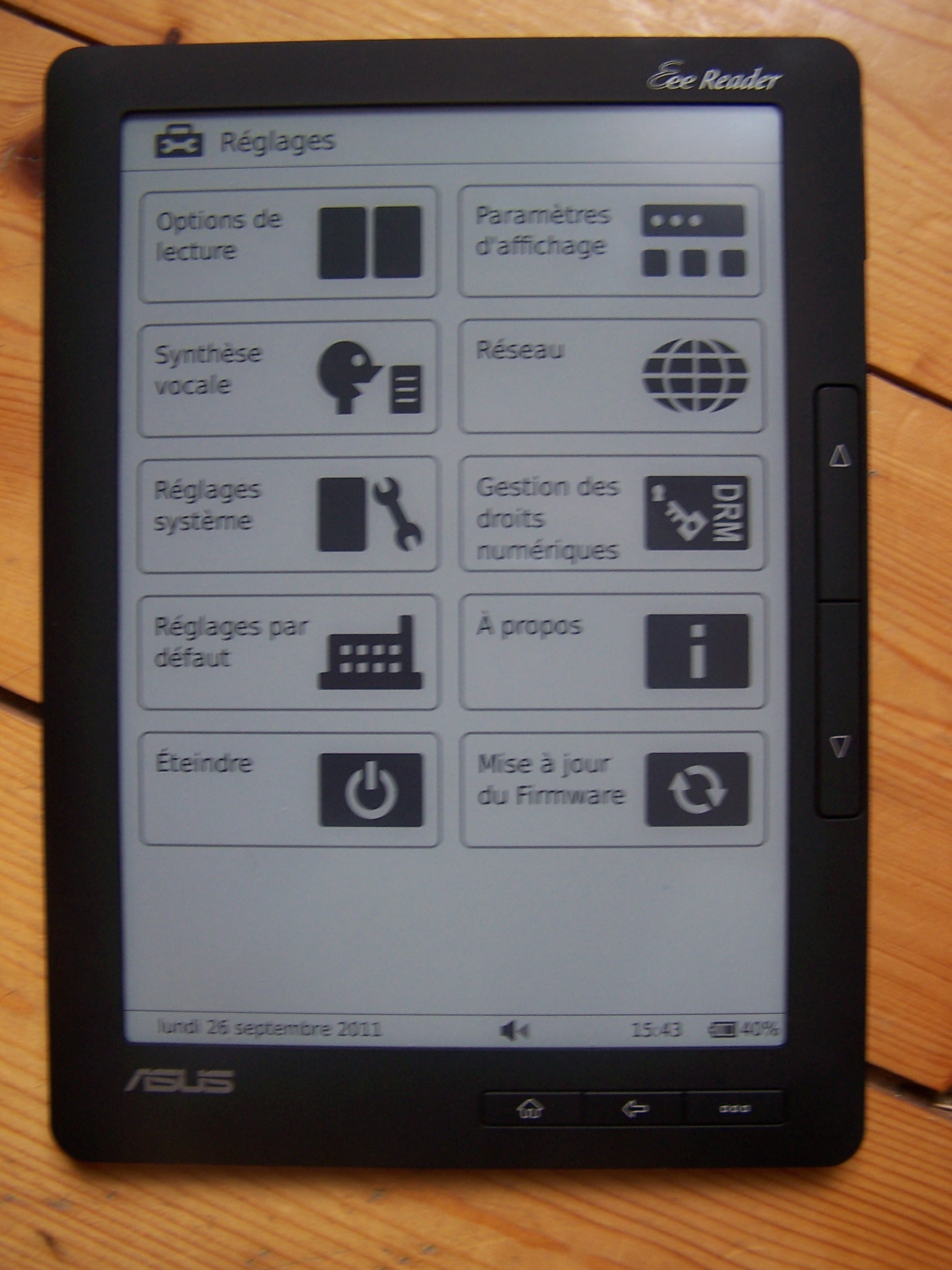 Les premières images sur Flickr du livre électronique DR-950 annoncé par Asus. Un moment décisif de voir un acteur comme Asus, qui a été le grand agitateur du côté des netbooks, entrer sur le marché du papier électronique. Surtout avec un tel modèle grand format! (plus de détails sur Blogeee).