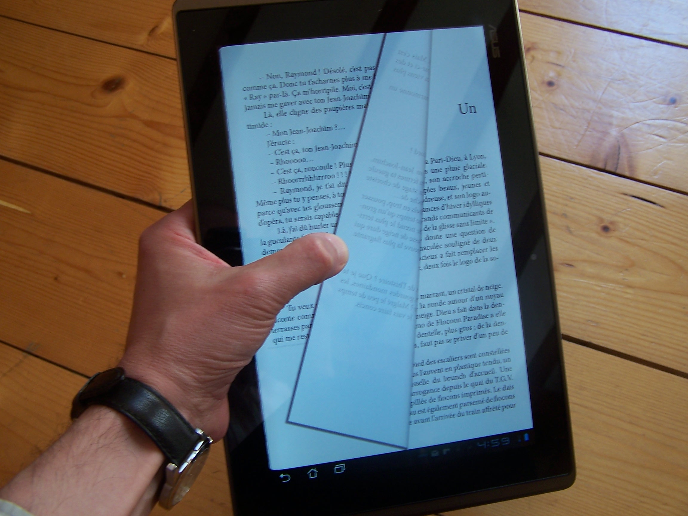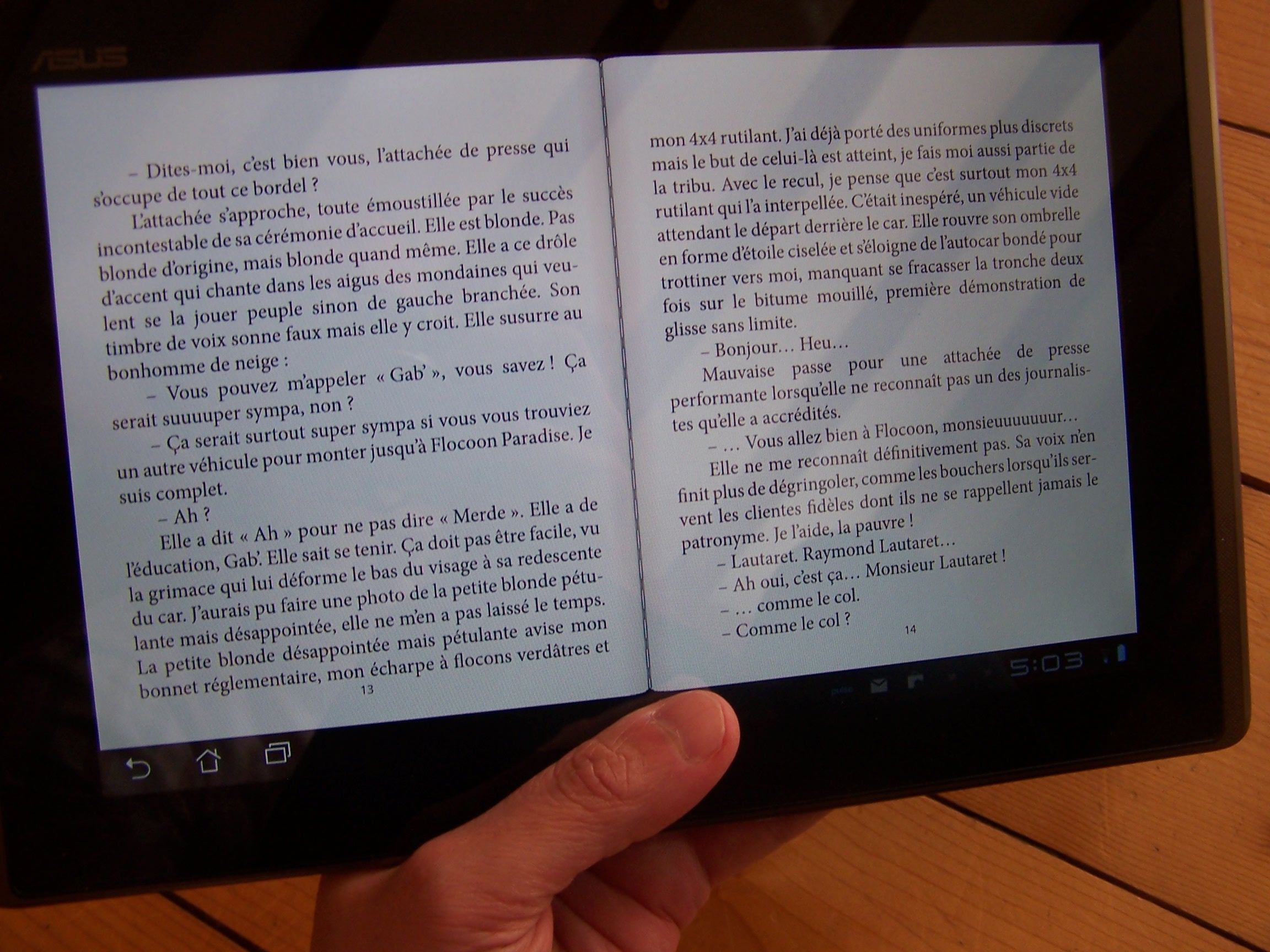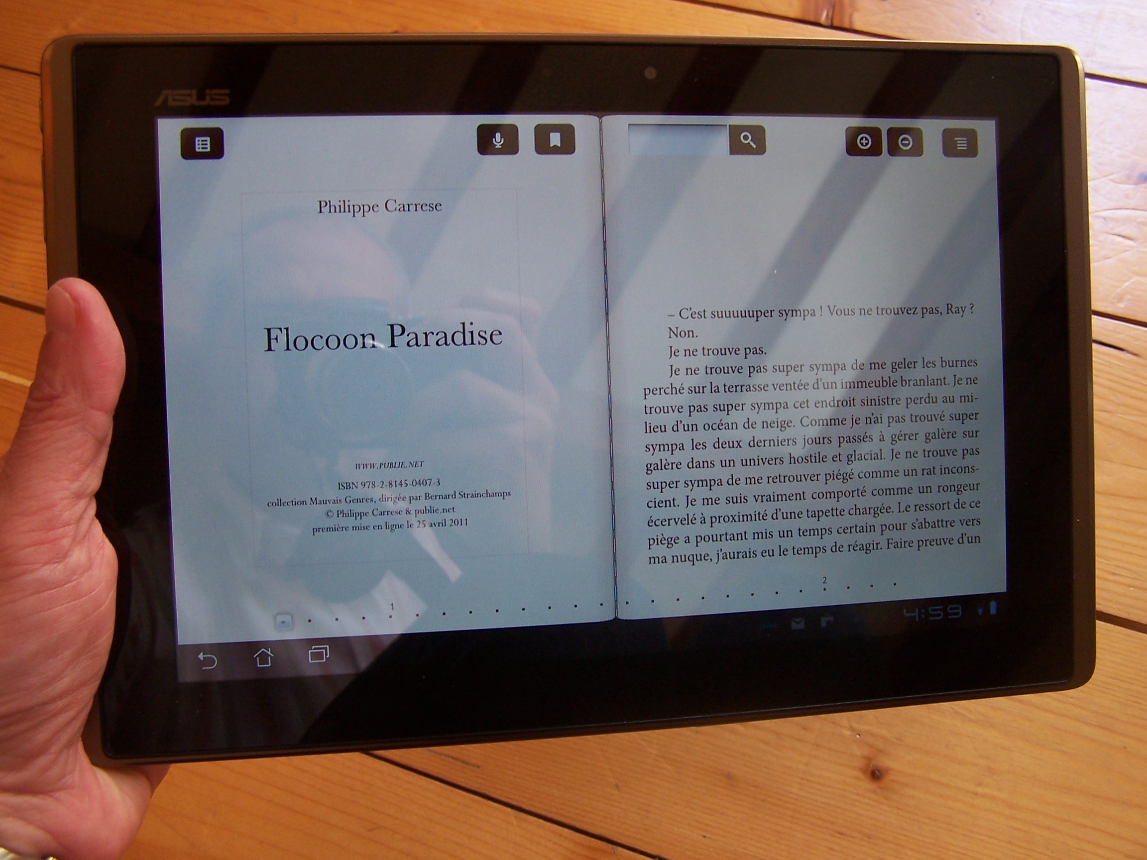 Premières lectures avec l'Asus Transformer (à signaler d'ailleurs le dernier test sur Clubic lui aussi très positif sur l'engin lui-même). Cela commence à se savoir un peu partout que le "machin" est bon. Le lecteur par défaut Book MyLibrary proposé sur la tablette est excellent. La bibliothèque est très bien faite, gestion très claire, visualisation des livres très agréable. Le tourné de pages excellent. Pas de possibilité de changer les polices comme sur l'iPad mais la police par défaut est bonne. J'ai essayé d'autres lecteurs comme Aldiko, que j'apprécie beaucoup sur smarphone, pour le délaisser sur la tablette. Le format 10 pouces (10/16) qui est excellent pour naviguer sur internet ou regarder des vidéos/films, se révèle très intéressant pour le mode double-page. On a deux vraies pages au format poche très agréables. En revanche, ce format n'est pas idéal du tout pour le mode vertical. Pas assez carré comme sur l'iPad. Magazines et bandes-dessinées se retrouvent un peu petits, il faut de bons yeux. Lecture demi-page conseillée. On agrandit par contre de manière très facile et agréable en zoomant. Comme le remarque Clubic, ce format est plus adapté au surf et à la vidéo qu'à la lecture proprement dite. J'attends avec impatience de voir de nouvelles propositions de presse quotidienne et magazines (on pense à ePresse en France), qui vont exploiter ce format dans les mois à venir. Côté ePub3, toutes les nouvelles versions que j'ai pu tester ne tournent pas encore sous Android. Attendre donc.