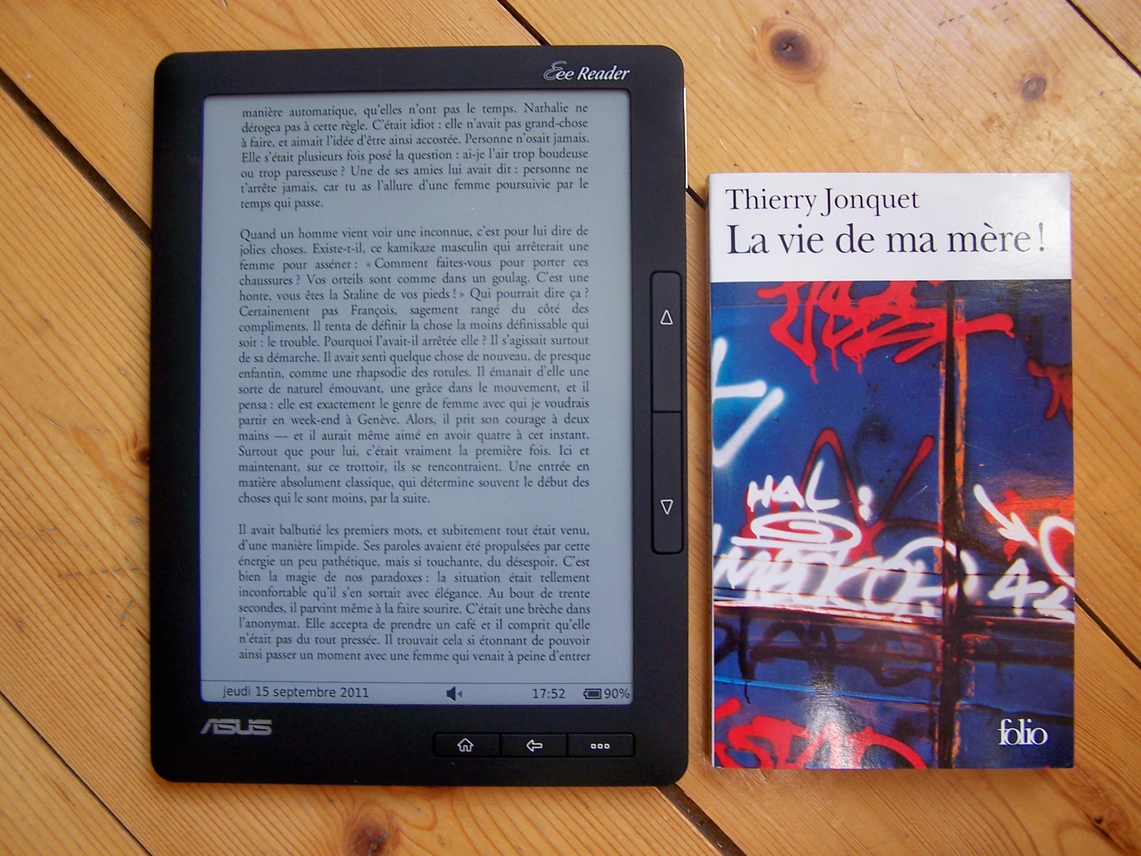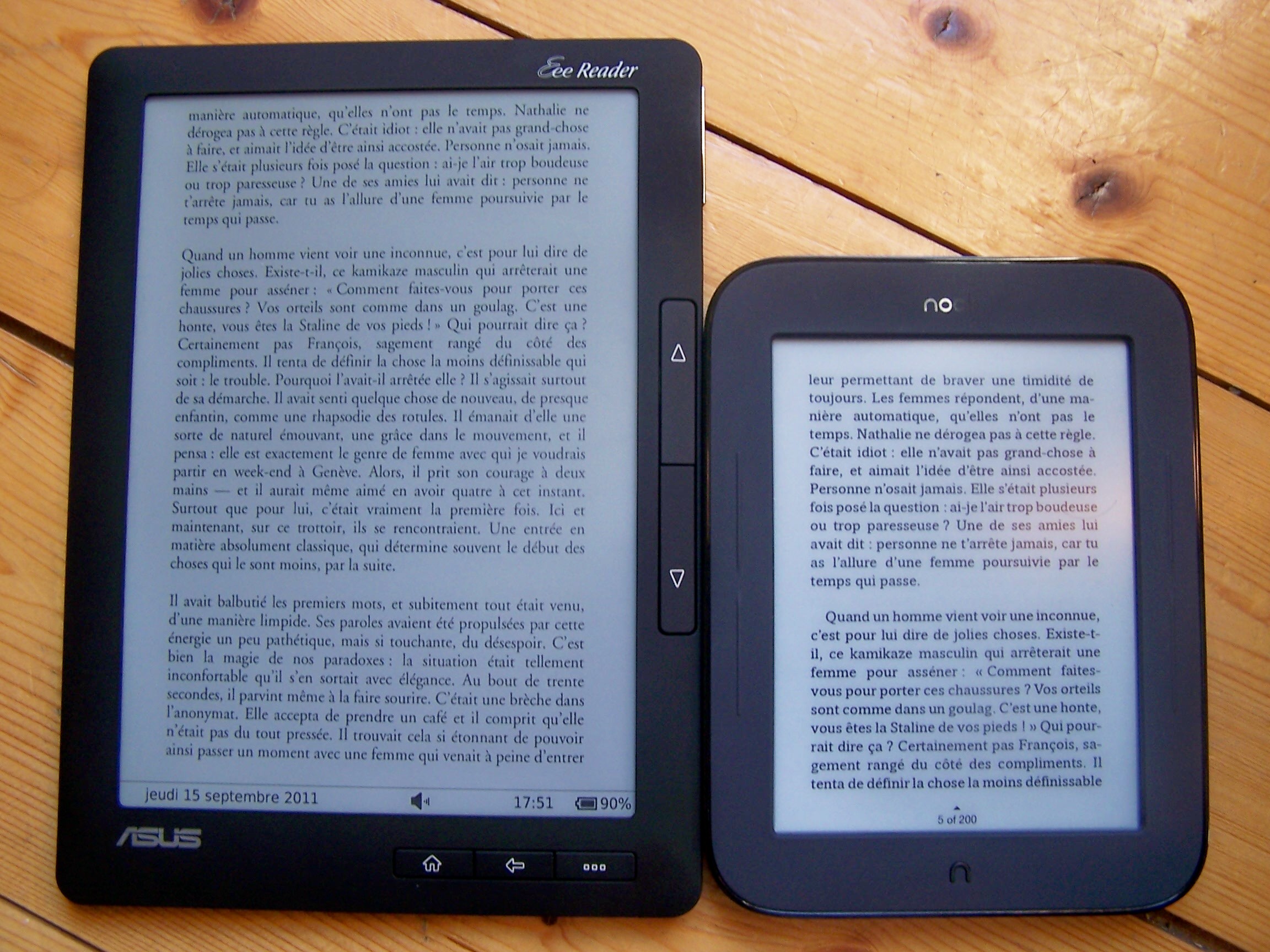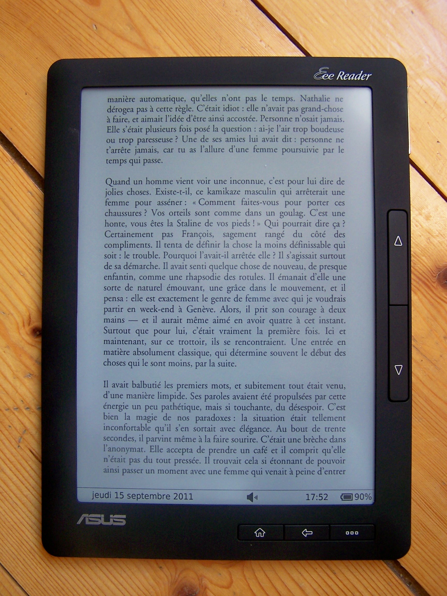 Asus a voulu un lecteur tactile, ce choix est malheureusement daté. L'année dernière, le choix du tactile hors-Sony était conditionné avec l'utilisation de la technologie SiPix, qui n'est pas aussi satisfaisante en terme d'affichage que l'eInk. Un fond plus gris, amplifié quand l'éclairage ambiant est faible, dans le train par exemple, où l'on obtient un gris qui tend vers le vert. On retrouve ce choix sur des lecteurs comme ceux de la Fnac, France-Loisirs, Bookeen, tous sortis l'année dernière à la même époque et qui ont dû succomber à la tyrannie du tactile. L'idéal est d'avoir une lumière ambiante de bonne intensité. Depuis un an, les fabricants ont progressivement optés pour des modèles tactiles avec de l'eInk. Sur l'Asus donc, tactile capacitif avec l'utilisation du doigt ou de la pointe de l'ongle. Pas de possibilité d'utiliser un stylet ou un crayon de papier. Pour lire en tournant les pages, surligner des passages, pas de soucis. Pour la prise de notes, l'annotation de documents, le croquis, écrire/dessiner avec le doigt n'étant pas la panacée, le résultat est beaucoup moins satisfaisant que sur des modèles comme le Pocketbook 902 qui utilisent une dalle Wacom avec un stylet (voir mon test). D'autre part, je trouve la dalle de l'Asus assez brillante, ce qui n'arrange rien avec des réflections intempestives chez soi, dommage.