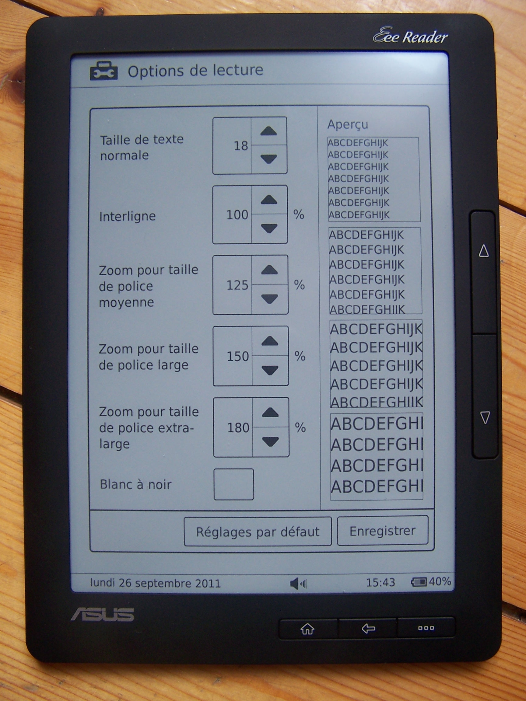 Les temps de latence sont corrects, j'apprécie beaucoup le "Veuillez patienter" qui s'affiche, un petit détail mais qui évite de s'exciter pour rien. En ce qui concerne les réglages, une page complète permet de sélectionner la taille des polices, l'interlignage, etc. Malheureusement, pas de possibilité de changer les polices, on regrette que des logiciels aussi performants que FBReader, par exemple, ne soient pas implémentés sur ce lecteur.