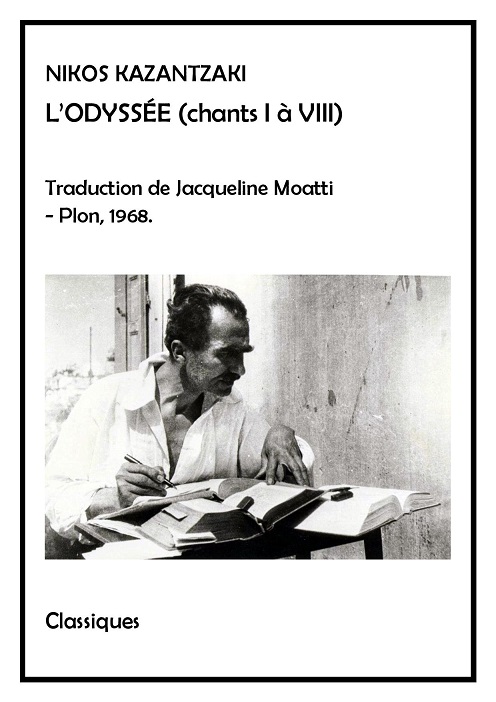Kazantzakis prend le parti de prendre la suite d’Homère. Ulysse, revenu à Ithaque, décide d’en “repartir à jamais sur les mers et les routes du monde”. Cette Odyssée représente pour certains l’un des plus grand exploit poétique du XXè siècle. La traduction française de Jacqueline Moatti a été publié à la fin des années 60. Aussi incroyable que cela puisse paraître, elle n’a jamais été rééditée depuis. Pour donner une idée la traduction anglaise est toujours restée disponible chez Simon & Schuster.