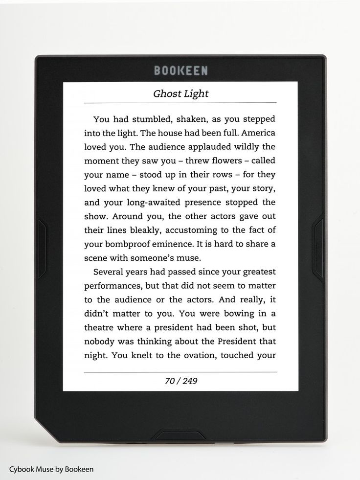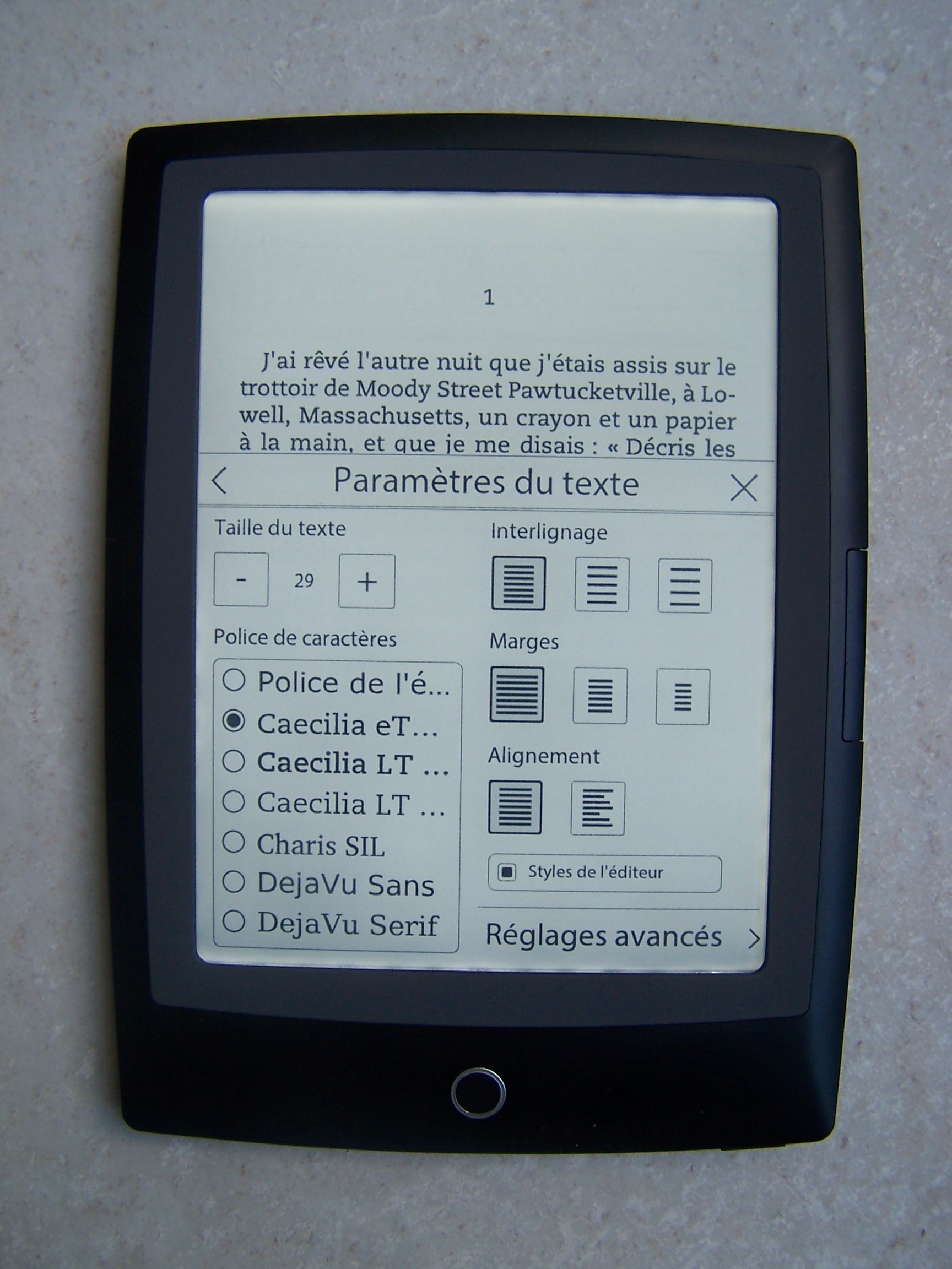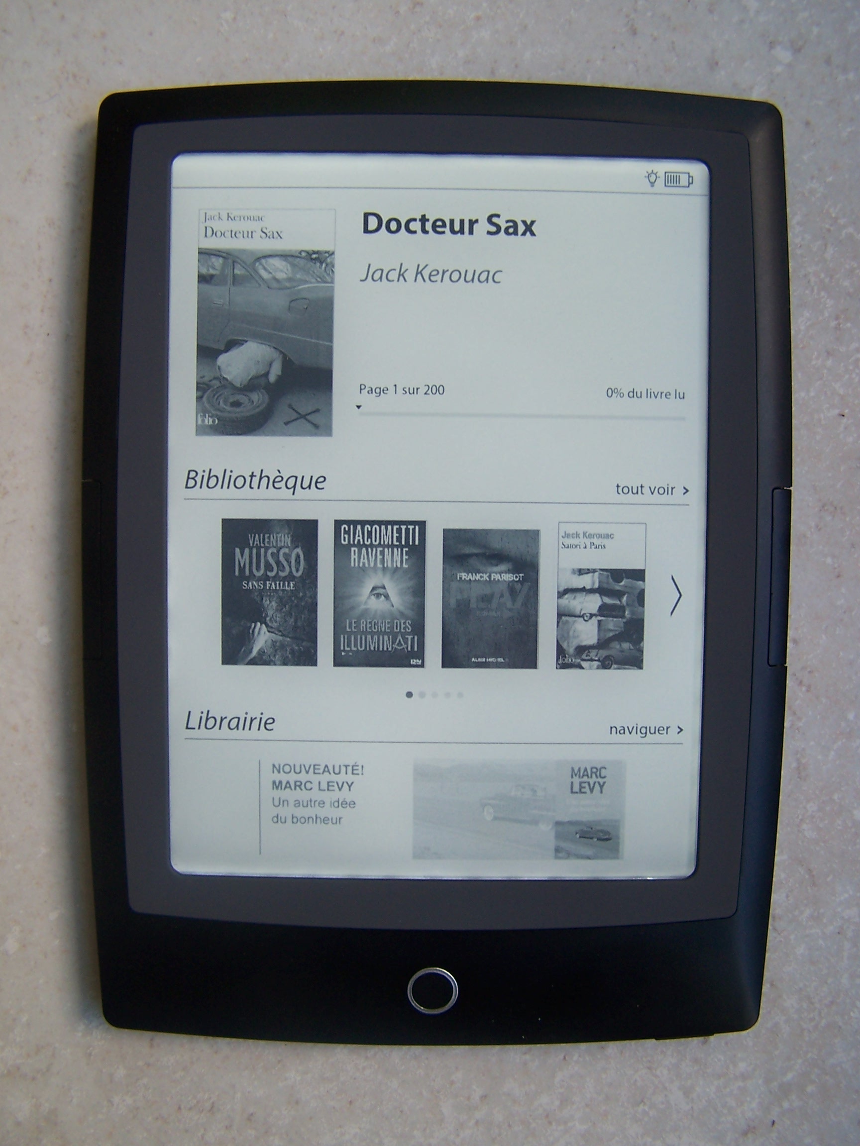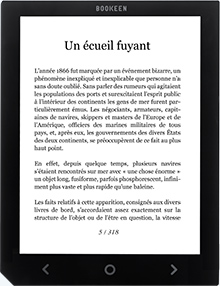 Allumage. Ce Cybook Océan est équipé d'un écran 8 pouces en Epaper d'une résolution 768x1024, 160 DPI. Pas d'écran eInk, Bookeen a fait le choix d'un fabricant concurrent pour ce grand modèle 8 pouces. Assez décevant pour ma part, je retrouve la sensation que j'avais eu malheureusement au Salon du Livre. Le contraste est assez nettement moins bon que chez eInk, c'est une évidence. Aussi bien dans le fond plus gris que dans les caractères avec un manque de contraste, plus gris que noirs. Des typographies qui sont assez ternes même dans des caractères gras. D'autant plus fragrant quand on met côte à côte avec le Cybook Muse et son écran en eInk Carta. Côté définition également, les 160 DPI sont bien juste pour des illustrations qui manquent de précisions. Si vous êtes un lecteur numérique averti, j'ai bien peur que vous ne soyez comme moi assez déçu par le rendu général, c'est un bémol important à mon sens. En adoptant le format plus grand, il vous faudra faire inévitablement abstraction d'un meilleur confort visuel. C'est à mon avis anormal pour un modèle haut de gamme, surtout avec des modèles qui ont tendance à tous adopter progressivement l'eInk Carta.