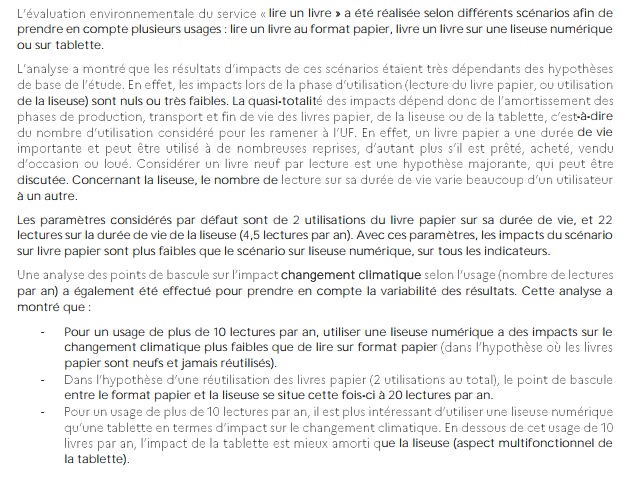 Si vous en avez déjà une et songez à un remplacement, menez une réflexion autour de vos lectures de l'année, voir des années précédentes. Indispensable? L'avez-vous vraiment "amortie" ? Les articles autour de l'environnement que j'ai recensé depuis des années sur le sujet donnent un réel impact écologique au-delà de 60/80 livres imprimés "remplacés". Allez, une centaine de livres, vous serez dans les clous sans scrupules. L'avantage d'une liseuse, c'est qu'elle dure longtemps, très longtemps, bien au-delà de nos autres bidules. Pour les liseuses, c'est je pense plus de 5 ans, 6/8 ans même si vous en prenez soin, évidemment sans casse. Soit des moyennes entre 12 et 16 livres par an. Vous entrez bien entendu dans la catégorie de grands lecteurs fixée désormais à 20 livres par an, imprimés et numériques confondus. Un chiffre de 20 livres annuel toujours comme bascule imprimé/ numérique, récemment confirmé par l'ADEME.