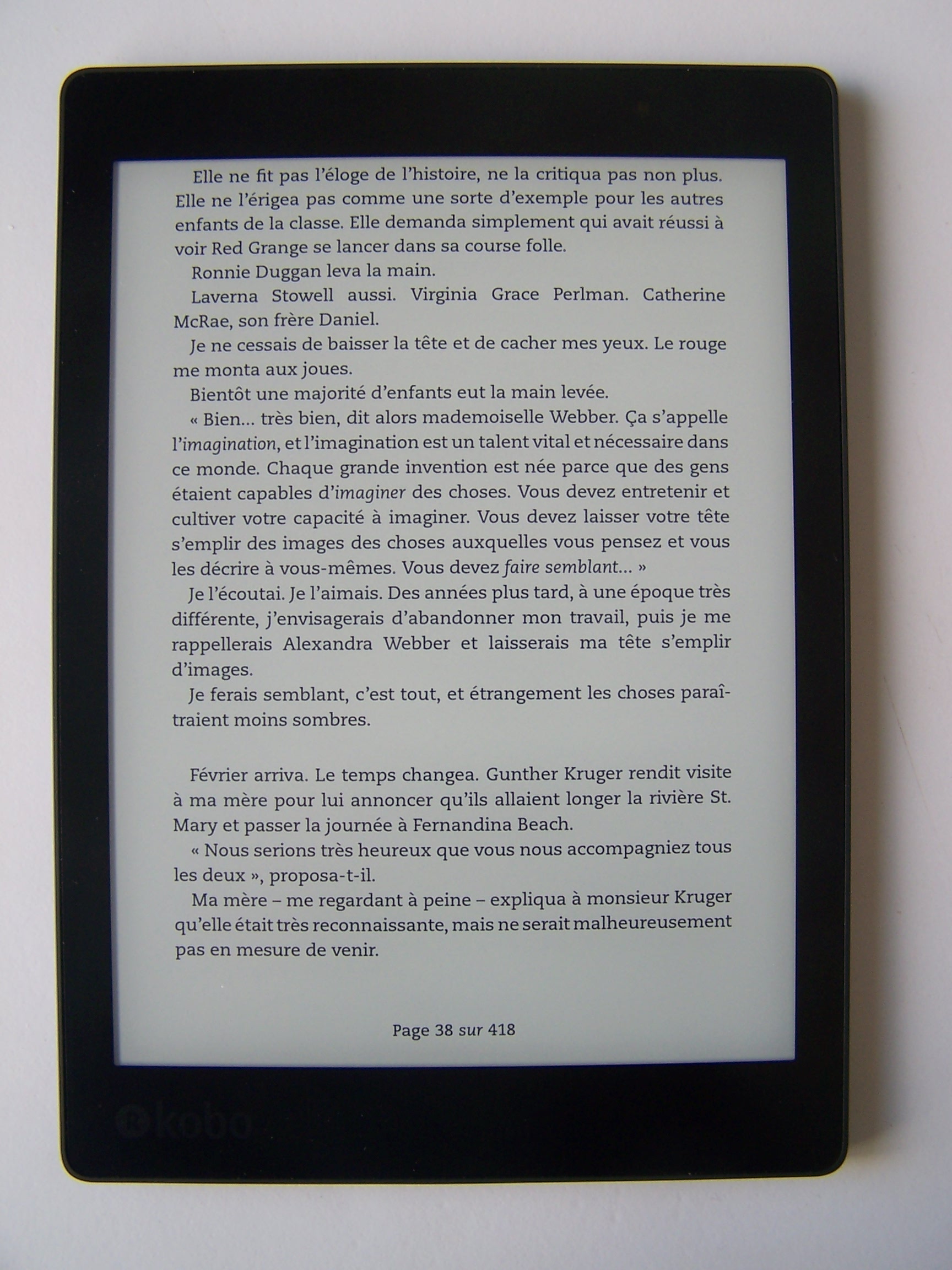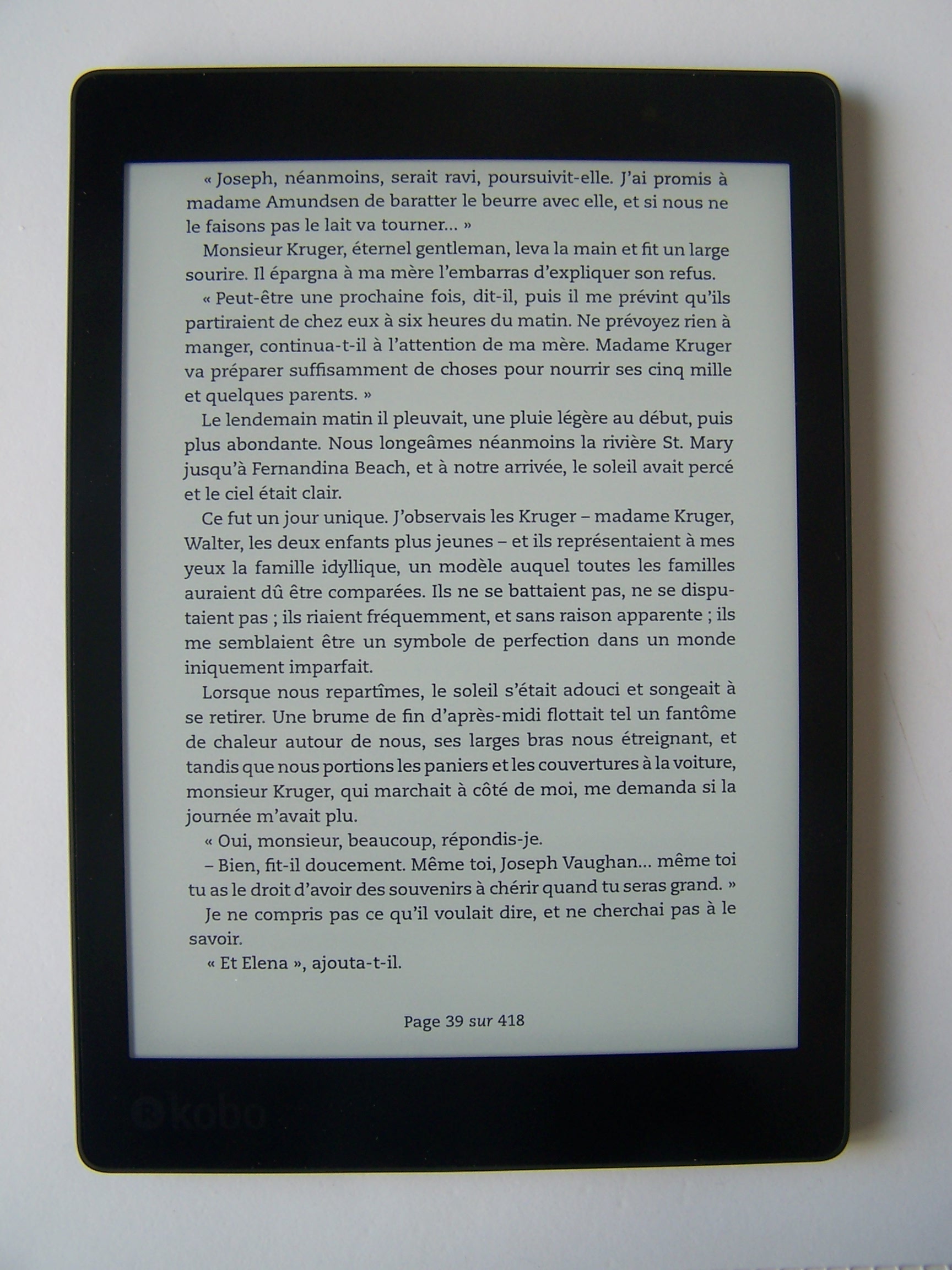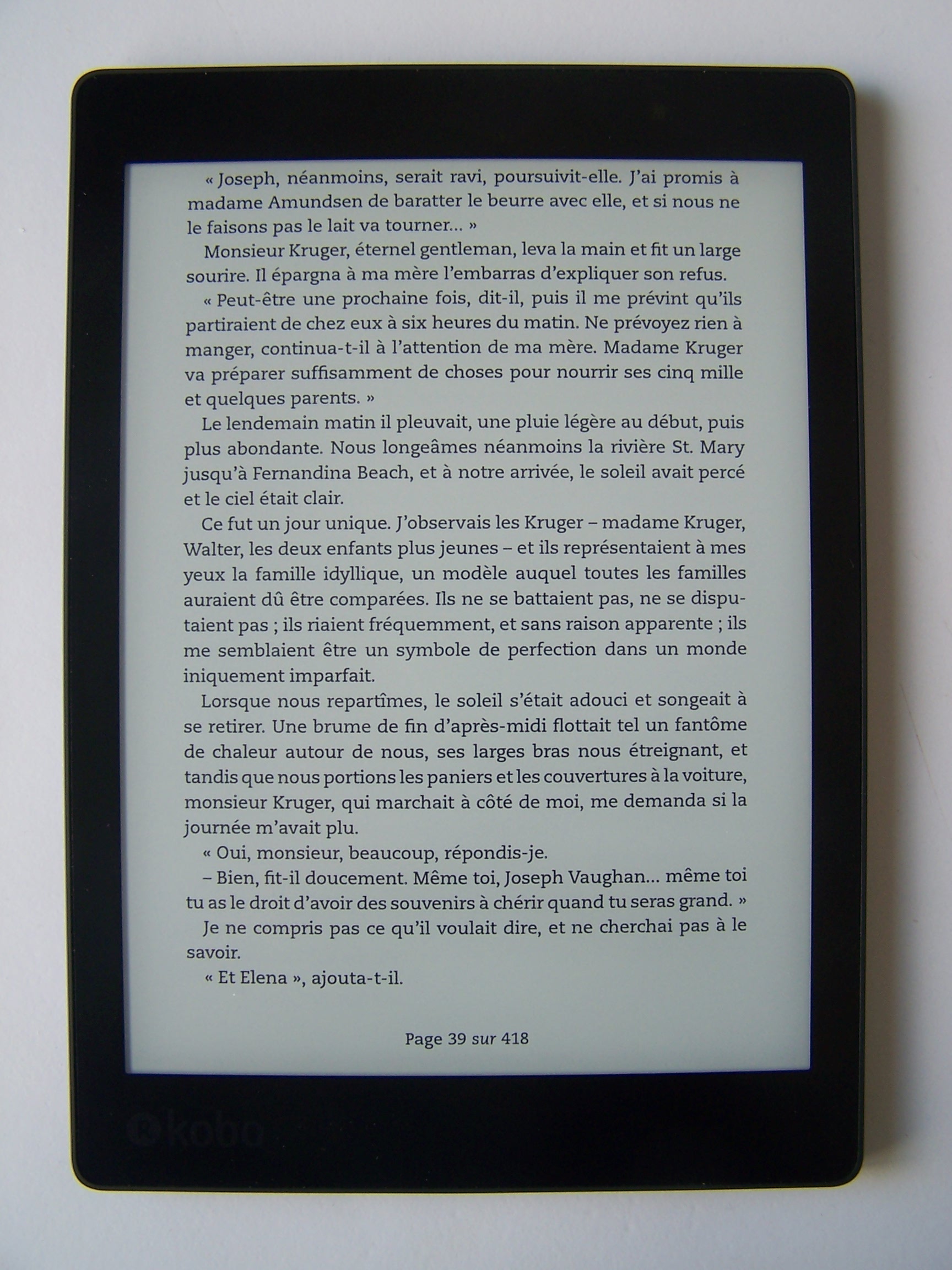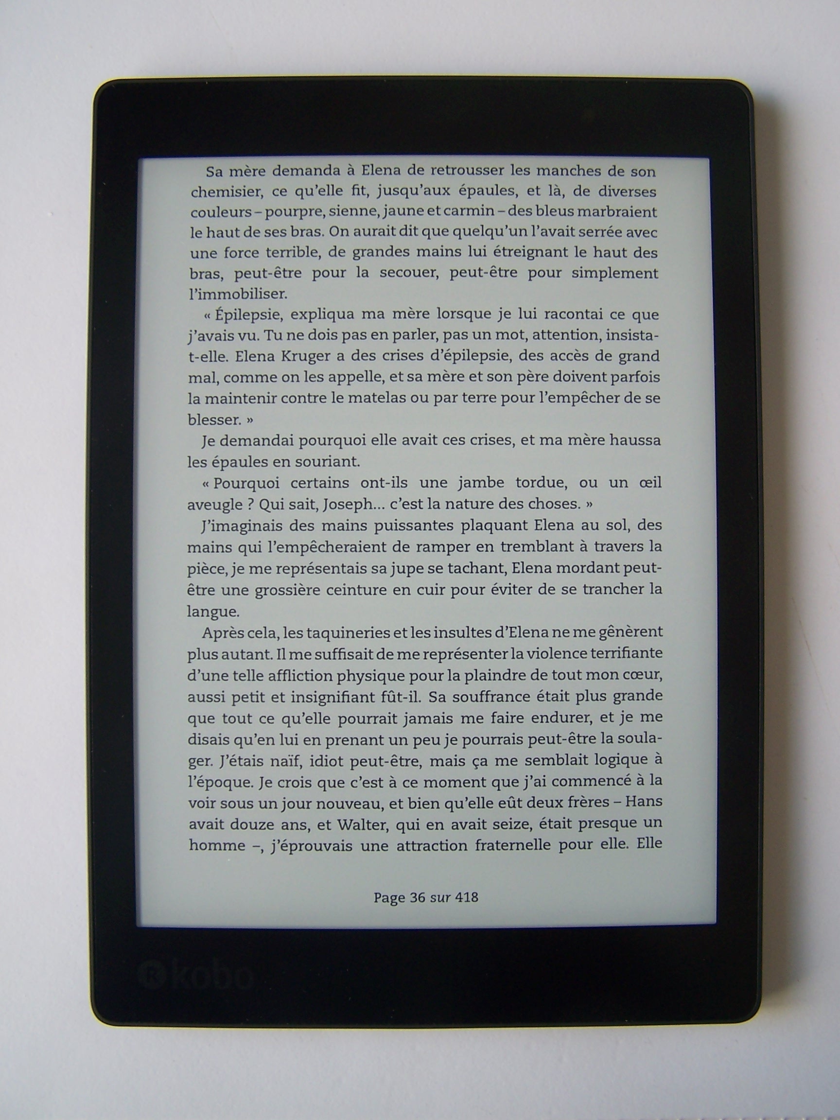 Je voudrais signaler également un aspect important à tenir compte si vous ne voulez pas forcément acheter des livres à la Fnac ou sur le store de Kobo. En effet, Kobo apporte aux fichiers des éditeurs un traitement particulier. La mise en page des ePubs qui ne passent pas par Kobo n'est pas optimisé pour les liseuses de la marque. En plus de l'absence de titres courants en tête de page [que l'on ne peut d'ailleurs pas supprimer dans les paramètres chez Kobo, bien dommage], le blanc en tête a été corrigé (et il est maintenant correct) mais le blanc de pied n'est jamais constant d'une page à l'autre au fil de la lecture. C'est particulièrement inconfortable, cela se ballade constamment. J'y suis sensible, vous peut-être moins mais vous serez prévenu. Ce sera le cas aussi pour des livres numériques que vous pourrez emprunter en bibliothèque. C'est une réserve qui est valable pour tous les modèles Kobo.