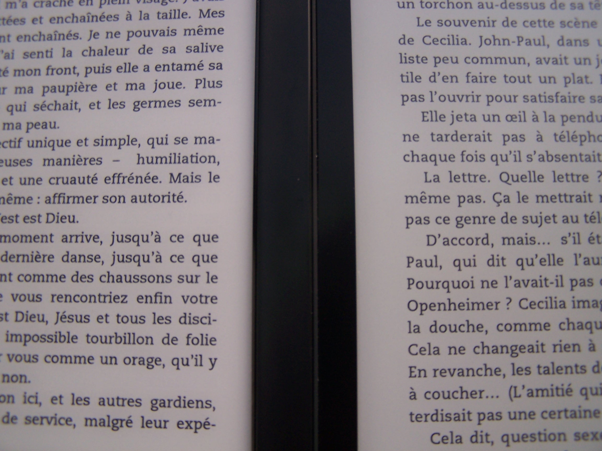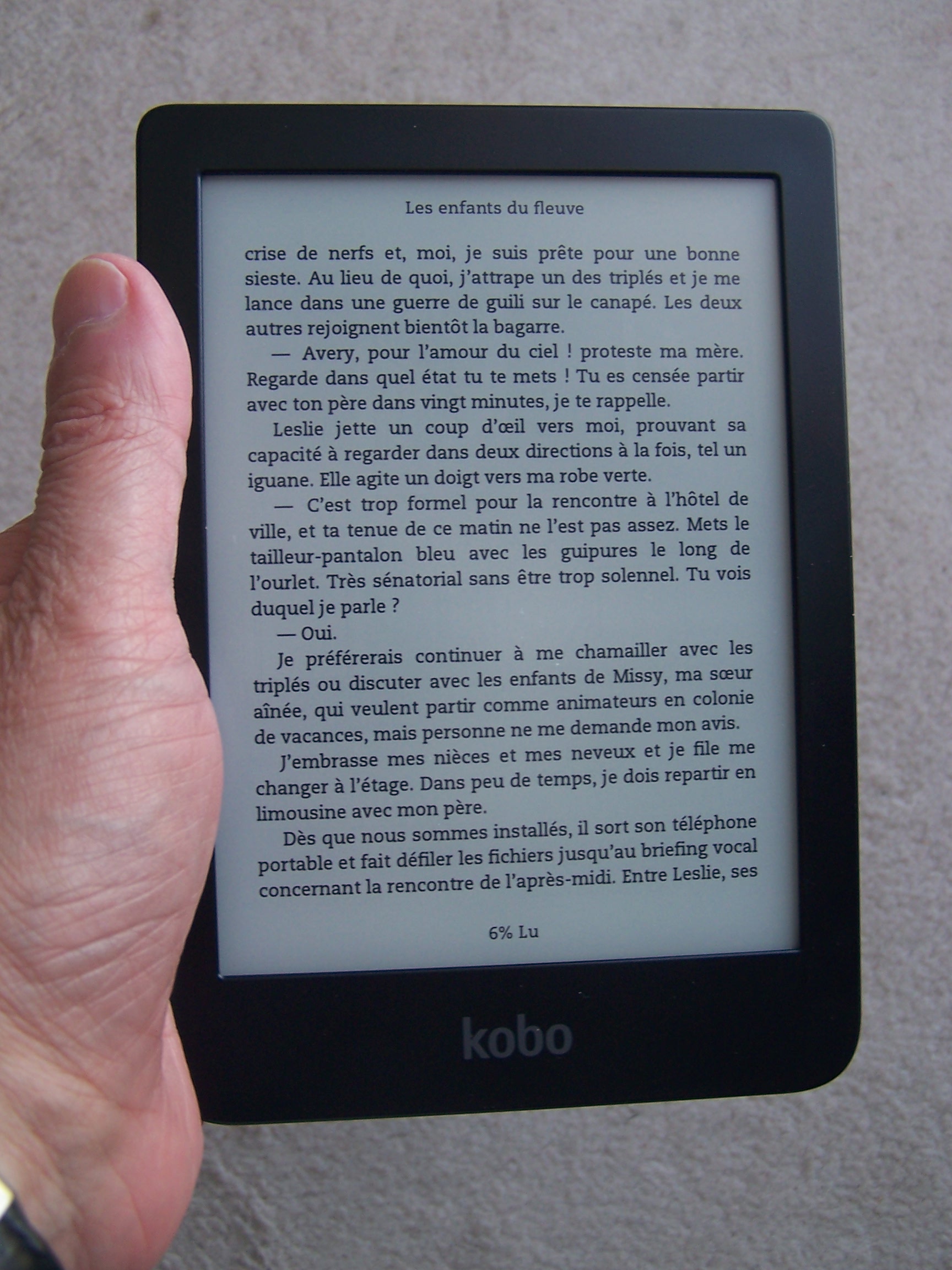 A la suite de mon test du dernier Kobo Aura One, je signalais un problème d'affichage de fichiers ePub. Problème qui se pose sur tous les modèles de liseuses Kobo bien sûr. En effet Kobo fait subir sur les fichiers ePubs fournis par les éditeurs un traitement particulier avant de les proposer à la vente sur son site ou ceux de ses partenaires comme la Fnac. Ces modifications optimisent les fichiers pour les liseuses Kobo, certes, mais du coup provoquent des disparités. Les fichiers ePub originaux qui n'auraient pas eu un tel traitement provoquent un problème d'affichage sur les modèles de la marque. La marge en haut de page n'est pas suffisante et les marges en bas fluctuent, des lignes de blancs en plus ou en moins. C'est particulièrement gênant à la lecture. Beaucoup d'entre vous m'ont demandé des photos pour illustrer le problème. Vous trouverez 6 pages successives d'un roman, au format ePub original, vendu sur les autres plateformes du marché. C'est aussi le cas de fichiers ePubs dans des offres gratuites ou empruntés en bibliothèques par exemple. Un problème qui n'existe bien évidemment chez aucun autre fabricant. Ce n'était pas le cas chez Kobo il y a quelques années. Chacun doit pouvoir en tenir compte, si c'est gênant pour lui. Souhaitons que Kobo puisse résoudre ce problème dans ses prochaines mises à jours.