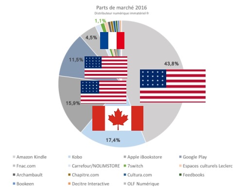 Nous avons toujours aussi peu de chiffres de ventes en France. Le distributeur Immatériel a donné la semaine dernière la répartion de ses ventes 2016. Sans surprises, Amazon en tête avec 43,8% des ventes. Kobo/ Fnac derrière avec 21,9% (Kobo 17,4% et Fnac 4,5%), Apple et Google derrière avec respectivement 15,9% et 11,5%. Ces 5 acteurs représentent 93,1% des ventes en France, les seuls 4 anglo-saxons 88,6%. Quels enseignements? Tout d'abord Amazon plafonne désormais, s'érode même peut-être un peu avec les années avec une concurrence solide de Kobo qui dispose à la fois de l'enseigne physique de la Fnac et de son expérience internationale sur le marché (liseuses et environnement). Apple maintient sa position. Avancée significative de Google en quelques années. La grande surprise de ces chiffres, c'est l'effondrement des ventes de la Fnac. Alors qu'un partage vertueux des ventes entre Kobo et la Fnac était plus ou moins de mise il y a quelques années, la Fnac décroche, c'est 1/4 seulement des ventes de celles de son partenaire canadien. Les lecteurs achètent des liseuses Kobo à la Fnac, puis achètent leurs livres avec un compte Kobo. Grosse désillusion pour la chaine française. Si elle est confirmée chez les autres revendeurs, une situation qui pose bien des questions sur la stratégie future de la Fnac. Dernier point, aucun acteur français indépendant ne parvient à sortir véritablement son épingle du jeu malheureusement. Voir le détail sur le blog de 7Switch. Même si bien sûr ces chiffres ne sont limités qu'à Immatériel, ils sont quand même éclairants. Merci à Immatériel pour ces éléments.