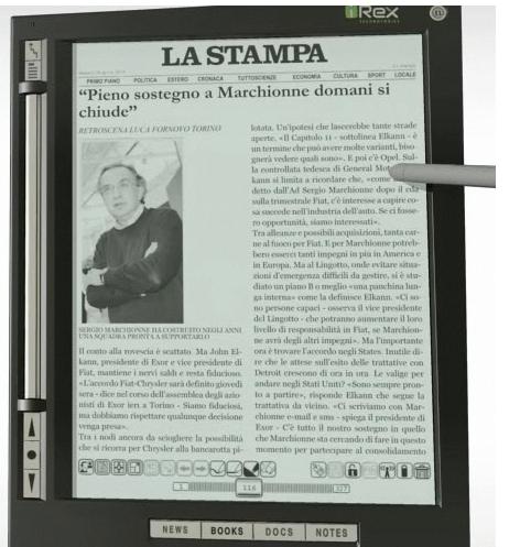 Une fois la version du jour récupérée, elle s'installe automatiquement dans la rubrique News du lecteur. Il suffit de l'ouvrir soit avec le stylet soit avec le bouton de navigation. On rappelera que le stylet est au coeur de la navigation de ces lecteurs à la surface tactile. Comme dans le cas des autres quotidiens, La Stampa diffuse une version PDF, le seul format qui puisse permettre une maquette aussi ellaborée et qui soit satisfaisante tant au niveau typographique que dans la navigation avec les liens.