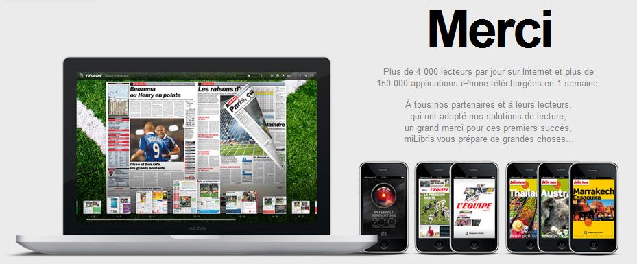 L'Equipe, Les Guides du Petit Futé, c'est plus de 4000 lecteurs par jour et 150000 applications iPhone téléchargées en une semaine; l'ensemble distribué par Milibris et ses partenaires éditeurs. Un beau démarrage pour la petite start-up française qui monte, qui monte...