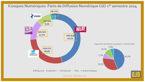 De bons résultats pour le portail GIE de la presse numérique ePresse. Celui-ci progresse avec un gain important de 5 points de sa part de marché, passant de 7,7% au 1er semestre 2013 à 12,7% sur les six premiers mois de 2014. A revoir les chiffres de l'OJD donnés en mars dernier (via OJD).