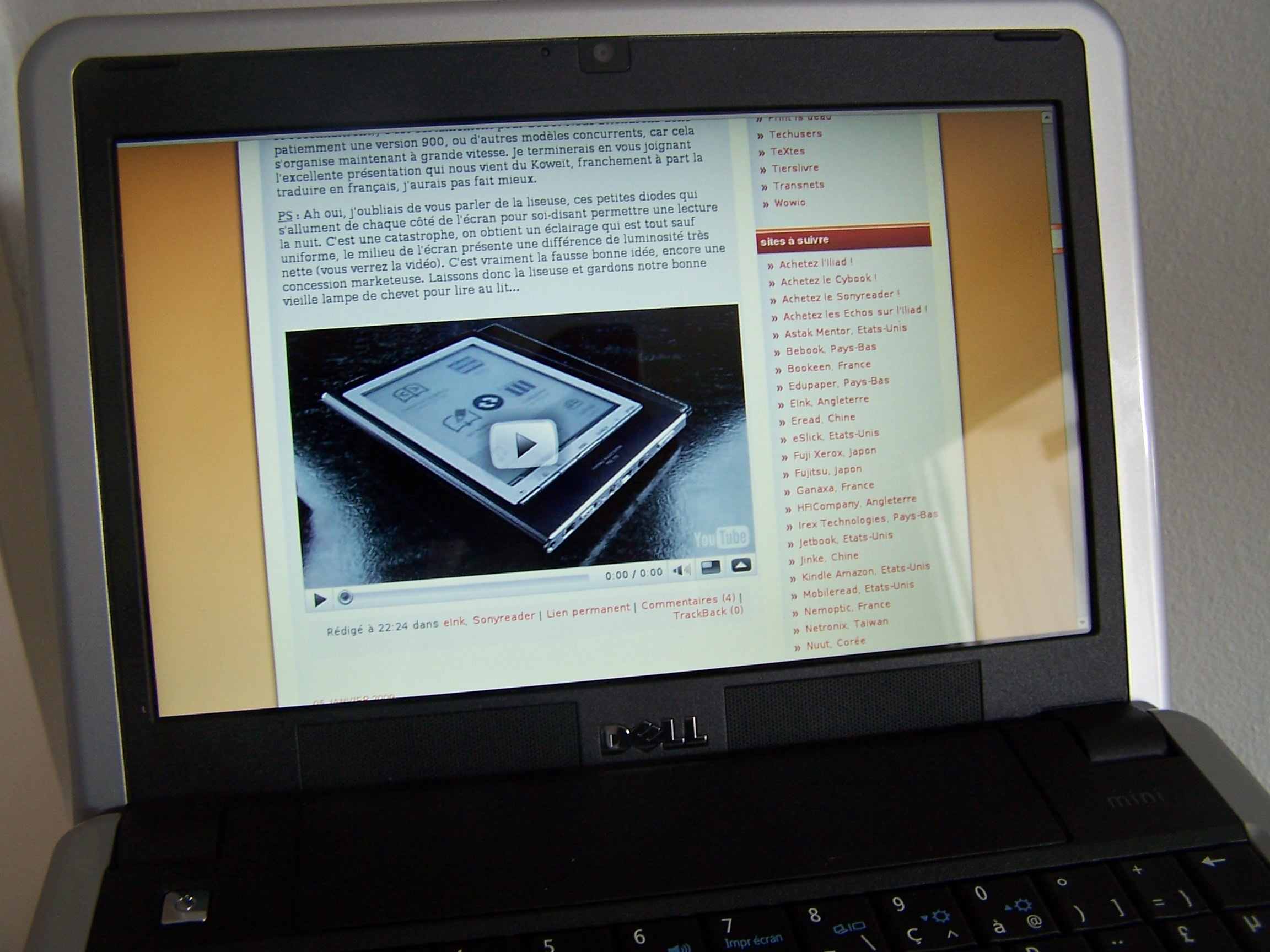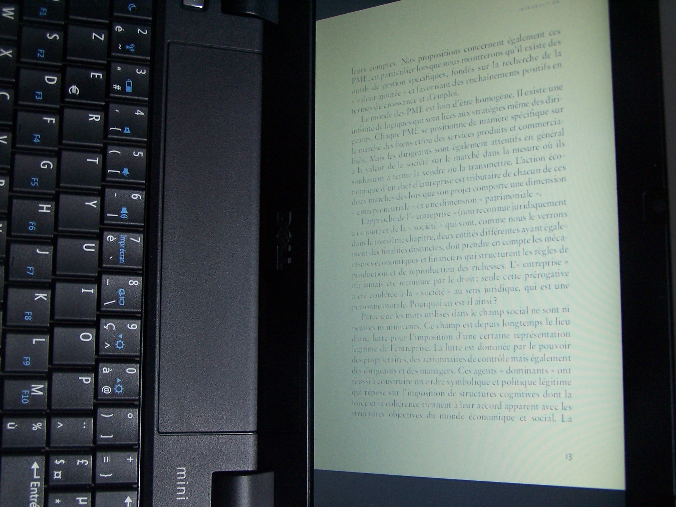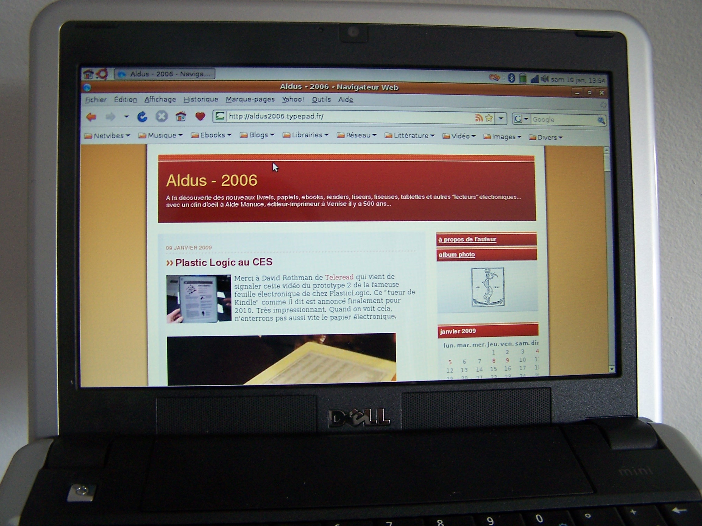 Bon, voilà, petit portable, petit prix (exactement le même que le Sonyreader, ce qui me fait penser que le vrai prix d'un livre électronique, c'est moitié moins, enfin, passons). C'est du solide, bien fait, plastiques costaux, touches pas trop petites, 3heures d'autonomie devant soi et le plus incroyable plus aucun son de soufflerie, c'est assez déconcertant au début. Configuration Linux avec Ubuntu, on s'y fait très bien. Les premiers jours d'utilisation,