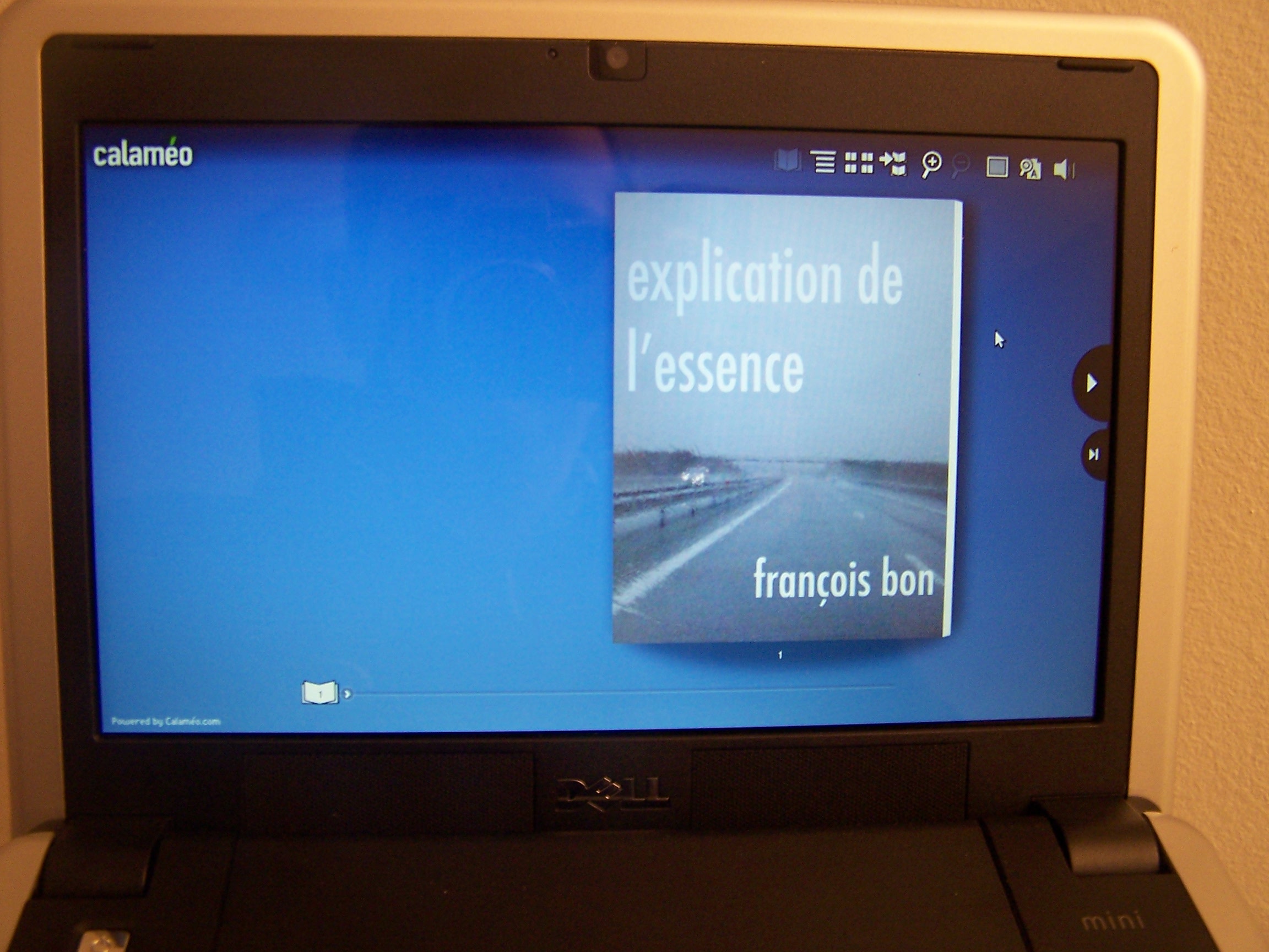 cela fait très bizarre, on a l'impression d'être en Lilliputie, mais quel confort d'utilisation dans le train, dans un café, dans un jardin public, dans une bibliothèque... Bref, ça change la vie, et bien au-delà de ce que j'espérais! Bien entendu, on se refait pas, je me suis essayé aux chargements de pages sur plusieurs sites références et de ce que j'avais sous la main dans le disque dur. Je vous donne un florilège de pages, au hasard Publienet (avec Calaméo), Adelaide (Cervantès avec les illustrations de Gustave