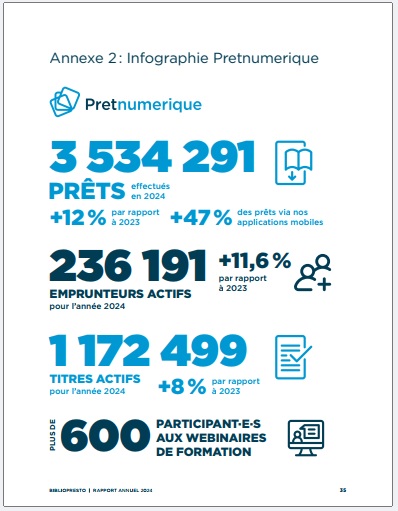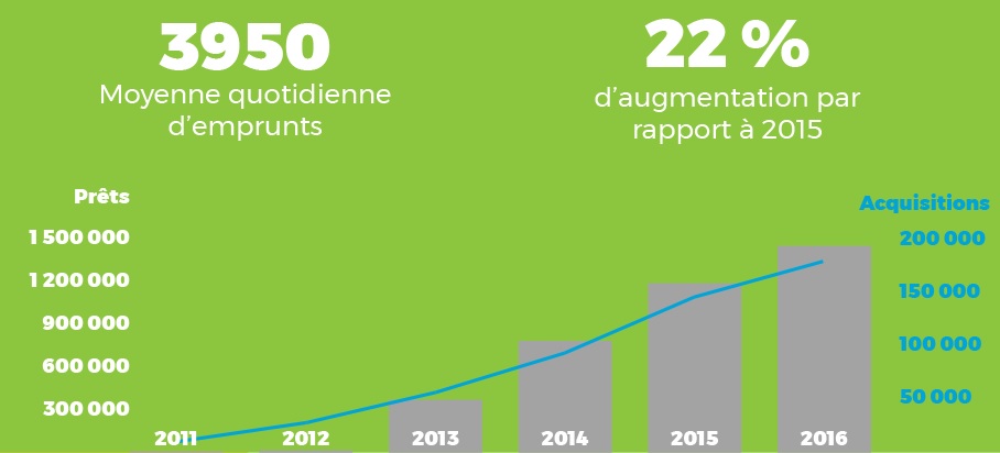 Des précisions de la part de Jean-François Cusson de Prêtnumerique.ca que je remercie: "La progression du prêt numérique se poursuit, au Québec. En 2016, le prêt a augmenté de 22%, alors que les collections offertes aux usagers ont été enrichies à hauteur de 23%. Le service, lancé officiellement en 2012, avait alors enregistré un peu moins de 100.000 emprunts. En 2016 seulement, c'est près de 1.500.000 de prêts numériques qui ont été réalisés. Aucun signe d’essoufflement à l'horizon! Il s'agit maintenant d'un service de base offert par pratiquement toutes les bibliothèques publiques du Québec et du Nouveau-Brunswick." A l'heure où certains bibliothécaires sont encore dans la défiance par rapport à un tel service en France, les nombreux retours de nos voisins francophones (Québec, Belgique, Suisse) devraient les interpeller...