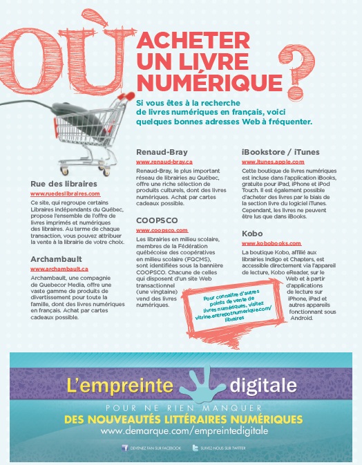 "Le groupe Archambault, qui offre plus de 50.000 titres sur sa plateforme, est le premier vendeur de livres numériques dans la province, devant la boutique Apple. Le groupe dit proposer depuis les trois dernières années la plus grande offre de contenu québécois et francophone. De leur côté, 95 librairies indépendantes du Québec se sont regroupées sur un site qui offre quelque 35.000 titres provenant d'une centaine de maisons d'éditions québécoises.
