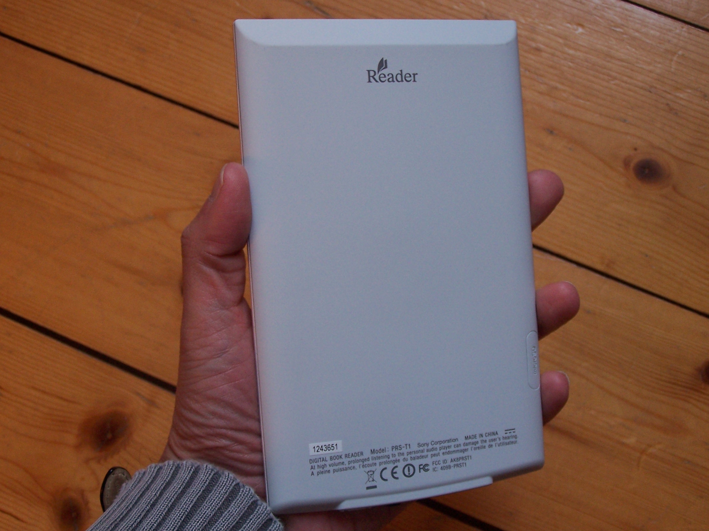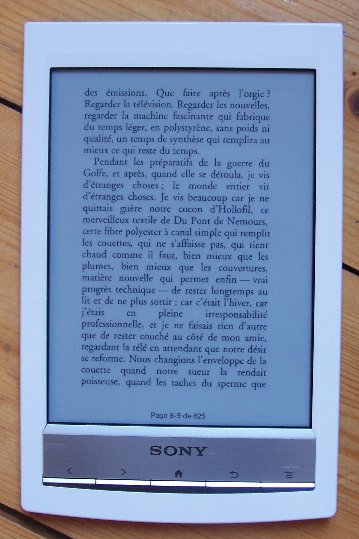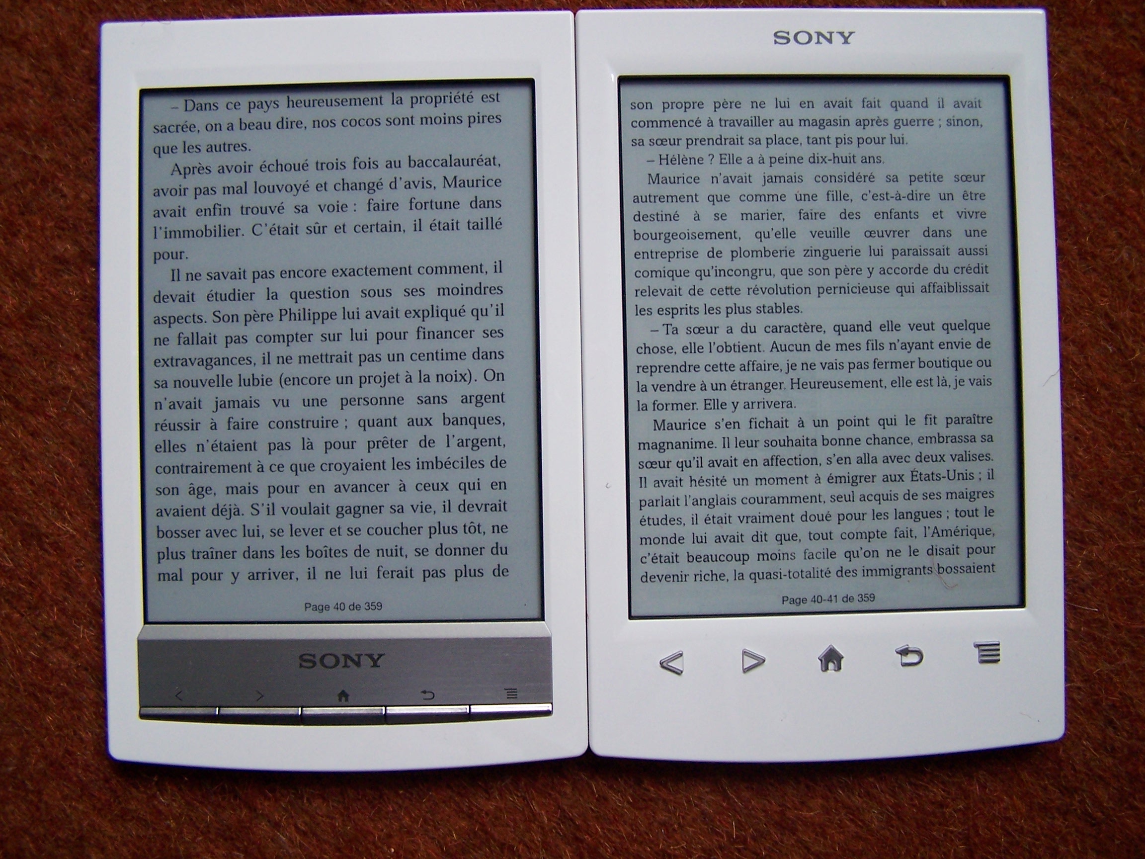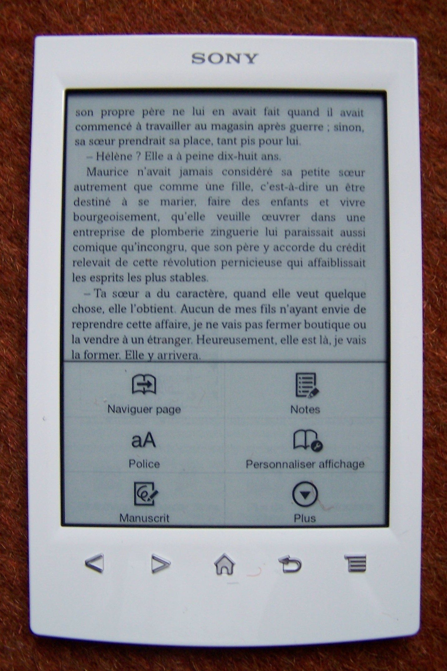 Prise en main: Ce qui frappe d'emblée avec ce nouveau livre électronique c'est l'abandon de l'alu auquel Sony nous avait toujours habitué depuis les tous premiers modèles, souvenirs, souvenirs. Baisse du prix de vente oblige, Sony nous propose désormais un modèle avec des matières plastiques mais d'extrêmement bonnes qualités. La finition est irréprochable comme toujours chez Sony, souplesse/résistance des touches, etc. Clin d'oeil de l'alu qui subsiste seulement pour la barre du bas avec les touches. Dos en plastique touch très agréable au toucher. Finesse et légèreté, deux qualificatifs qui viennent tout de suite à l'esprit, un jugement très positif. Toutes les fonctions habituelles sont regroupées en bas sur la tranche (reset, prise usb, prise casque et allumage), sur le dessus en bas les touches évidentes, page arrière, page avant, home, retour et menu). Les touches discrètes, c'est bien. Allumage. Ecran eInk Pearl, c'est théoriquement la meilleure qualité sur le marché à l'égal du Kindle, du Nook et autre Kobo. Je dis bien théoriquement car l'écran sur tous les modèles que j'ai pu voir en boutique et celui que j'ai testé est plus gris que les modèles des autres concurrents que j'ai cité. La différence est assez nette, j'ai déjà eu l'occasion d'en parler en début d'année avec une planche comparative. Visiblement ce n'est pas le cas pour tous les modèles fabriqués par Sony sur les différents marchés. Je pense que des lots différents existent (écrans eInk Pearl qualités A et B), suivant la production disponible chez eInk. La différence est suffisamment nette pour moi qui suis habitué depuis un an maintenant avec des modèles de qualités A, Nook et Sony PRS-650. C'est vraiment dommage qu'en France, nous n'ayons pas d'écrans Sony aussi blanc que le Kobo. Pour quelqu'un qui n'a jamais acheté ce type de livre électronique ce n'est pas très grave, en revanche pour quelqu'un qui voudrait passer d'un 350 ou 650 à ce nouveau modèle, c'est un détail qui ne sera pas négligeable du tout. Soyez très vigilent là-dessus, vous serez très déçu. Le sentiment d'une regression, comme si vous passiez à un papier de moins bonne qualité. J'avoue que j'ai été très gêné à la lecture par rapport à ce modèle alors qu'il présente de très grandes qualités par ailleurs, nous le verrons plus bas. Donc bémol très fort pour moi sur un aspect essentiel, je dirais même le numéro un, c'est bien dommage. Côté tactile, le Sony PRS-T1 est extrêmement réactif, on voit qu'il dispose d'un très bon processeur. Bémol encore pour moi, le flash noir qu'il est impossible de désactiver comme sur tous les autres modèles des concurrents sur le marché. Sony traine ce boulet depuis des années. Incompréhensible, tant c'est un élément négatif maintenant bien connu. J'ai posé la question à Sony France, oui, nous l'avons intégré, c'est prévu dans les prochaines versions. Toujours comme si le ressenti client ne passait jamais la frontière des ingénieurs/développeurs, quand même assez insensé. Le sentiment d'un disque rayé, discours entendu maintes fois. Dommage encore. Côté design, bords légèrement arrondis, bords incurvés, la petite trappe moulée très discrête pour la carte SD au dos, tout très réussi, petit bémol cependant pour la prise en main. Si la largeur resserée du lecteur est très agréable quand on le tient dans la paume de la main, autant l'étroitesse des deux bords latéraux et l'absence de modelé à l'arrière font que la prise en main n'est pas optimale quand on le tient sur le côté, il a facheuse tendance à glisser. Autre détail génant: les plastiques sont brillants, clinquants. On les aurait préférés mats, beaucoup plus discrets. Petit détail encore pour le tactile, il faut frotter la surface de l'écran, la simple pression à droite ou à gauche ne fait pas tourner les pages comme sur le Nook ou le Kobo, dommage encore. Bref, sur l'ensemble de ces aspects, le Sony perd des points.