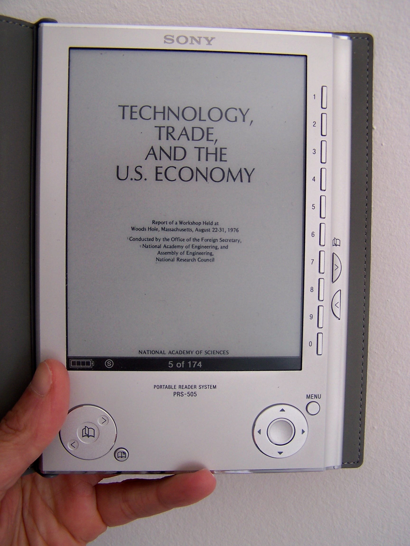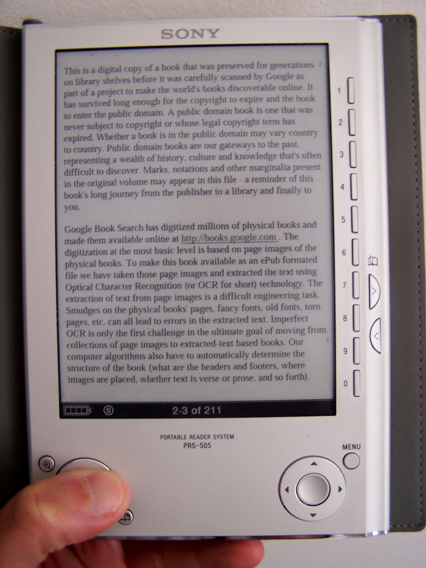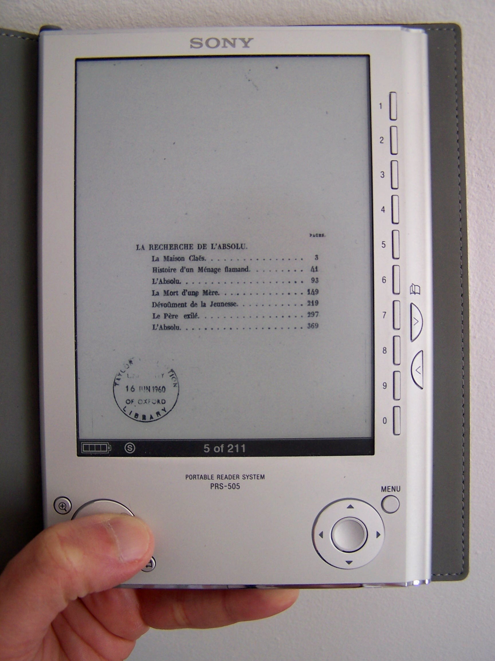 Plus de détails sur ce fameux basculement du catalogue de Google sur la plateforme Sony. La procédure de transfert est extrêmement simple, on a accès directement à la version ePub. J'ai choisi deux livres caractéristiques il me semble, l'un un classique du 19ème siècle en l'occurrence La Recherche de l'Absolu de Balzac, l'autre un essai économique paru dans les années 70 (en anglais). Ces deux choix caractéristiques des enjeux car ils recouvrent à la fois des fonds libres de droits les plus lus et qui sont dans les catalogues des éditeurs mais aussi de la littérature au sens large qui sont couverts par le copyright des auteurs et des éditeurs et qui ont fait l'objet du programme de numérisation de Google. La version du livre de Balzac est en effet assez décevante, comme l'a souligné Cristelle hier, des problèmes de coupures de mots, de césures, la lecture devient pénible au bout de quelques pages. La qualité du support de départ, à savoir les pages imprimées, intervient de manière très délicate dans la numérisation sans correction. Décevant donc, je vous laisse juger. En revanche, dès que l'on possède un original de départ relativement homogène, c'est le cas des livres plus récents comme l'essai que j'ai pris, alors là, le résultat est absolument irréprochable. Très impressionnant, je révise complètement la première impression négative que j'avais pu porter hier. Une fois que la nouvelle version ePub justifiée sera là, nous allons avoir de très bons textes. D'ailleurs pour les premiers textes difficiles, Google a déjà depuis longtemps engranger des versions plus récentes des éditeurs qui se trouvaient dans les bibliothèques et dont la numérisation est bien meilleure! Bref, j'ai le sentiment en voyant cela que le pari de Google de passer sur des supports mobiles qui se rapprochent du livre est bien en train de se gagner. Alors bien sûr, vous me direz, pour beaucoup de livres avec des appareils de notes, des tableautages, c'est encore loin d'être parfait. Certes, mais quand je vois le résultat dès à présent, c'est très impressionnant. Reste plus qu'à monnailler. Ce passage à l'ePub en quelques mois montrent que Google maîtrise de manière éclatante la gestion des flux XML à grande échelle, l'indexation des éléments de couverture, des pages de titre, des pages de copyright (c'est permis de sourire), des corpus de textes, bien des choses sont d'ores et déjà résolues. On peut dire effectivement chapeau bas Messieurs de chez Google! Est-ce que la Bibliothèque de France peut basculer de la sorte sur une plateforme comme celle de Sony qui rappelons-le est une plateforme ouverte avec un format non-propriétaire comme celle d'Amazon? La concurrence est très rude et le train d'enfer mené par Google et ses moyens financiers met la barre très haute... Tout le monde va courir derrière, je pense à Project Gutenberg par exemple, avec ce message en forme de SOS sur Teleread. Une chose aussi, c'est que le format ePub prend tout d'un coup une importance considérable, et cela, c'est une très bonne nouvelle pour tout le monde! Pour Google, on n'a bien entendu pas fini d'avoir peur, dommage qu'Olivier ne soit pas là en ce moment pour nous commenter tout cela...