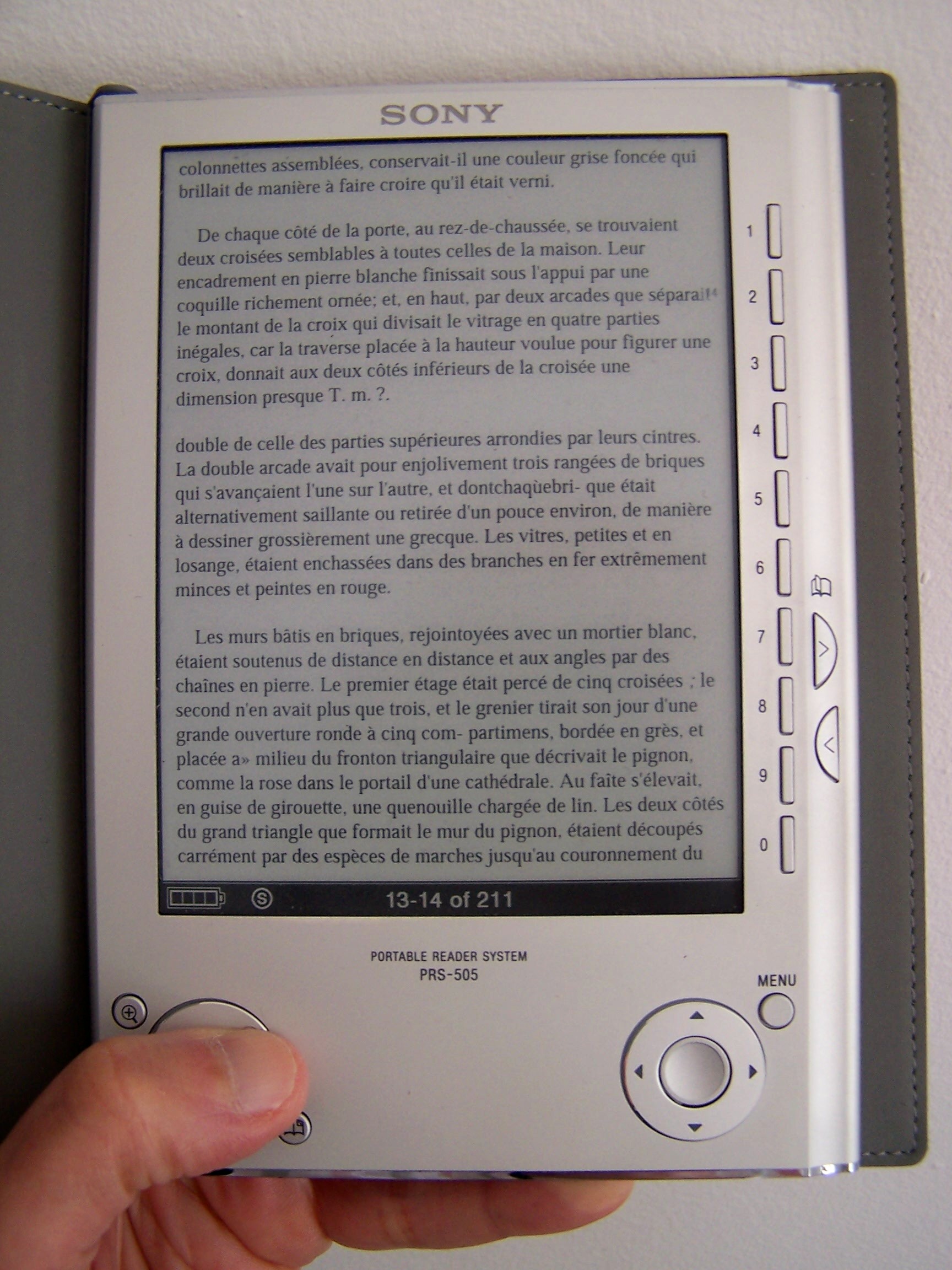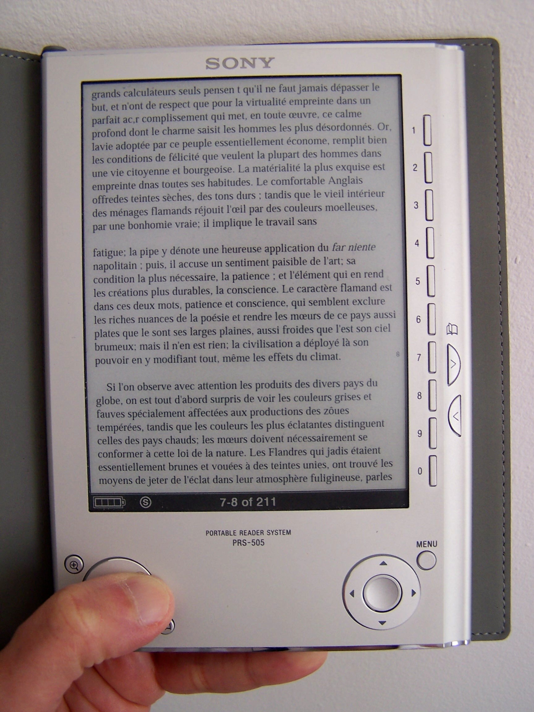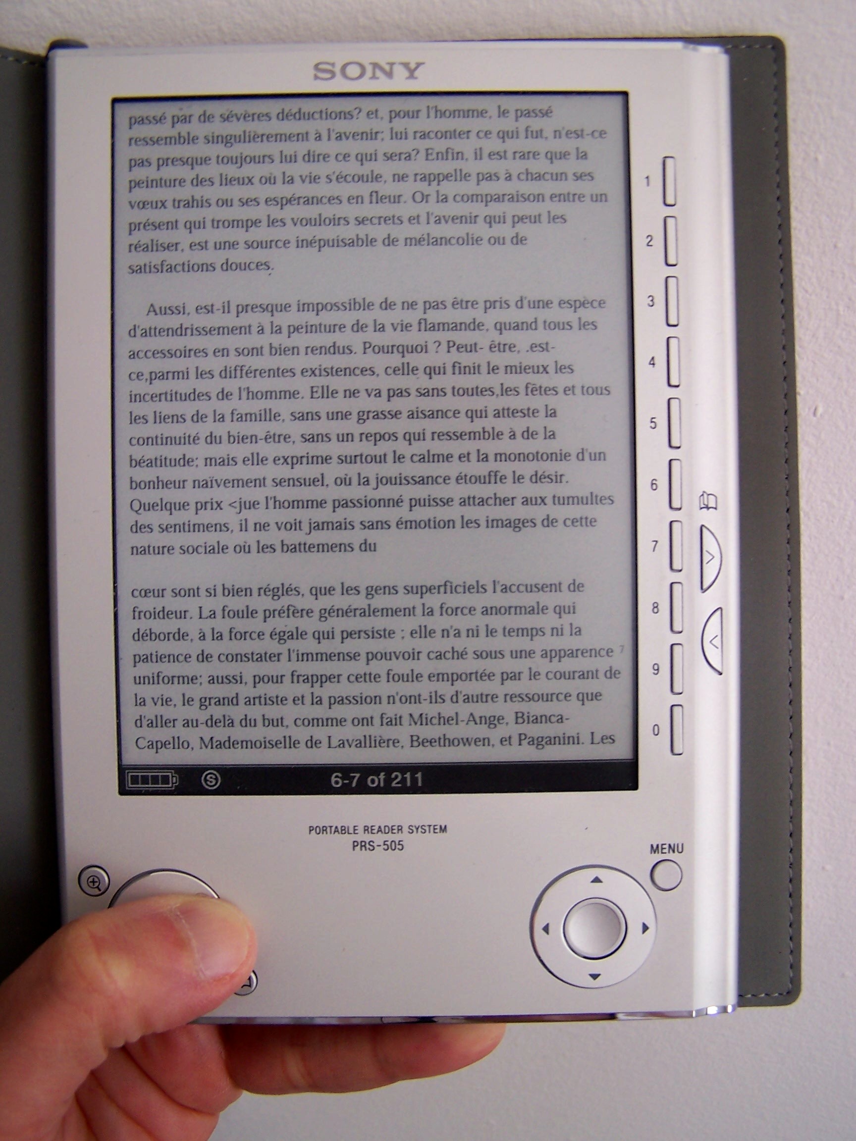 Un test très complet du Sonyreader PRS-505 chez EBouquin. Plus d'un an maintenant qu'il ne me quitte pas. Je viens de terminer Les Trois Mousquetaires dans la version BeQ, un vrai bonheur (merci à Gabriel Matzneff de m'avoir donné envie de le relire). Pour ma part, j'insisterais aussi sur l'intérêt du format RTF pour importer tous les textes en word, le reformatage des PDF (qui est très pratique et passe très bien pour bon nombre de documents), le pont récent avec Google Recherche de Livres (ce n'est pas rien!). Indiscutablement, le lecteur le plus ouvert du marché au niveau des formats. Le Cybook est un peu en retard à ce niveau-là. C'est vrai que Sony devrait revoir un peu la navigation qui est encore un peu laborieuse quand on a un grand nombre de livrels dedans. Quelques SD card par thèmes de bibliothèques, c'est vraiment génial, vous pouvez me croire. Amis bibliothécaires, avec votre science de la classification, au travail. Pour ma part, je n'ai pas basculé sur Calibre car j'ai pas mal de livrels en format ePub sous DRM, je ne vois aucune contrainte particulière dans leur gestion. Dernier conseil si ce n'est déjà fait, allez-vite le prendre en main dans les FNAC. Gros lecteurs, pas d'hésitation à avoir, un investissement que vous apprécierez à sa juste valeur dans le temps.