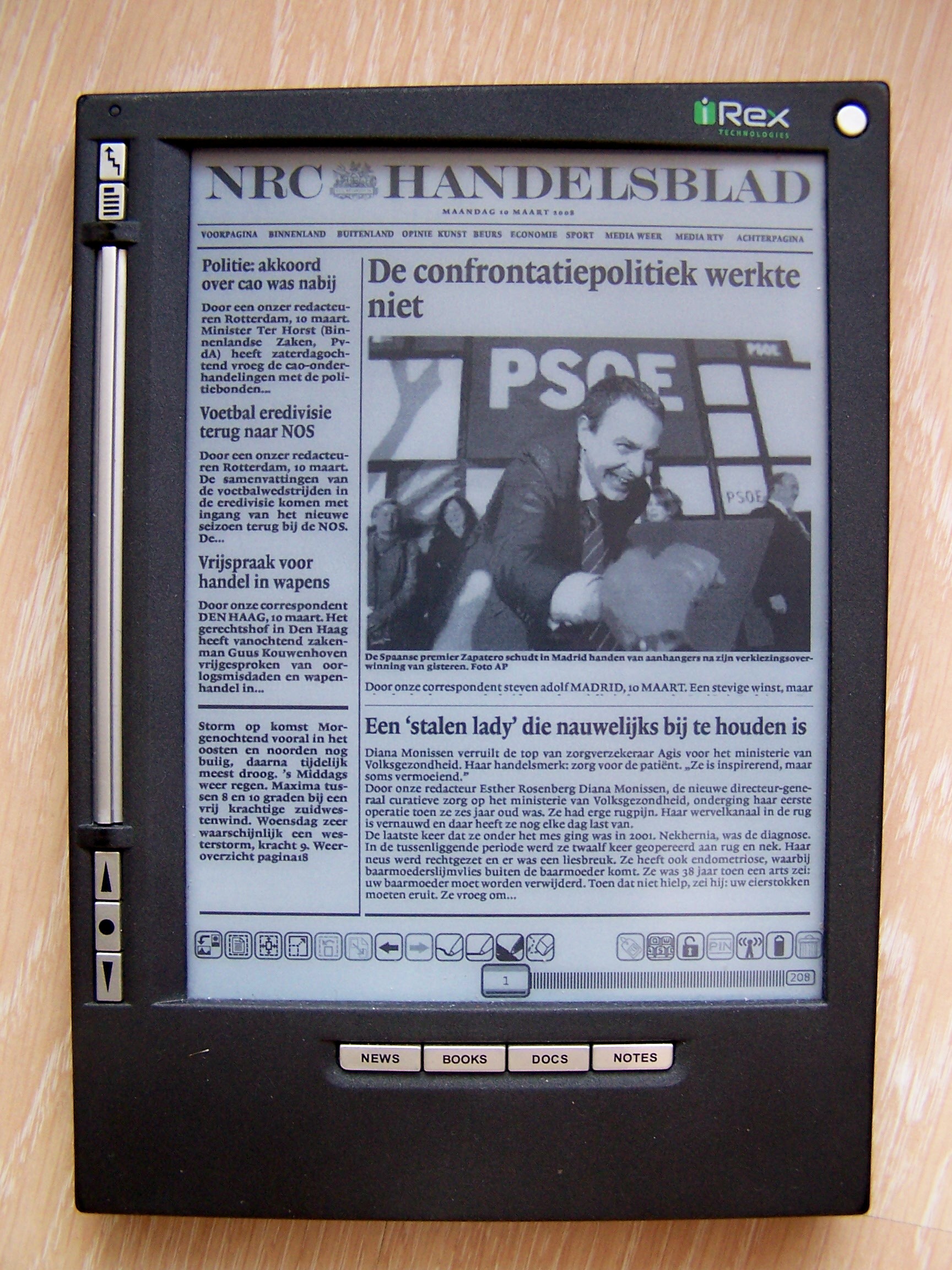 J'ai remis en tête, pour mémoire, les images des éditions du NRC Handelsblad et des Echos. La Une de La Stampa se présente comme celle du quotidien holllandais avec une présentation assez semblable à la Une d'un quotidien en papier. Comme d'habitude, quelques premières lignes proposées et une invitation à lire la suite "Continua". J'ai comme dans l'idée que les blancs dans la Une que j'ai actuellement vont vite se remplir par des espaces publicitaires! On retrouve en haut l'ensemble des rubriques (8 en tout) sur lesquelles il suffit de cliquer avec le stylet pour un accès direct. A chaque rubrique, l'ensemble des articles avec quatre lignes et la mention de l'auteur de l'article. A la différence du NRC Handlesblad qui avait choisi un multicolonnage par 3 colonnes (Les Echos une seule colonne de texte), La Stampa a préféré, avec bonheur je trouve, une version du journal à deux colonnes. Le choix du caractère est très bon, la lecture très fluide et agréable, les pages défilent rapidement. Le recours au gras pour légender les photos ou résumer brièvement l'article en chapeau. On sait toujours dans quelle rubrique l'on se trouve avec l'affichage de celle-ci en haut à droite de chaque page. On revient à la page précédemment consultée avec la flèche en bas du navigateur. J'ai retrouvé les automatismes habituels sur l'Iliad. Pour un nouveau lecteur, quelques dizaines de minutes suffisent à intégrer les réflexes de navigation. Photographies sur une colonne donc, toujours celle de gauche, qui offre à la fois la taille nécessaire pour une bonne lisibilité, cette lecture en deux colonnes est à mon avis le bon choix. La Stampa aura su tirer profit des expériences précédentes, c'est indéniable. De quoi regretter, une nouvelle fois, le peu d'intérêt en France pour une telle diffusion. Le Monde ou Libération, par exemple, pourraient être proposé de manière idéale avec ce type de maquette. Sans parler de la politique des prix, rappelons les offres de La Stampa qui mettent le journal du jour au environ de 0,30€! (son journal à deux francs, rappelez-vous). Décidément, je regrette bien de ne pas pratiquer la langue d'Alde Manuce pour sauter le pas!