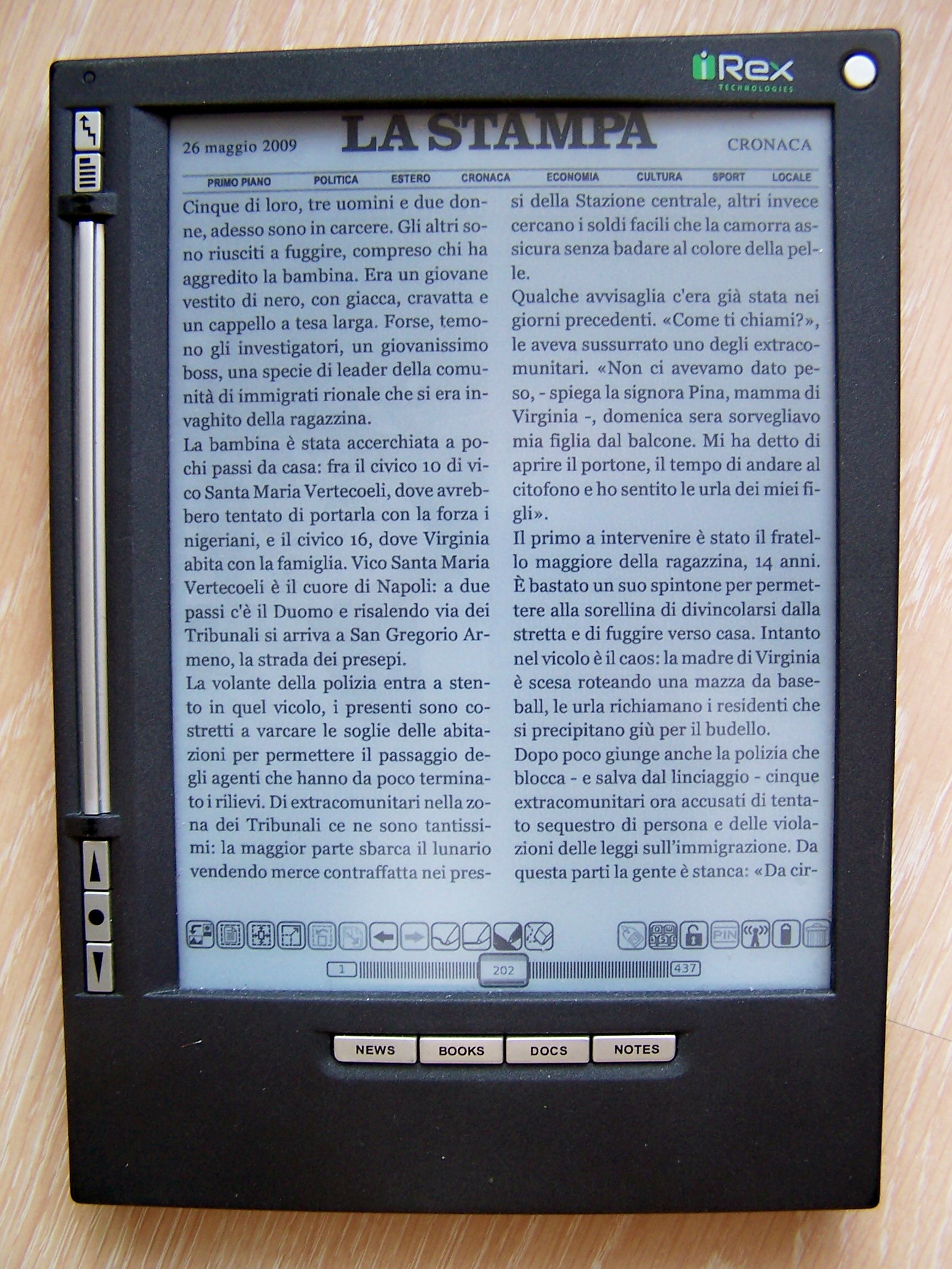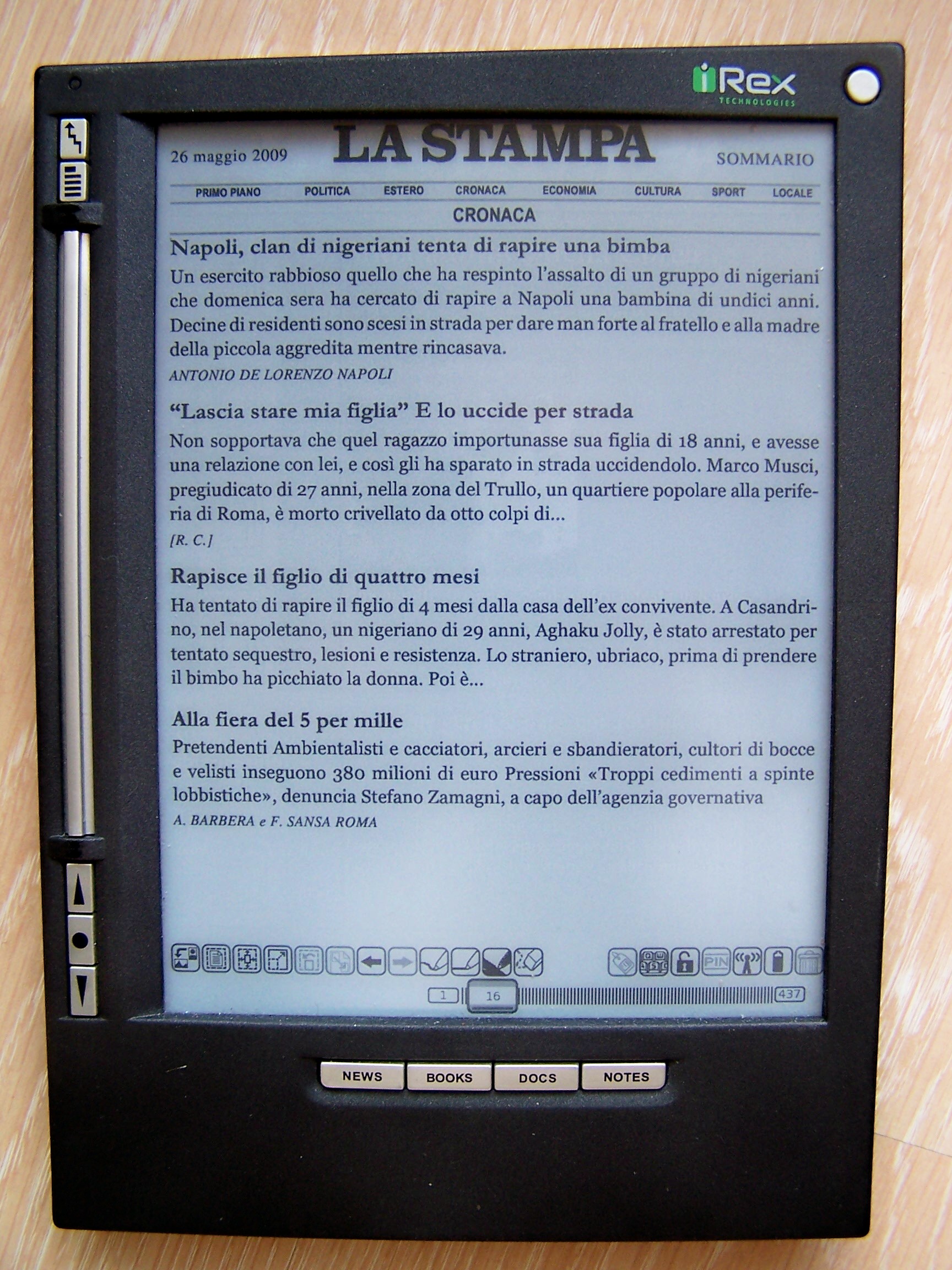 Une fois la version du jour récupérée, elle s'installe automatiquement dans la rubrique News du lecteur. Il suffit de l'ouvrir soit avec le stylet soit avec le bouton de navigation. On rappelera que le stylet est au coeur de la navigation de ces lecteurs à la surface tactile. Comme dans le cas des autres quotidiens, La Stampa diffuse une version PDF, le seul format qui puisse permettre une maquette aussi ellaborée et qui soit satisfaisante tant au niveau typographique que dans la navigation avec les liens.