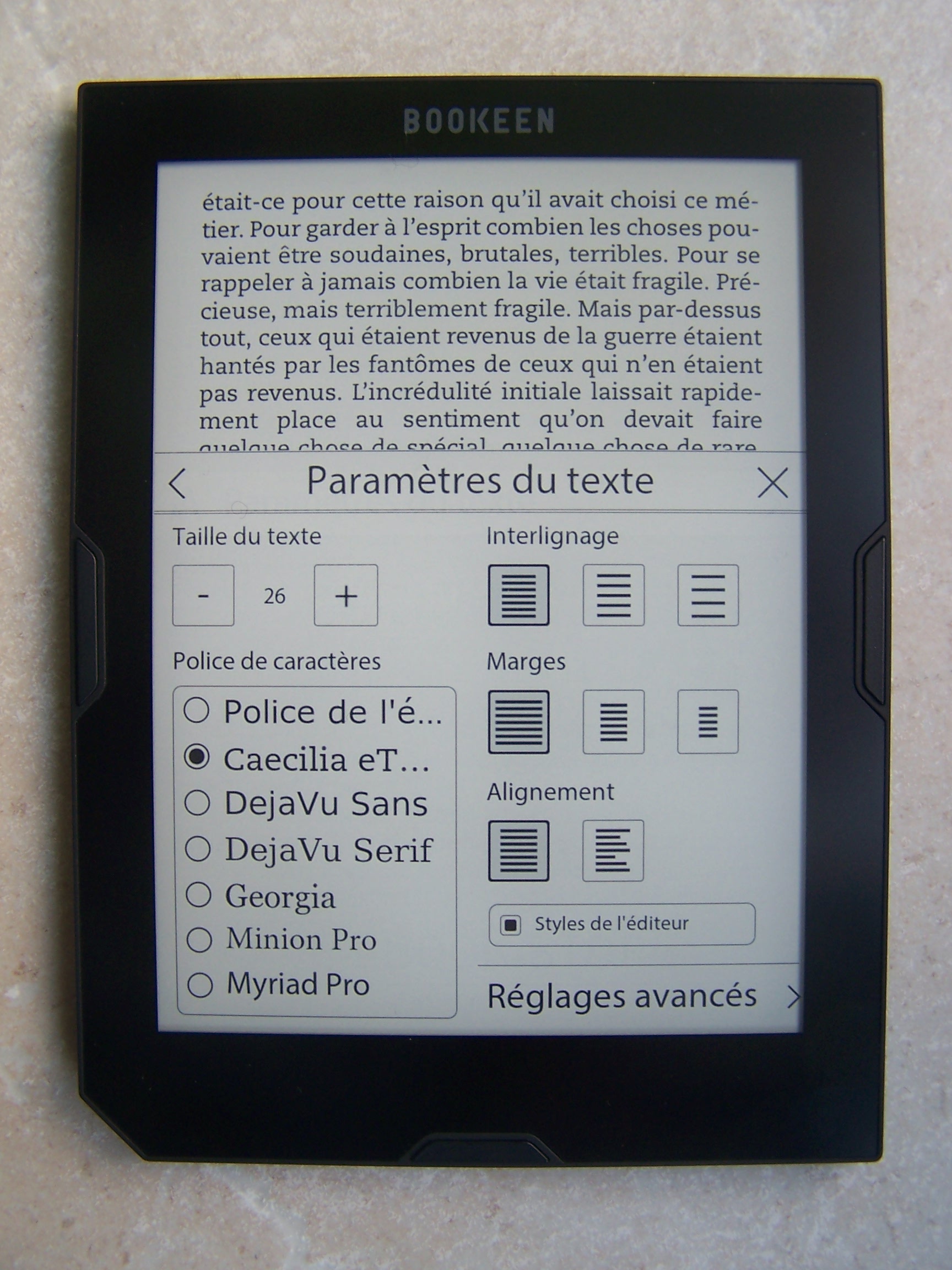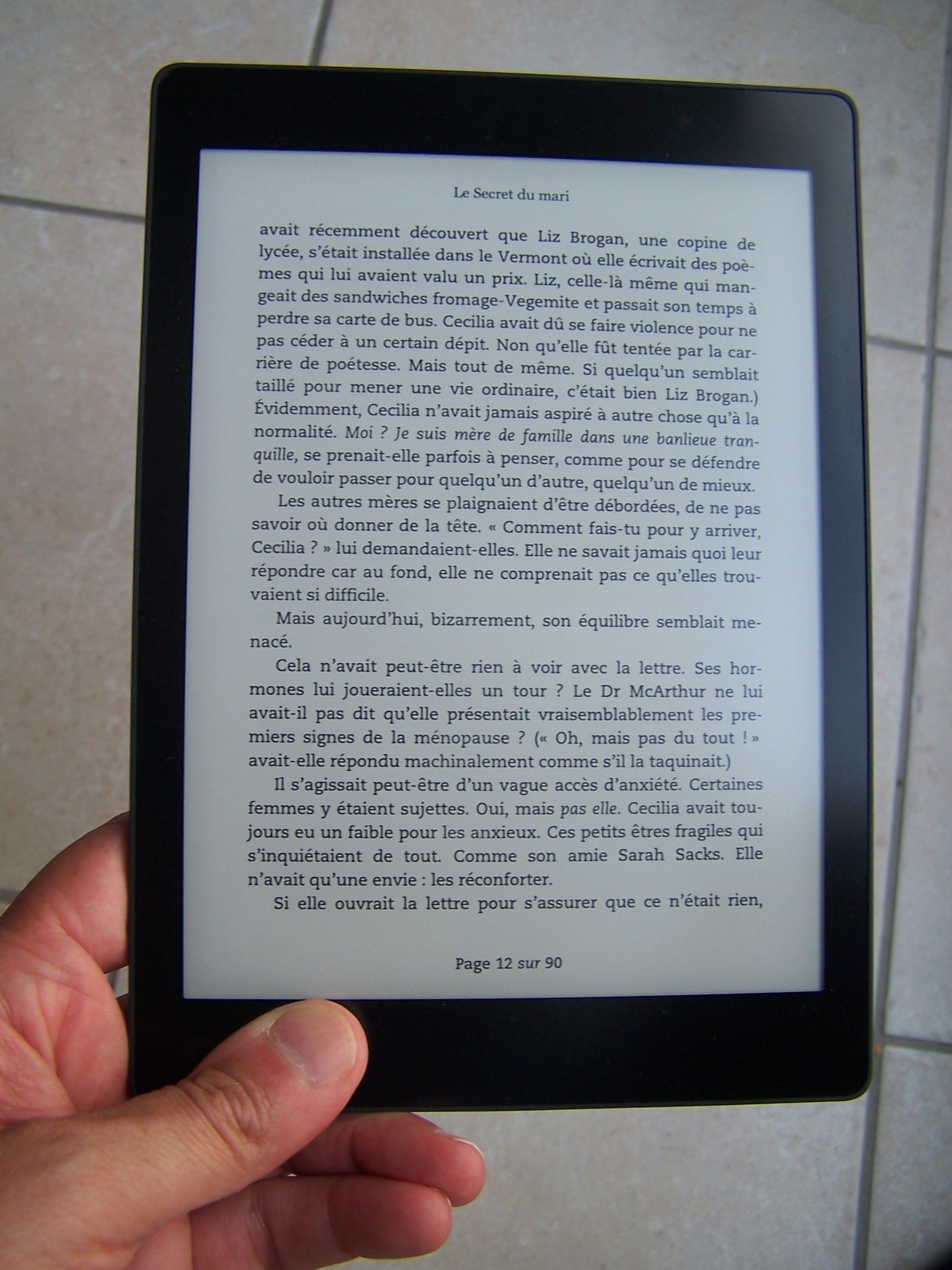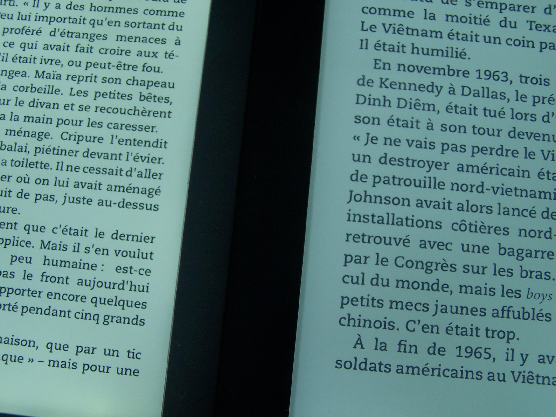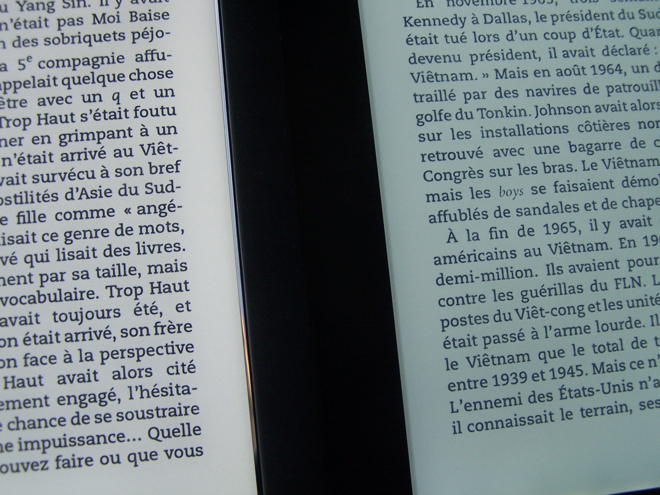 J'avais un peu peur aussi concernant la définition des caractères, un peu moins bon que pour les liseuses eInk récentes. En mode HD, on a le noir et blanc en 300PPI. Là aussi avec le contraste un peu en deçà, c'est tout à fait acceptable à l'usage; il vous suffira aussi d'utiliser des polices un peu plus grasses, qui vous apporteront un bon contraste.