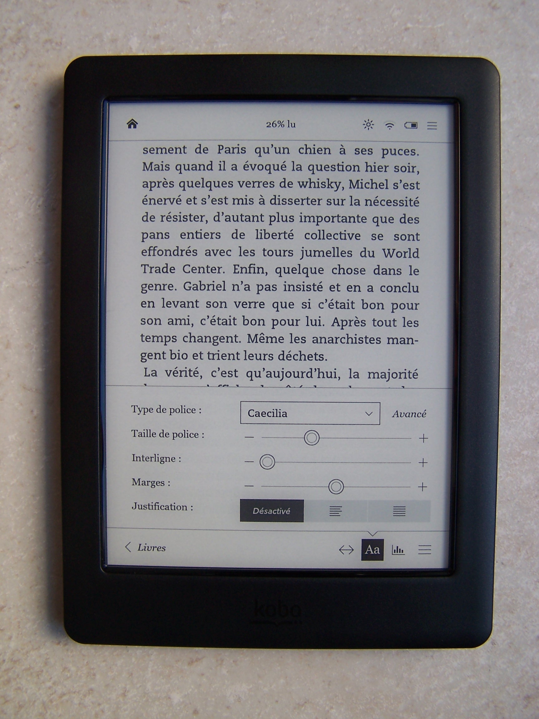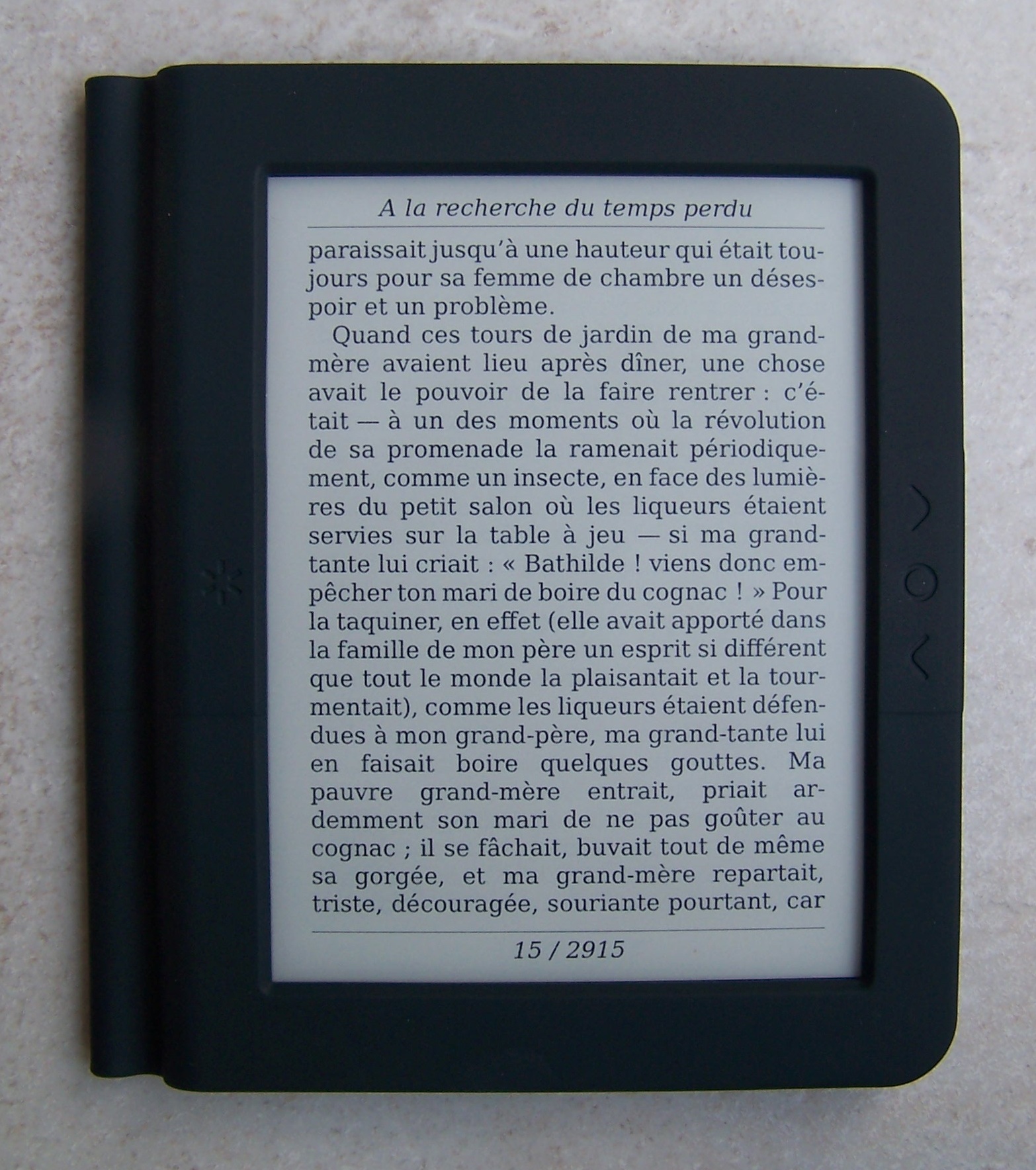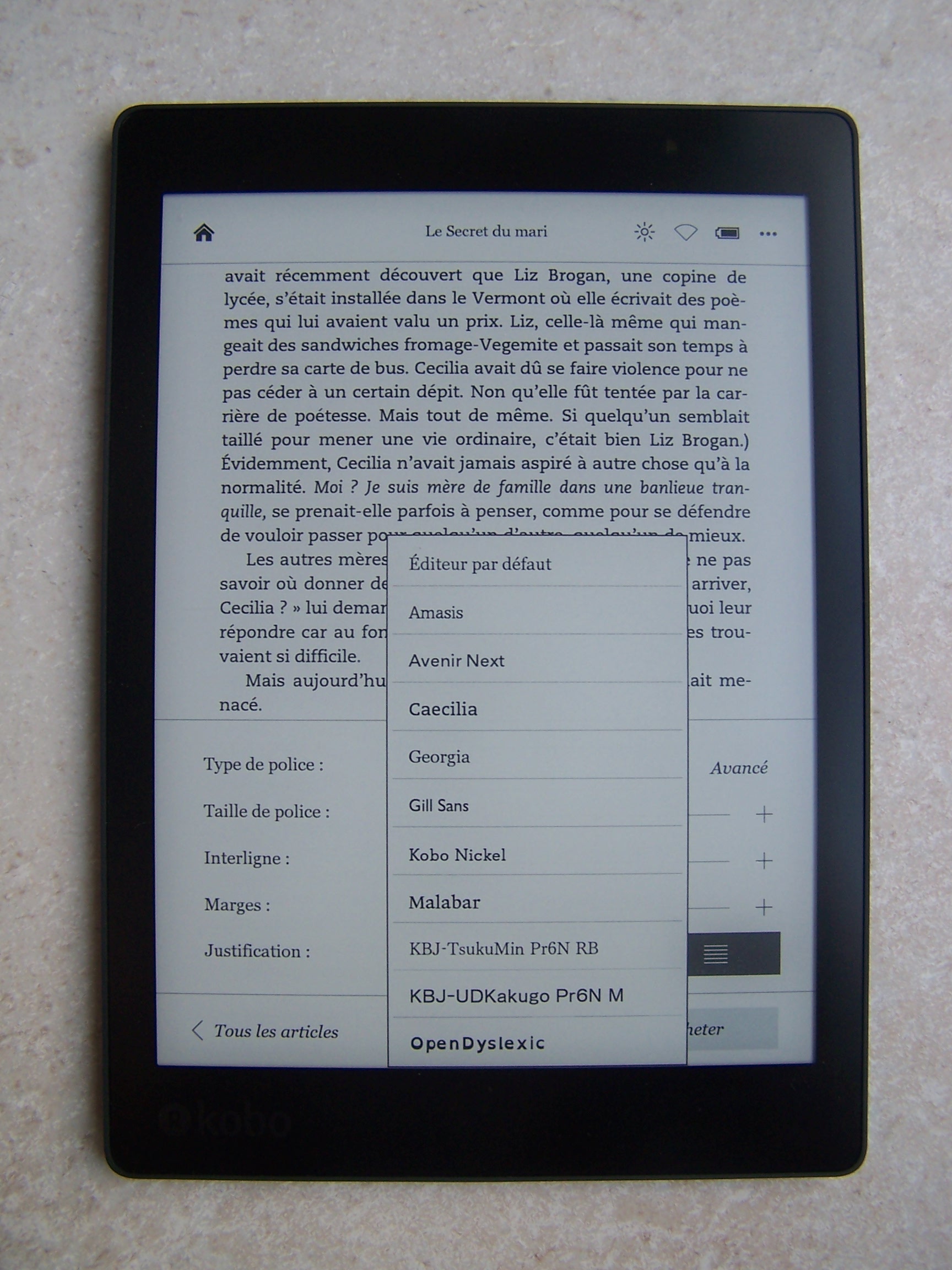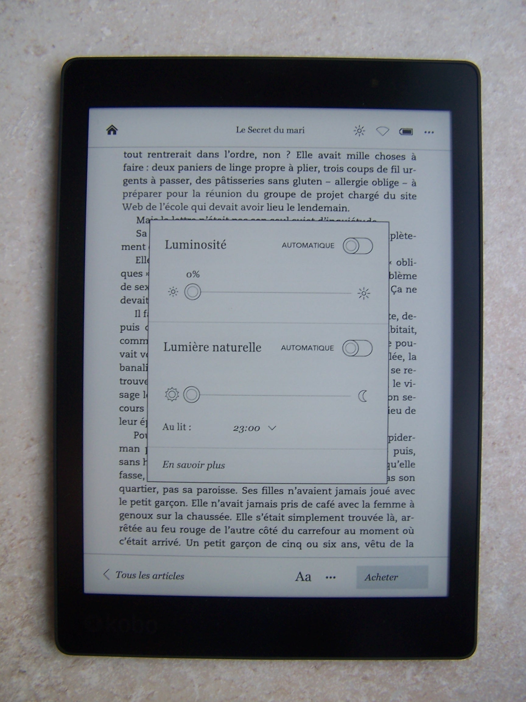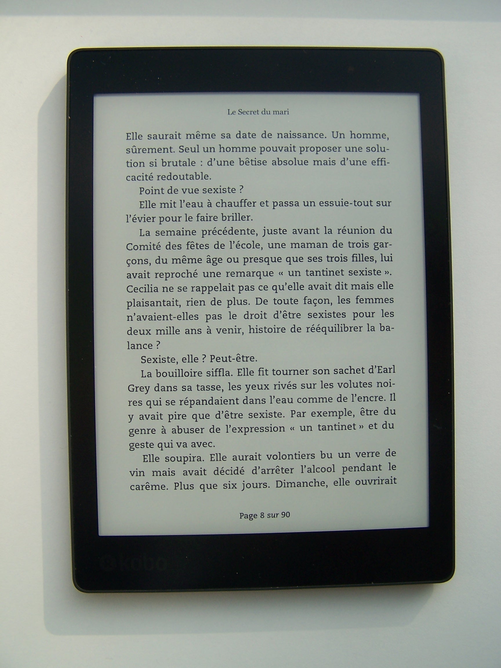 J'avais un peu peur aussi concernant la définition des caractères, un peu moins bon que pour les liseuses eInk récentes. En mode HD, on a le noir et blanc en 300PPI. Là aussi avec le contraste un peu en deçà, c'est tout à fait acceptable à l'usage; il vous suffira aussi d'utiliser des polices un peu plus grasses, qui vous apporteront un bon contraste.