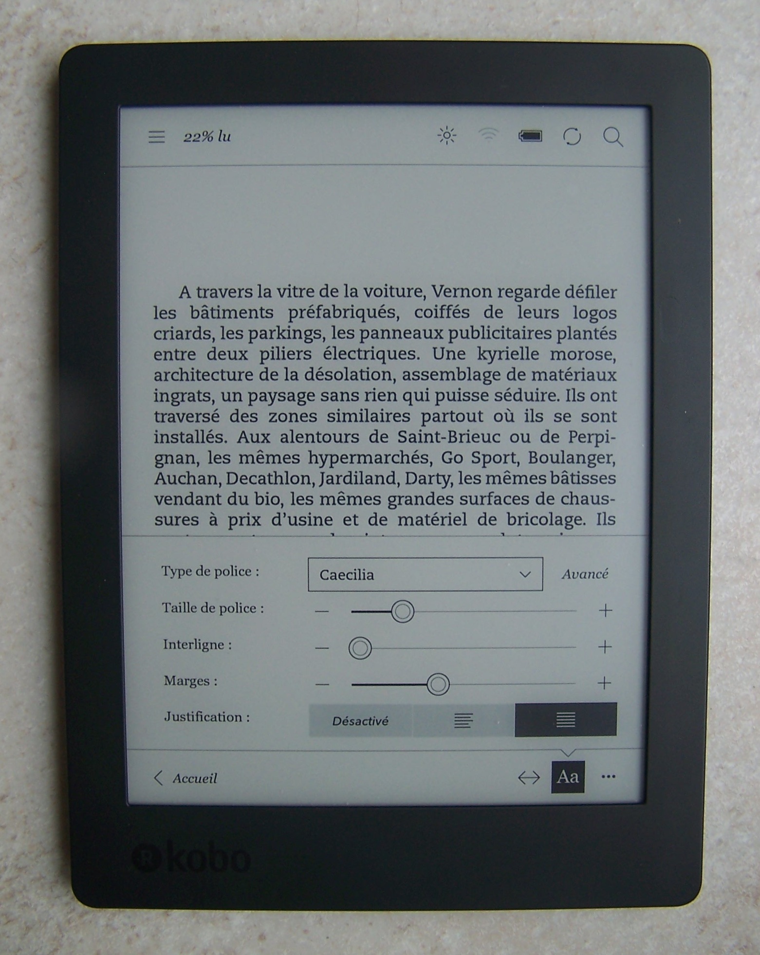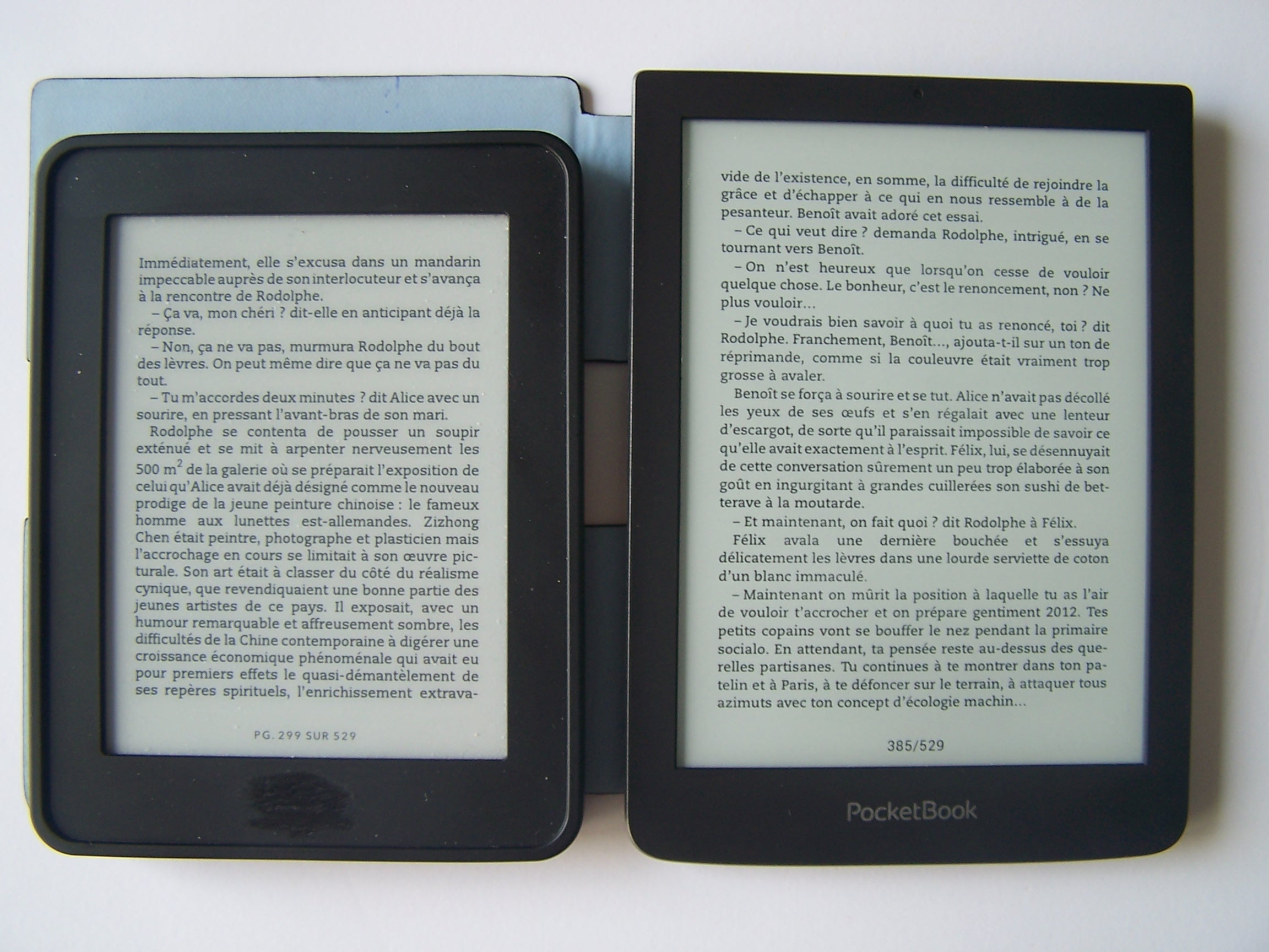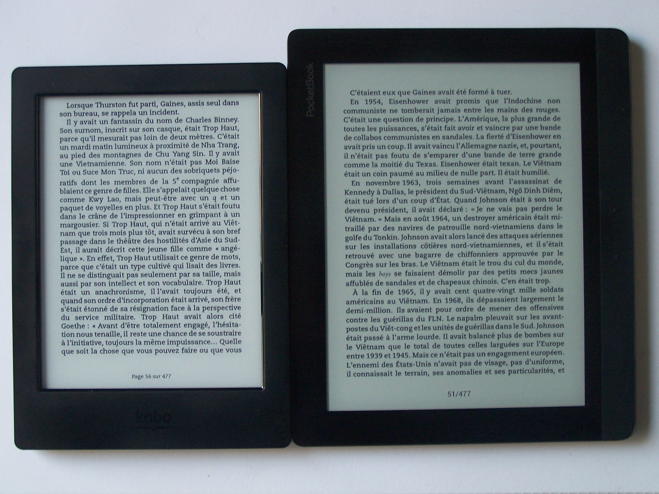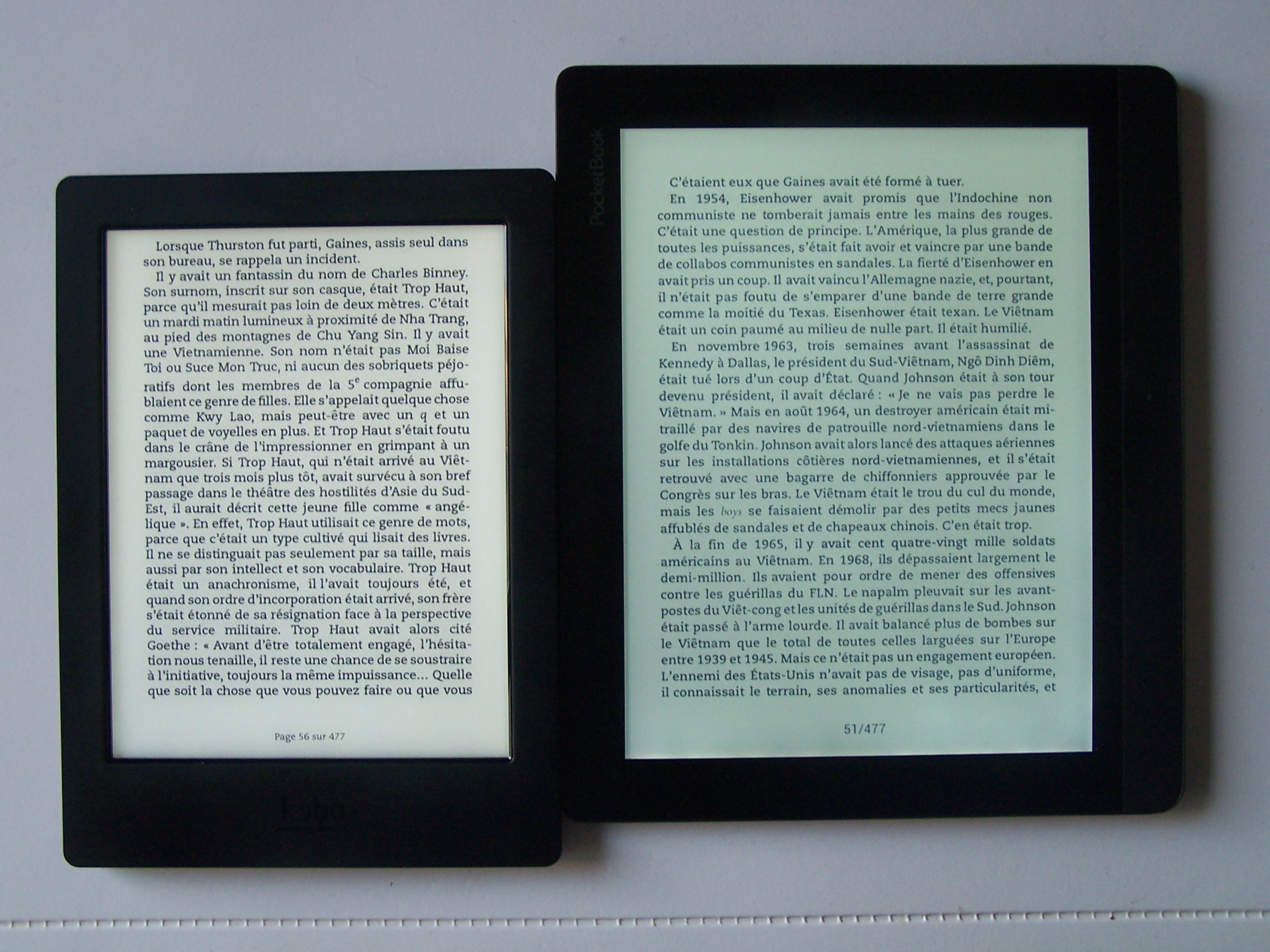 J'avais un peu peur aussi concernant la définition des caractères, un peu moins bon que pour les liseuses eInk récentes. En mode HD, on a le noir et blanc en 300PPI. Là aussi avec le contraste un peu en deçà, c'est tout à fait acceptable à l'usage; il vous suffira aussi d'utiliser des polices un peu plus grasses, qui vous apporteront un bon contraste.
