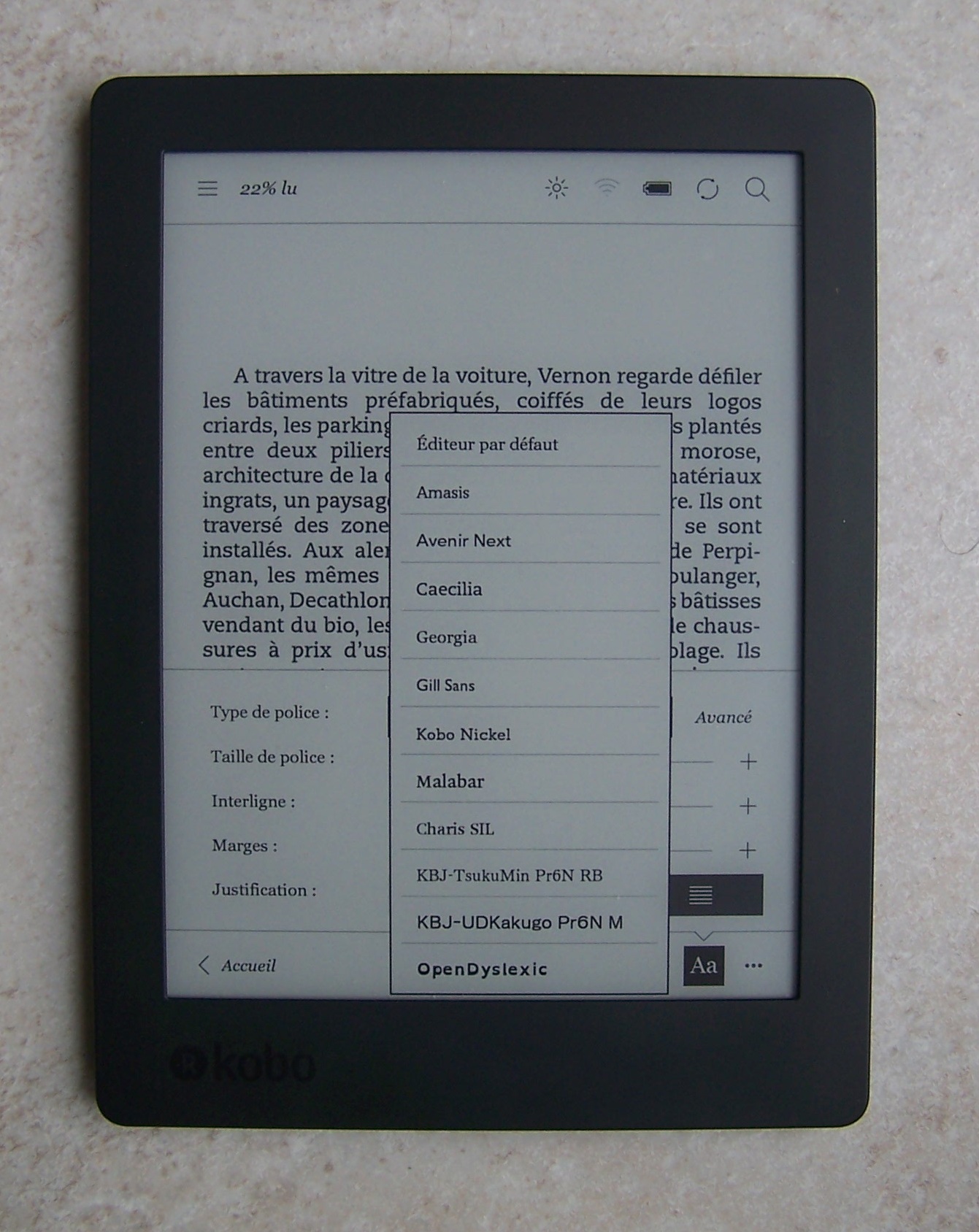 Pour l'ePub, c'est excellent aussi. Plein de réglages possibles pour affiner la présentation des pages. Je me suis bien sûr empresser de télécharger mes polices de lecture favorites, comme d'habitude. J'ai juste créé un petit dossier "Fonts", simple au possible. Il retrouve automatiquement les polices aussi bien dans le lecteur intégré que dans les applications de lecture.