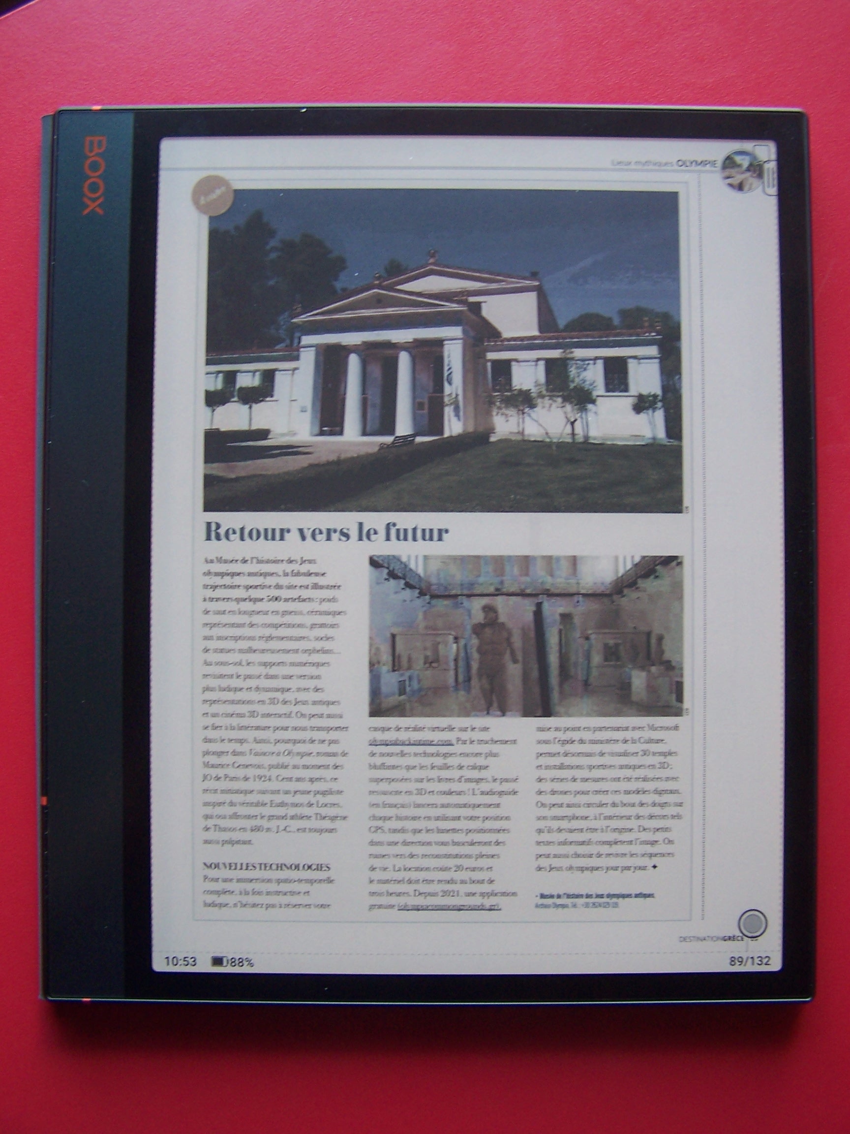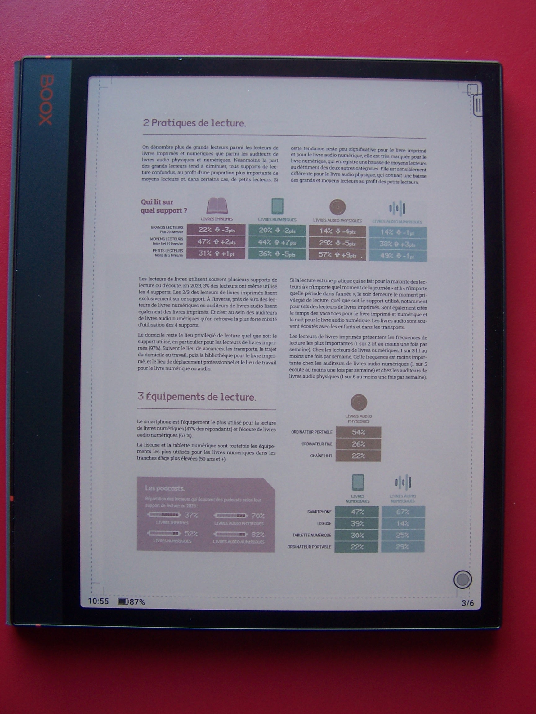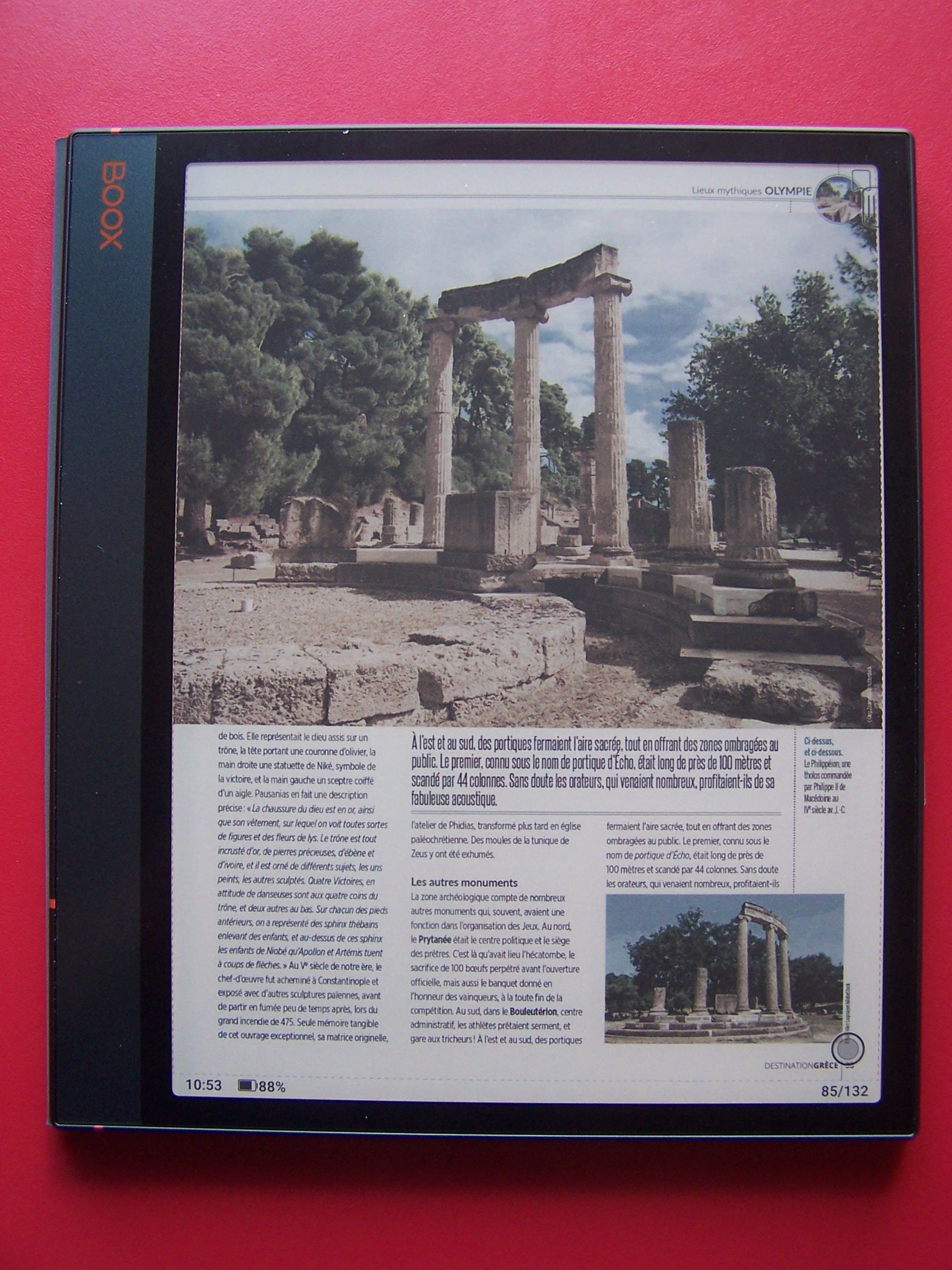 Verdict: En conclusion de ce test, un sentiment très favorable pour cet Onyx Boox Note Air 3. Un modèle très complet et ouvert qui, une fois que l'on aura pris son parti de l'affichage doux des images couleurs, se révèlera intéressant en mobilité (mais pas que) pour des gros lecteurs de contenus, au sens le plus large possible. Un prix élevé bien sûr qui va décourager beaucoup d'entre vous pour des usages qui ne seront pas professionnels ou semi-professionnels. Mais à y regarder d'un peu plus près, il peut aussi tout à fait s'envisager dans un usage privé ou familial pour des gros lecteurs qui souhaitent peu à peu s'émanciper de leurs smartphones ou de leurs tablettes/ordinateurs pour lire de manière confortable autant à domicile que bien sûr en mobilité. Se poser la question de ses pratiques de lecture, qui plus est dans le cas d'un remplacement liseuse/tablette ou liseuse/ordinateur portable d'appoint que vous utilisez peu finalement, seulement pour la lecture de documents/pages web. Ces premiers modèles en Kaleido 3 confirment en tout cas que l'encre électronique couleur a un sens et qu'elle est promise à un bel avenir.