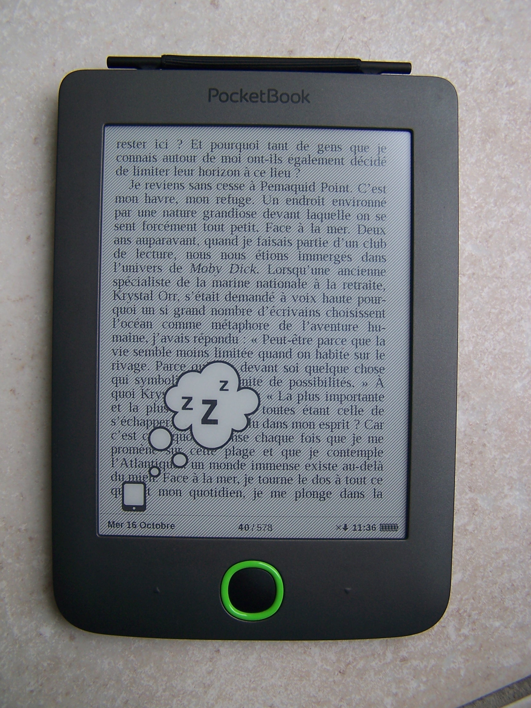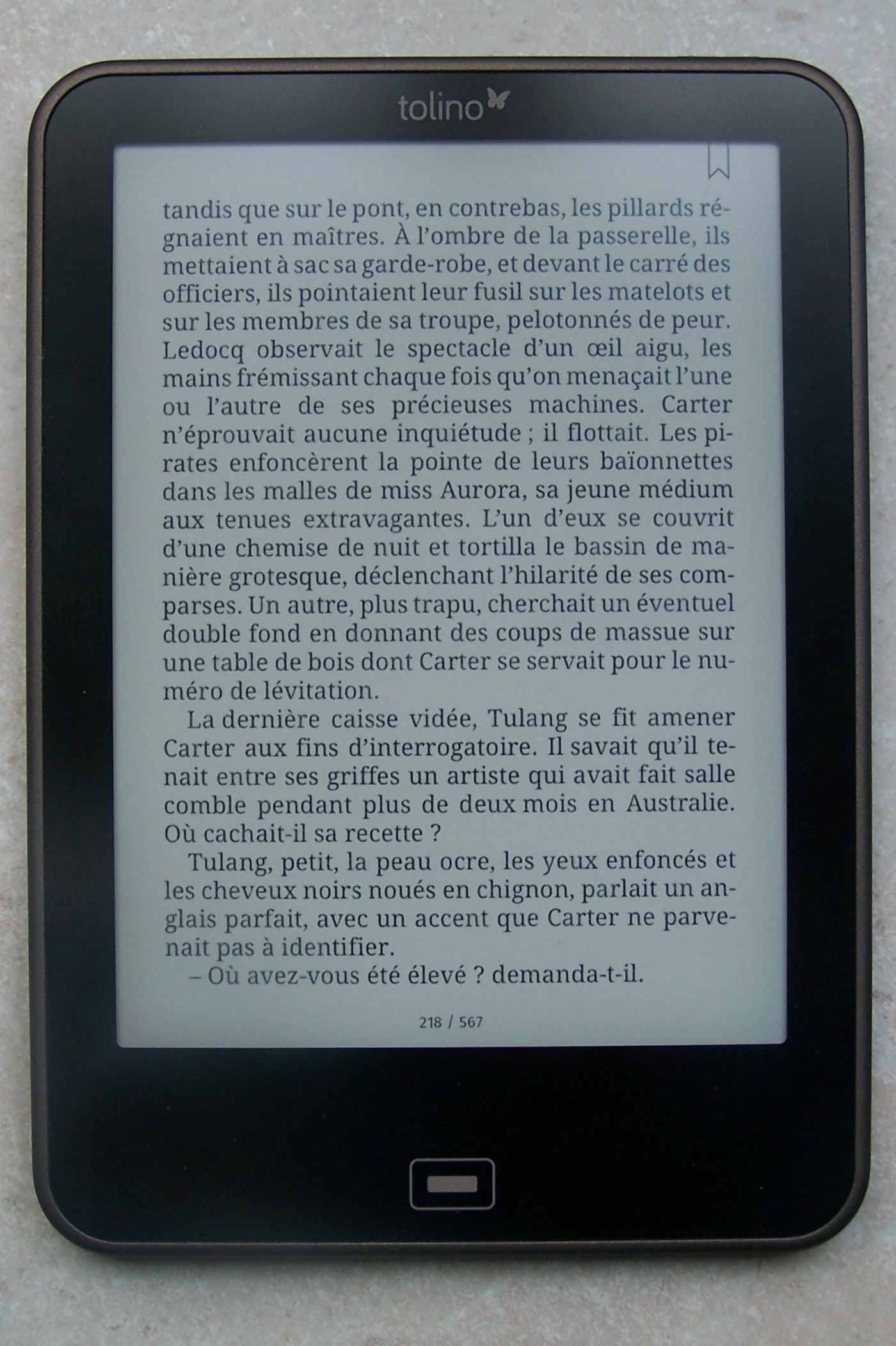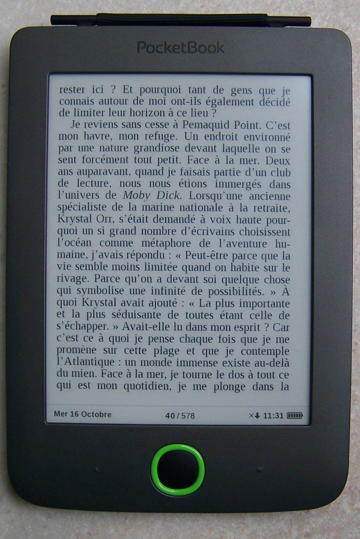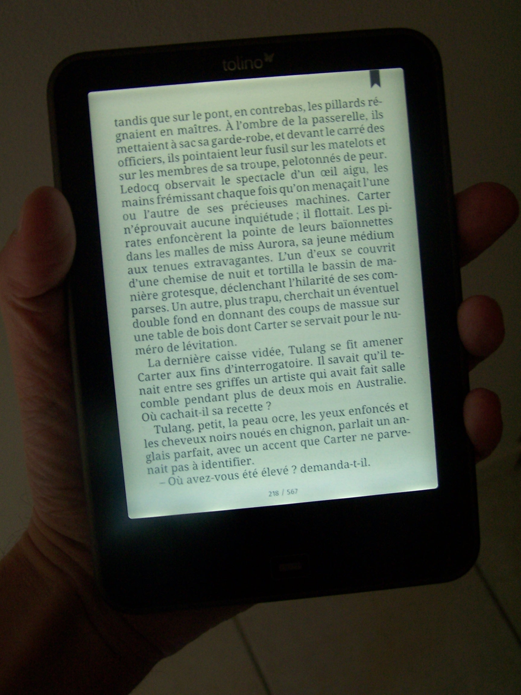 Eclairage intégré: Le choix de la dalle apporte indiscutablement un plus dans la qualité de l'éclairage intégré. Finies les diodes qui apparaissaient sur les côtés avec les petits halos de lumière inévitables. Une fonction qui permettra de lire dans des conditions de lumière difficile avec un écran gagnant en blancheur, voire de lire dans l'obscurité tard le soir sans réveiller l'autre. Facile, à tout moment un bouton au-dessus vous permettra d'allumer ou d'éteindre le livre électronique comme avec un interrupteur. Un détail intéressant, on peut modifier l'intensité lumineuse directement avec le doigt sur la dalle tactile. Par le menu, vous pourrez également régler l'intensité de la luminosité qui sera bien entendu conservée en mémoire. La lumière est très bonne, très naturelle. Comme pour les autres modèles, un réglage de la luminosité qui ne sert pas forcément à grand chose, on l'utilisera toujours entre 70 et 100% de sa valeur, enfin c'est mon impression. C'est bien entendu avec le rafraichissement de pages que les choses se gâtent. On tatonne, on essaye toutes les intensités d'éclairage, en moins vous avez le sentiment qu'il n'y a pas assez d'éclairage, en trop vous apercevez les petits défauts d'artefacts et de floutés dont j'ai parlé plus haut. Une frustration qui s'installe durablement au cours de la lecture et à laquelle vous ne trouvez malheureusement pas trop de solution. Bref, on a éliminé les halos et le flash mais pour faire apparaître d'autres défauts qui se révèlent plus gênants à la lecture. On s'habitue très bien au flash noir de temps en temps, beaucoup moins à des floutés de polices et à des "zonages" réguliers, disgracieux sur l'écran. On sent que la technologie est encore mal maitrisée, il faudrait des points plus petits et que l'initialisation du fond soit tout à fait "propre", loin d'être le cas ici. Je force peut-être un peu le trait mais même au bout de nombreux jours de lecture, la même petite gêne persiste. C'est dommage donc, car la dalle apporte indubitablement un plus pour l'éclairage intégré et on se met à penser à une dalle de ce type sur l'ancienne technologie avec des fonds propres.
