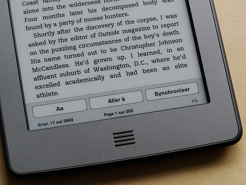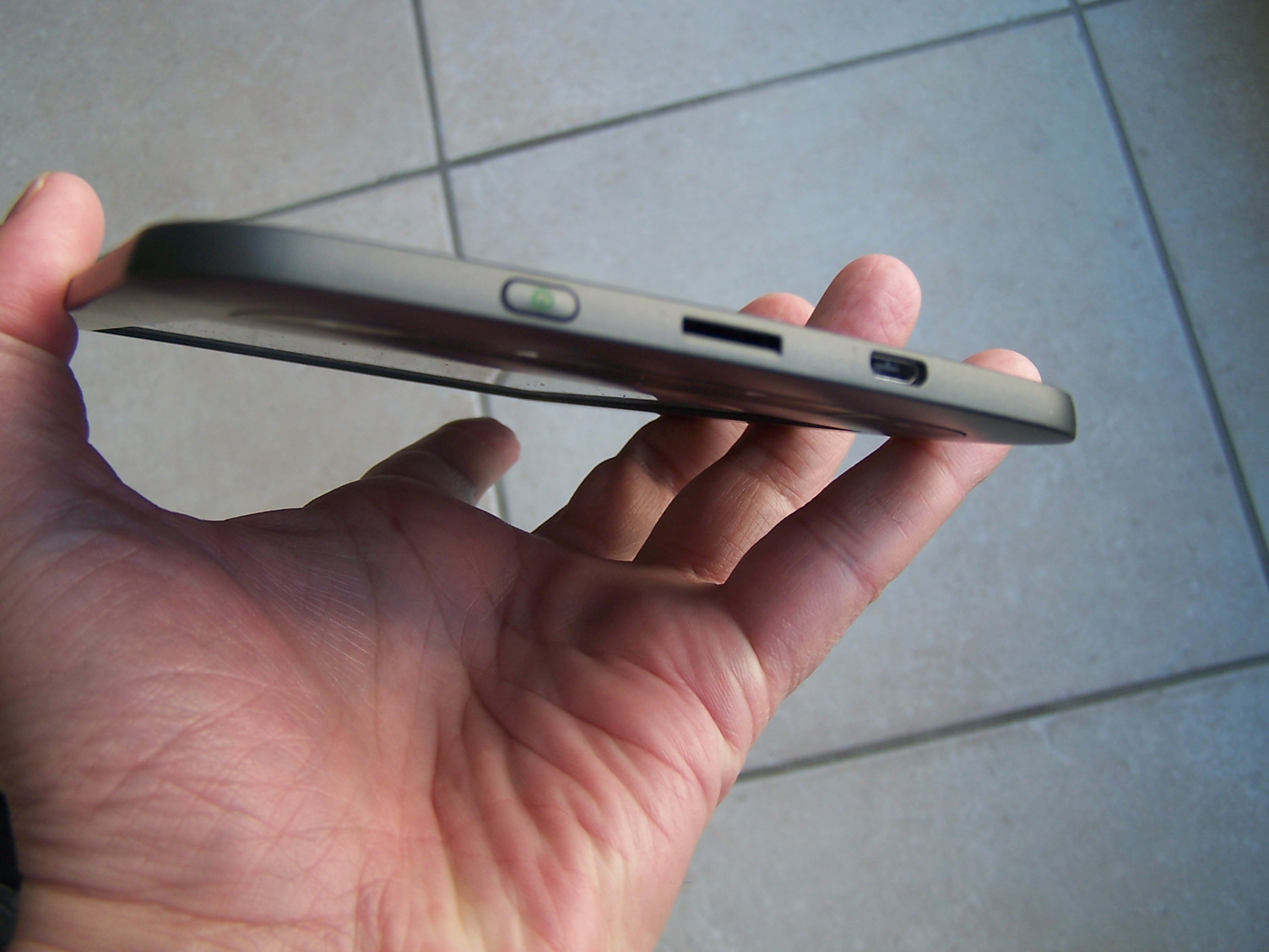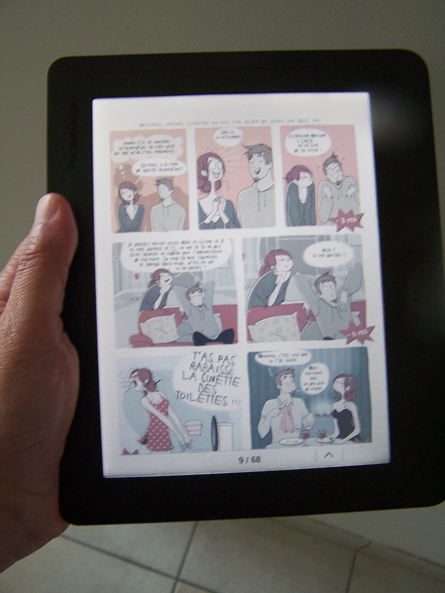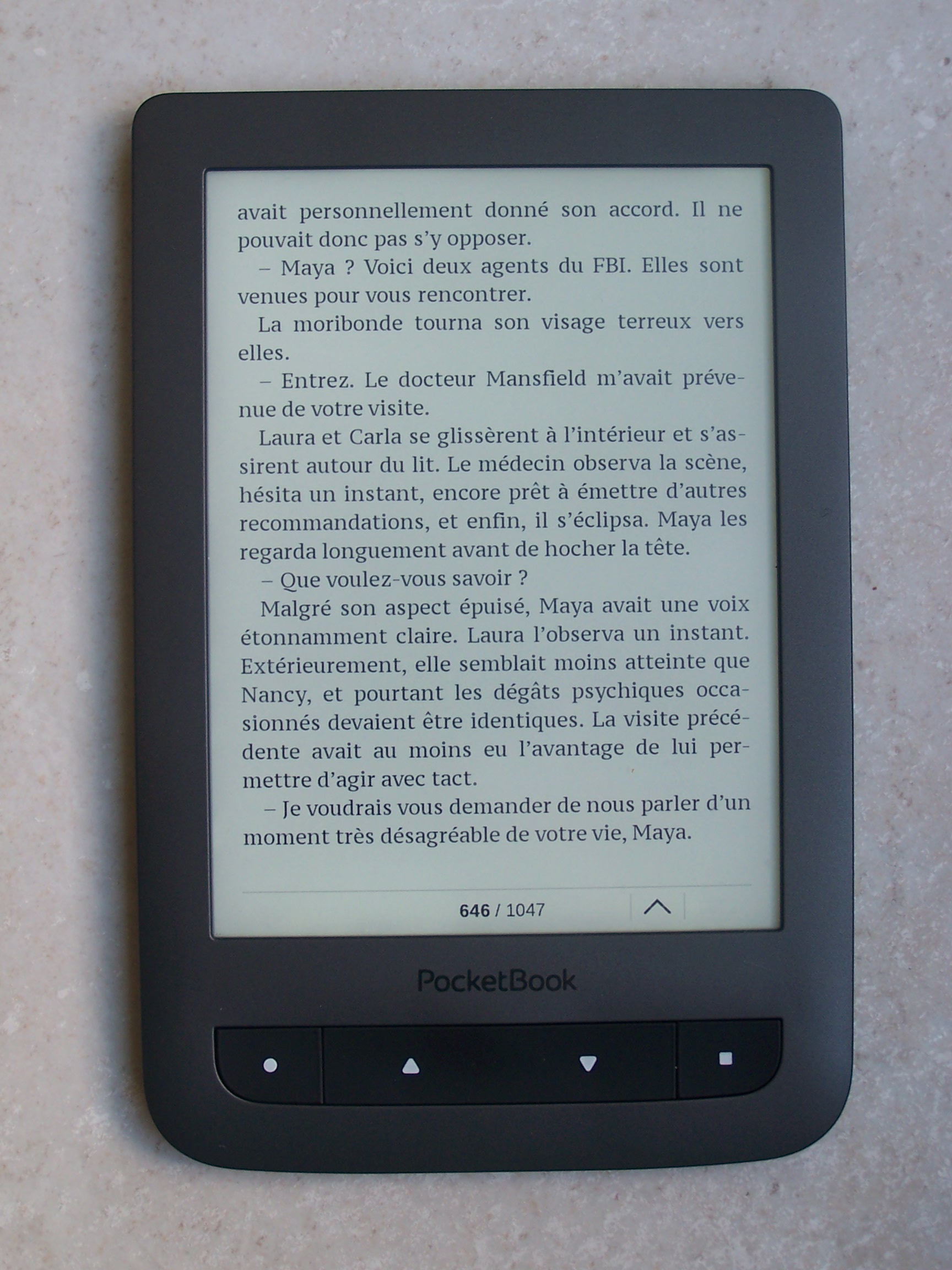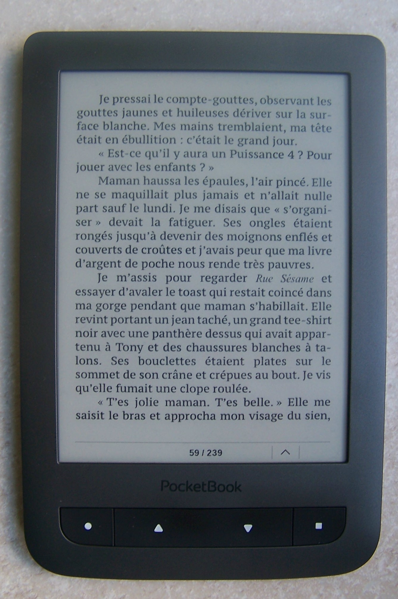 Eclairage intégré: Le choix de la dalle apporte indiscutablement un plus dans la qualité de l'éclairage intégré. Finies les diodes qui apparaissaient sur les côtés avec les petits halos de lumière inévitables. Une fonction qui permettra de lire dans des conditions de lumière difficile avec un écran gagnant en blancheur, voire de lire dans l'obscurité tard le soir sans réveiller l'autre. Facile, à tout moment un bouton au-dessus vous permettra d'allumer ou d'éteindre le livre électronique comme avec un interrupteur. Un détail intéressant, on peut modifier l'intensité lumineuse directement avec le doigt sur la dalle tactile. Par le menu, vous pourrez également régler l'intensité de la luminosité qui sera bien entendu conservée en mémoire. La lumière est très bonne, très naturelle. Comme pour les autres modèles, un réglage de la luminosité qui ne sert pas forcément à grand chose, on l'utilisera toujours entre 70 et 100% de sa valeur, enfin c'est mon impression. C'est bien entendu avec le rafraichissement de pages que les choses se gâtent. On tatonne, on essaye toutes les intensités d'éclairage, en moins vous avez le sentiment qu'il n'y a pas assez d'éclairage, en trop vous apercevez les petits défauts d'artefacts et de floutés dont j'ai parlé plus haut. Une frustration qui s'installe durablement au cours de la lecture et à laquelle vous ne trouvez malheureusement pas trop de solution. Bref, on a éliminé les halos et le flash mais pour faire apparaître d'autres défauts qui se révèlent plus gênants à la lecture. On s'habitue très bien au flash noir de temps en temps, beaucoup moins à des floutés de polices et à des "zonages" réguliers, disgracieux sur l'écran. On sent que la technologie est encore mal maitrisée, il faudrait des points plus petits et que l'initialisation du fond soit tout à fait "propre", loin d'être le cas ici. Je force peut-être un peu le trait mais même au bout de nombreux jours de lecture, la même petite gêne persiste. C'est dommage donc, car la dalle apporte indubitablement un plus pour l'éclairage intégré et on se met à penser à une dalle de ce type sur l'ancienne technologie avec des fonds propres.