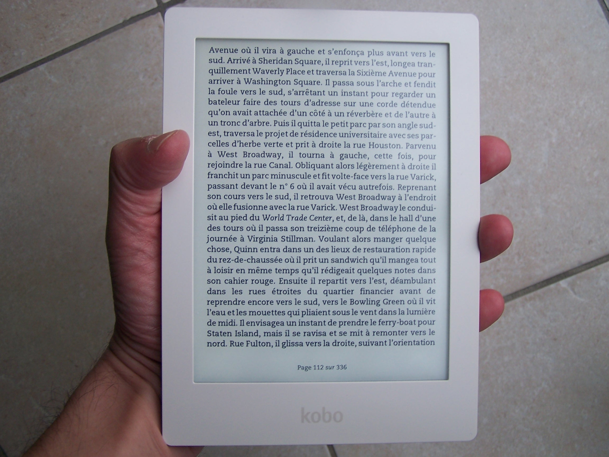 Maintenant allumage et je dois dire que ça se gâte un peu pour moi. L'écran Pearl HD est certes bon en terme de définition. En revanche, je suis toujours forcé de constater que l'on sacrifie très nettement sur un fond gris de l'écran. Vous verrez les photos comparatives avec les modèles Mini et Touch, gris c'est gris. Qu'est-ce qui est de la dalle, qu'est-ce qui est de la technologie ClarityScreen et de l'éclairage intégré Comfortlight? Le résultat est décevant à l'arrivée pour les amateurs de papier électronique avec un écran qui arrive tout juste au niveau des anciens écrans Vizplex. Si vous possédez déjà un modèle plus ancien, vous verrez tout de suite la différence. Vous devrez sans doute passer à l'éclairage intégré, même en lumière du jour, pour être complètement satisfait. Petite déception à ce niveau-là pour moi. C'est quand même paradoxal qu'à l'heure où eInk progresse sur le contraste fond d'écran/ noir des caractères, nous ayons des modèles haut-de-gamme qui nous renvoie quelques années en arrière sous prétexte d'une option aussi plébiscitée soit-elle. Cette option de la lumière intégré n'en est plus du tout une, pourquoi d'ailleurs mettre un bouton marche/arrêt? J'exagère à peine tant la lecture "naturelle" me semble éloignée de ce modèle. Je suis peut-être un peu dur mais il faut se poser les bonnes questions et ne pas sacrifier tout à l'éclairage, surtout qu'il n'est pas exempt de reproches, on va le voir. Autre aspect important, c'est le rafraichissement de l'écran, le fameux flash noir que Kobo nous propose ici de maitriser avec une technologie baptisée "Regal". Jusqu'ici les modèles proposaient un rafraichissement au mieux toutes les dix pages. Kobo en collaboration avec eInk a mis au point un rafraichissement page à page moins visible sur la base d'une texture de l'écran en "diamants". A chaque changement de page, vous verrez imperceptiblement apparaitre une multitude de points très petits dans le fond. Si la perception est dérisoire sans lumière, en revanche avec une lumière assez forte, on les perçoit plus à l'oeil. Ces points "flashent" imperceptiblement notre oeil, une impression encore renforcée avec une lumière du jour intense. D'autre part apparaissent aussi des polices floues, des artéfacts pendant ces changements de page. Une impression personnelle à la lecture de plusieurs livres depuis quelques semaines et qui est confirmé sur plusieurs forums (voir par exemple ces photos) ainsi que le site TheEbookReader qui pointe également le problème avec une série de photos. Le moins que l'on puisse dire, c'est que le résultat est encore mal maîtrisé, c'est bien dommage surtout pour un modèle haut-de-gamme. Bien entendu cet aspect à des conséquences sur l'éclairage intégré.