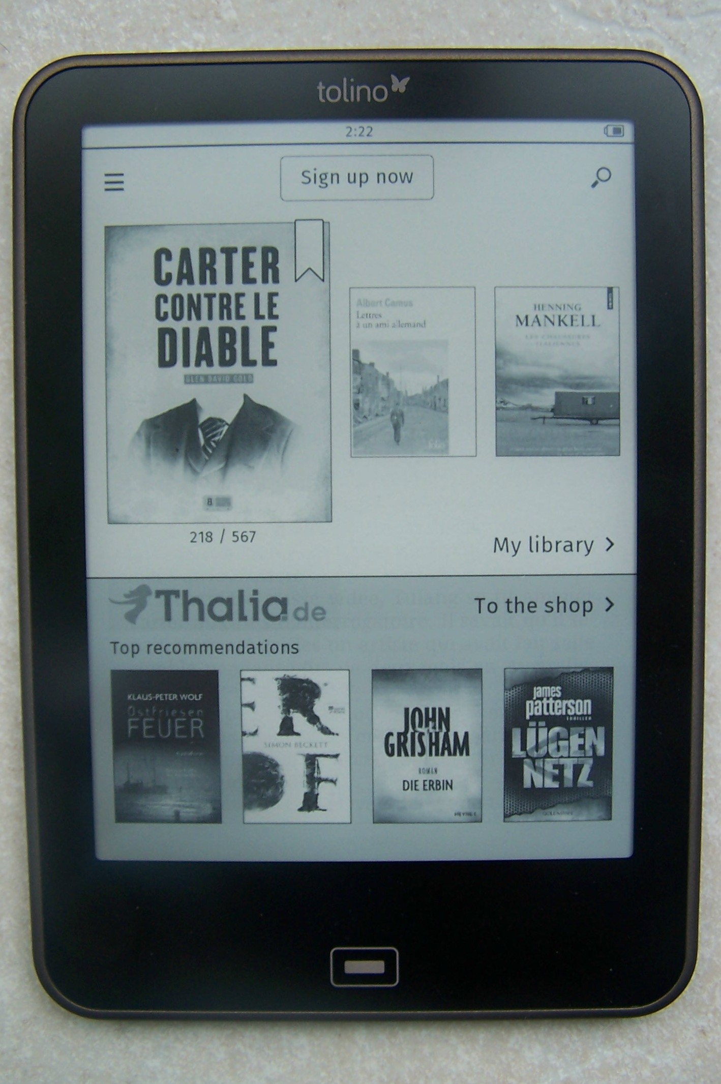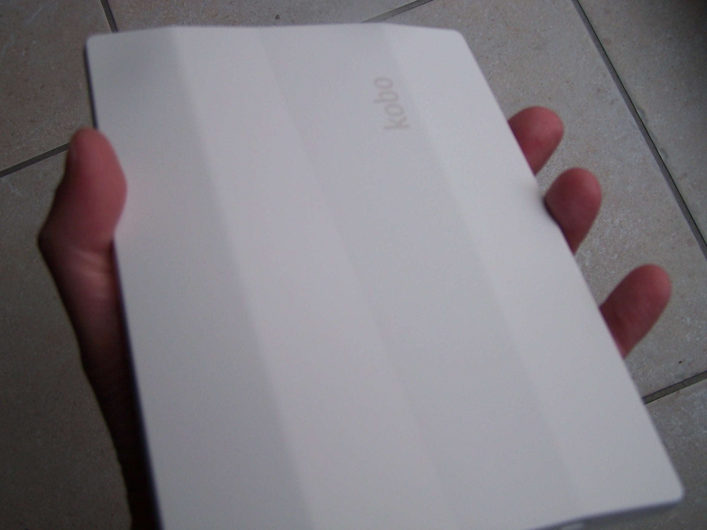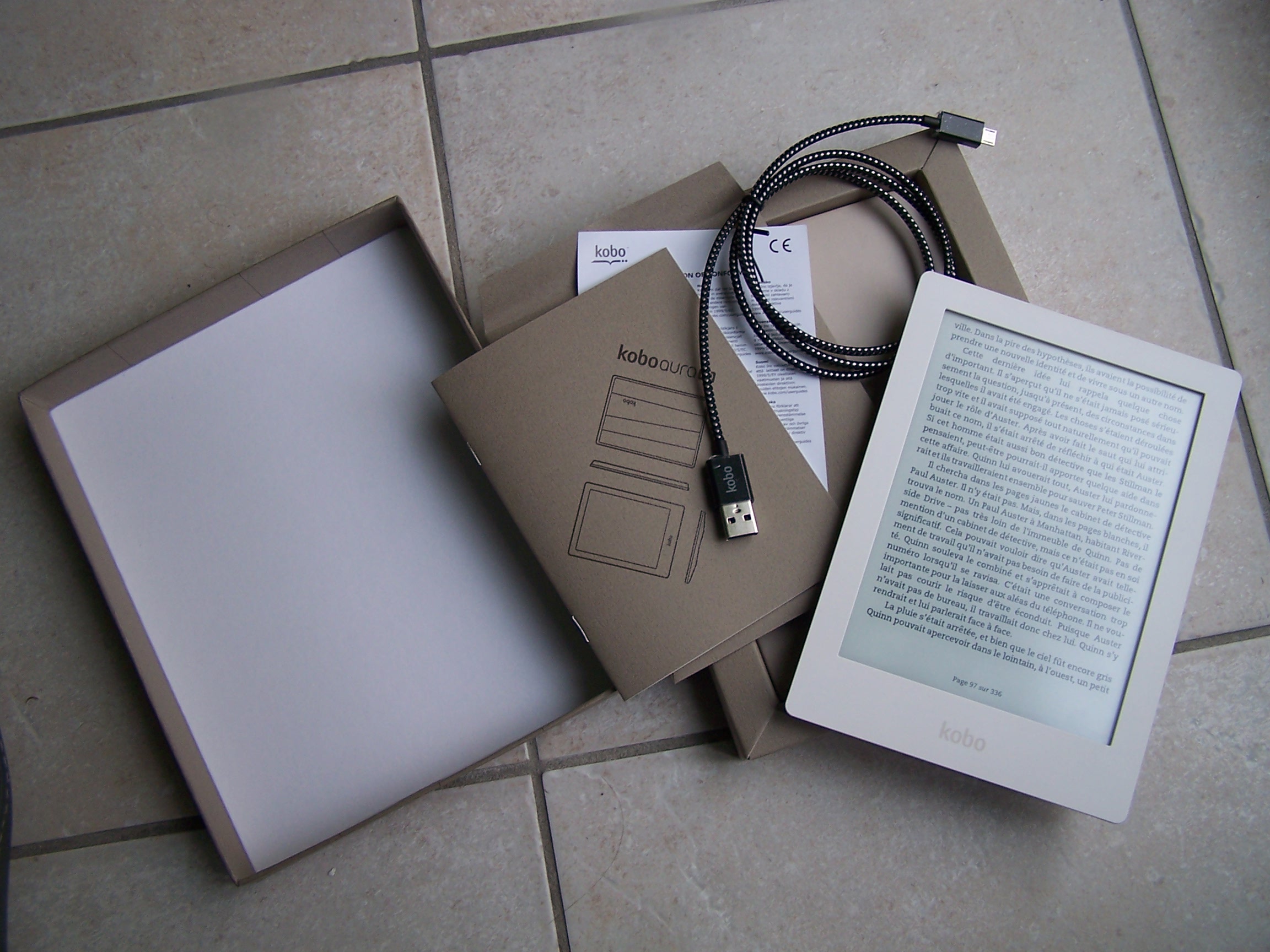 Prise en main: Côté packaging, pas grand chose à dire. Boite simple. Autant Kobo avait fait plus d'efforts sur la version Aura HD, autant celui-ci est calqué sur les autres modèles moins chers. Le Kobo Aura est accompagné d'un cordon usb tout simple. Un petit mode d'emploi minimaliste. Ce qui frappe d'emblée avec ce nouveau modèle, c'est le design de la partie supérieure avec la surface de l'écran. Fini l'écran en profondeur avec des bords, nous avons désormais une surface unie de la dalle qui rappelle smartphones et tablettes. Le Kobo Aura est le premier modèle de ce type avec une dalle capacitive. J'ai demandé des renseignements complémentaires à Kobo: "Le haut de l'écran est un écran tactile capacitif avec une couverture en verre acrylique qui est traitée pour les rayures, l'éblouissement et la résistance aux UV. Cet écran tactile est directement stratifié sur un écran Eink qui se compose d'un substrat en verre TFT avec une couche ePaper Eink dessus. Le dispositif lui-même a été soumis à un ensemble de tests sur l'environnement et la fiabilité, notamment la résistance aux rayures, le test de chute, de la température et de test d'humidité. Cependant, comme avec la plupart des appareils électroniques grand public, nous recommandons à nos lecteurs de les traiter avec soin." La question avait circulé avec des brillances apparues sur des vidéos, cette dalle n'est pas brillante comme un smartphone, mais demi-mate je dirais. Assez proche des écrans eInk des autres modèles, je ne vois pas trop de différences sur la sensibilité aux reflets, avec des spots orientés par exemple. Petit bémol par contre, cette dalle est relativement sensible aux traces de doigts, prévoyez un nettoyage régulier avec les pouces ou de temps en temps avec un petit chiffon/ mouchoir. Côté design, le Kobo Aura est excessivement réussi. Compact, fin (8,1mm), léger (174g), bords ronds, dos bosselé avec un revêtement soft-touch, un logo relativement discret en façade en pied que l'on pourra tout à fait cacher avec le pouce à l'utilisation, la finition de la dalle dans un bord alu et le plastique du dos sont impeccable. Vraiment un objet haut-de-gamme auquel sera sûrement sensible une clientèle féminine exigeante. Les hommes le seront aussi, bien sûr. Côté sorties, en pied, sortie usb, emplacement SDcard et petit trou de réinitialisation. En tête, deux boutons, éclairage intégré que l'on enfonce et marche/ arrêt-veille que l'on tire vers la droite. Ce dernier est orange. Débats à ce sujet, personnellement cela ne me dérange pas. Côté prise en main, excellente, aussi bien d'une main (pouce sur le côté avec un emplacement suffisant) que dans la paume de la main. Avec un écran 6 pouces généreux, le format final du Kobo Aura tend vers le format du Mini avec l'écran du Glo. Je ne vois aucun défaut, un très beau modèle qui a sans doute demandé beaucoup de soins dans sa réalisation finale. Une réussite totale.