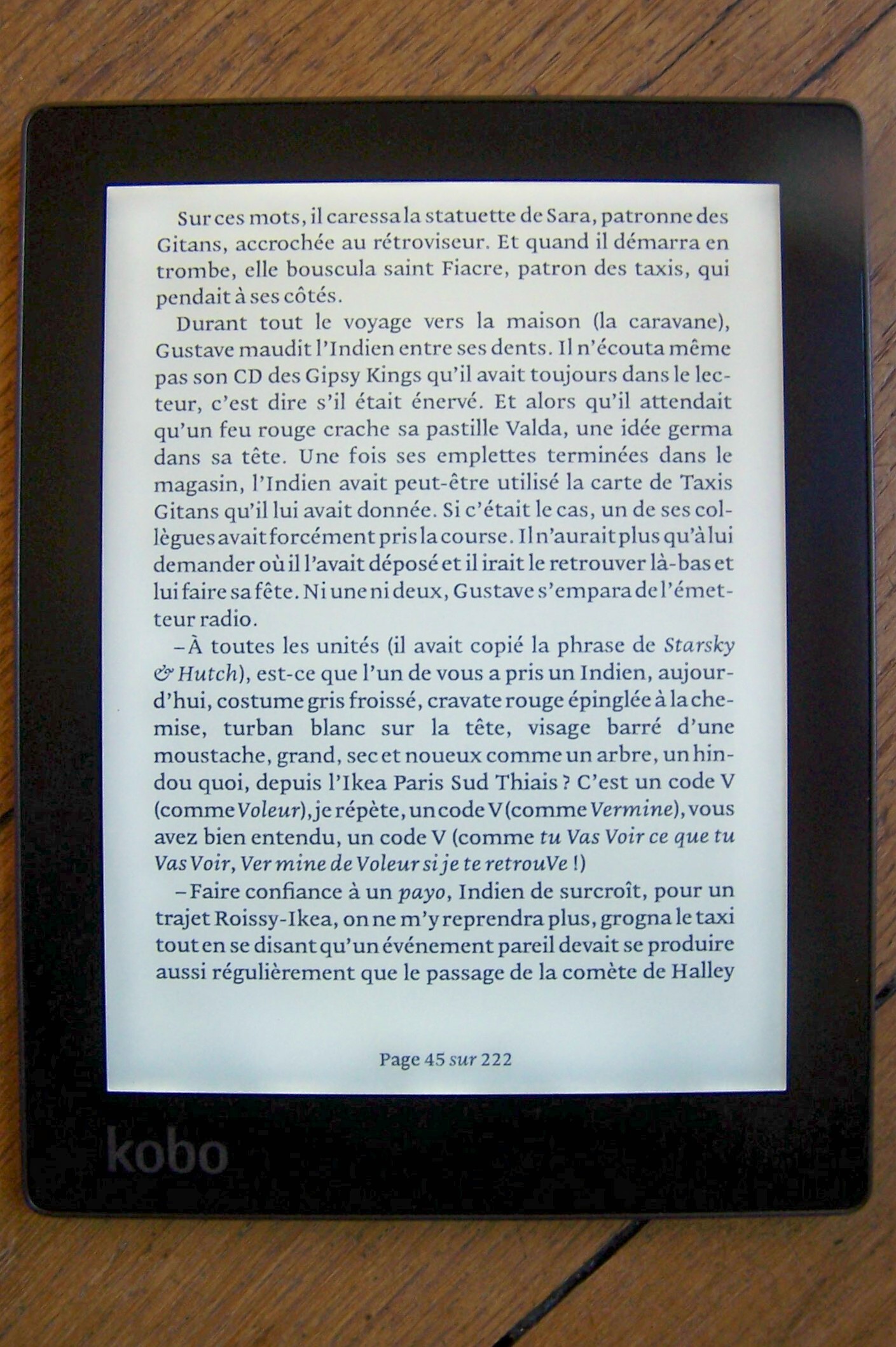Navigation: Pas grand chose de nouveau par rapport à l'interface que Kobo avait modifié au printemps. Allumage rapide, 20 secondes à partir du mode éteint, 2 secondes seulement à partir du mode veille que l'on privilégiera bien entendu au quotidien. On passe du mode éteint/ veille avec un temps prolongé avec le bouton orange d'allumage. On n'appuie pas sur ce bouton, on le tire légèrement sur la droite. Kobo avait revu son écran d'accueil. Ce n'est plus l'affichage des seuls livres que l'on avait ouvert ou téléchargés en derniers mais l'ajout de tout un tas de briques. Kobo a mis en valeur les statistiques "Reading Life". Ceux ou celles qui les utilisent beaucoup seront contents de les retrouver. Pour les autres qui n'en avaient pas grand chose à faire comme moi, c'est une déception de les voir ainsi encombrer la page d'accueil. J'ai essayé de les désactiver dans les paramètres, pas trop moyen. La bonne idée serait de paramétrer sa page d'accueil, cela n'a pas avancé à ce niveau-là. Comme pour les autres modèles Kobo, on retrouvera la navigation générale. On peut créer ses propres étagères de livres en choisissant ses propres thèmes. La dalle tactile ouvre des petits détails dans l'amélioration de la navigation, plus intuitive. Hormis cela, je n'ai pas trouvé de différences fondamentales avec les anciens modèles. Un mode tactile très efficace, une très bonne rapidité des pages avec un processeur puissant. Pour le défilement des pages comme tous les Kobo, on peut frotter la surface légèrement mais aussi simplement toucher le bord droit ou gauche, un détail certes, mais très agréable à l'utilisation d'une seule main. Si on touche le milieu de la page, on accède directement à des propositions de réglages. Navigation dans le livre (table des matières, annotations, recherche, définition et traduction), avancement rapide dans les pages, changement des polices et paramètres. Toutes les annotations surlignages que vous aurez pu faire seront sauvegardées. Attention, pas d'utilisation possible de stylet. Un dictionnaire Larousse intégré quand vous laissez votre doigt sur un mot sélectionné. Il y a aussi des dictionnaires de traduction intégrés. Onze polices au total ont été embarquées, les meilleures étant Amasis, Caecilia et Malabar, mais il est aussi possible d'en télécharger d'autres dans un dossier fonts. Taille des polices, interlignage, marge et justification se règlent avec des barres de défilement, bien pensées. Vous pouvez revenir à tout moment sur le document par défaut qu'aura choisi l'éditeur. On retrouve la qualité des petits réglages typographiques (marges, interlignage, fonctions avancées pour contrôler la graisse du caractère avec une prévisualisation). Elle reste néanmoins toujours imparfaite, beaucoup de livres achetés étant bloqués dans les choix de marges, d'interlignage. Comme d'habitude, le Kobo n'a pas complètement la main comme sur l'interface du Nook qui reste toujours la référence dans le domaine à mon avis. Le Kobo Aura est très véloce, le processeur rapide remplit parfaitement son rôle. On peut regretter l'absence d'un petit sablier quand le Kobo travaille, cela éviterait des impatiences pour ceux qui sont habitués à la réactivité des smartphones et des tablettes.