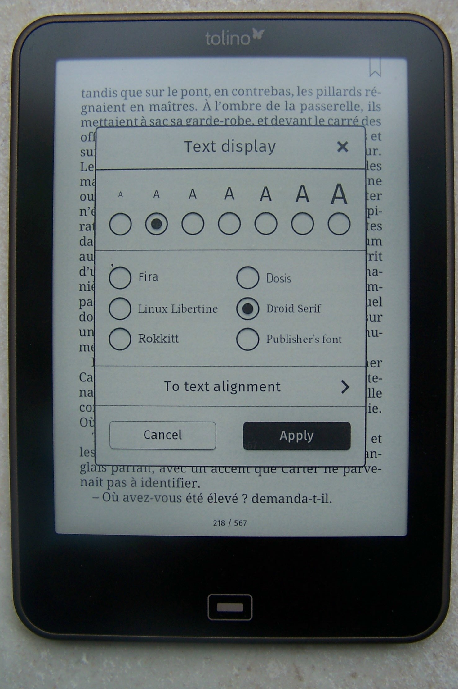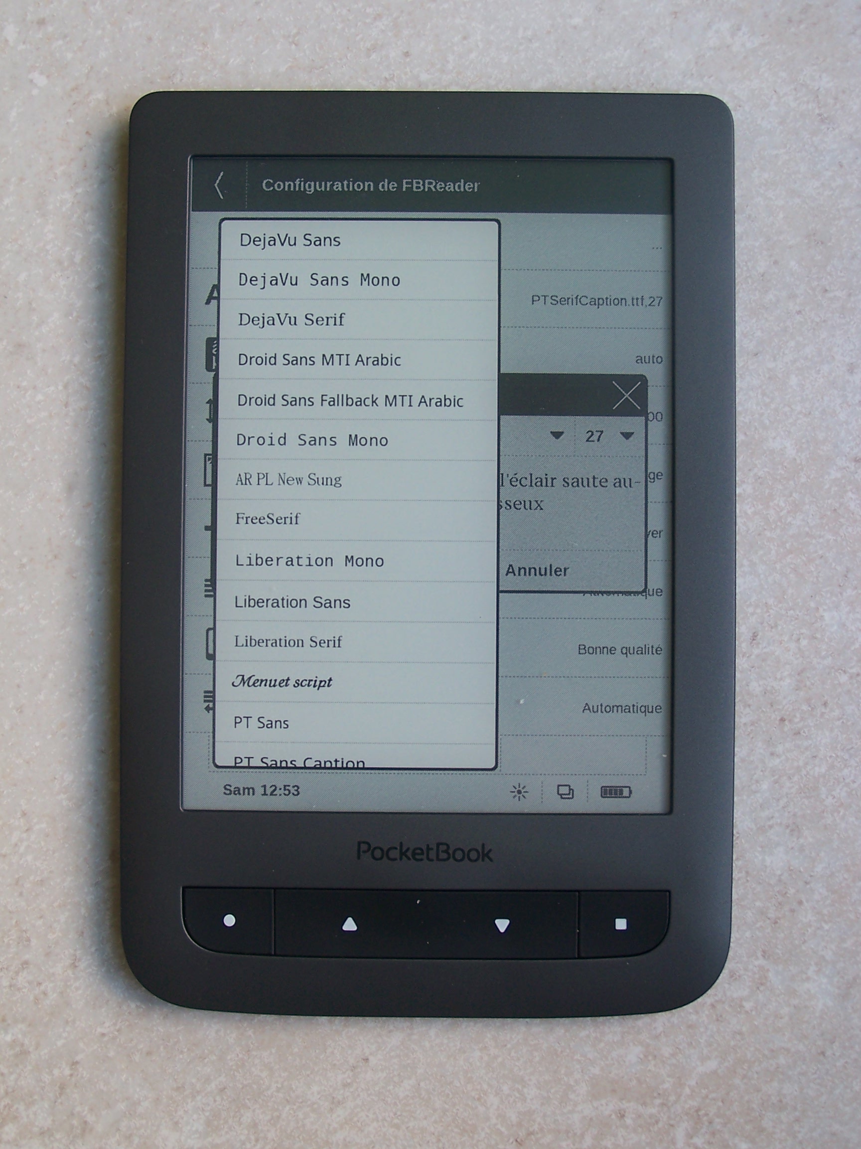 On peut rajouter toutes les polices qu'on veut en les mettant dans le dossier "system/fonts" (elles sont disponibles pour les menus de la liseuse et FBreader).