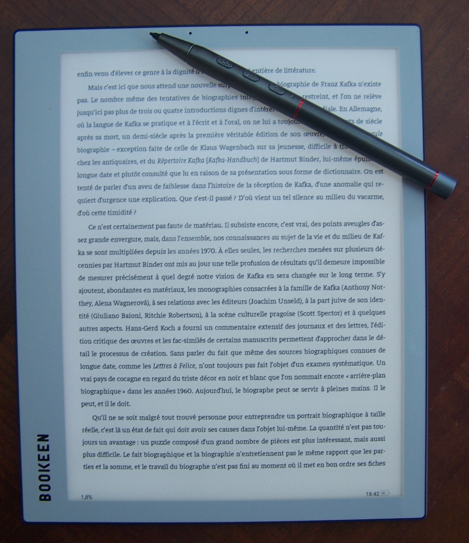 PDF: un grand écran c'est bien évidemment l'ouverture vers la lecture de fichiers PDF. J'ai essayé beaucoup de choses, toujours très satisfaisant. On repère assez vite tous les modes proposés selon les documents. Affichage pleine page ou pleine largeur, suppression des marges automatique ou manuelle, lecture par colonnes ou même reformatage complet en reflowable. Le processeur amélioré apporte un plus, tous les résultats sont bons, notamment pour les gros rapports, études, thèses, etc. Idéalement en homothétique pour des documents originaux jusqu'à 16x24cm environ. Le 7.8 pouces a bien sûr ses limites. Vous regarderez du côté de la lecture en mode paysage en fractionnant les pages. Cela donne quand même beaucoup de possibilités.